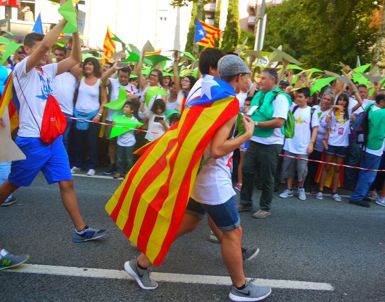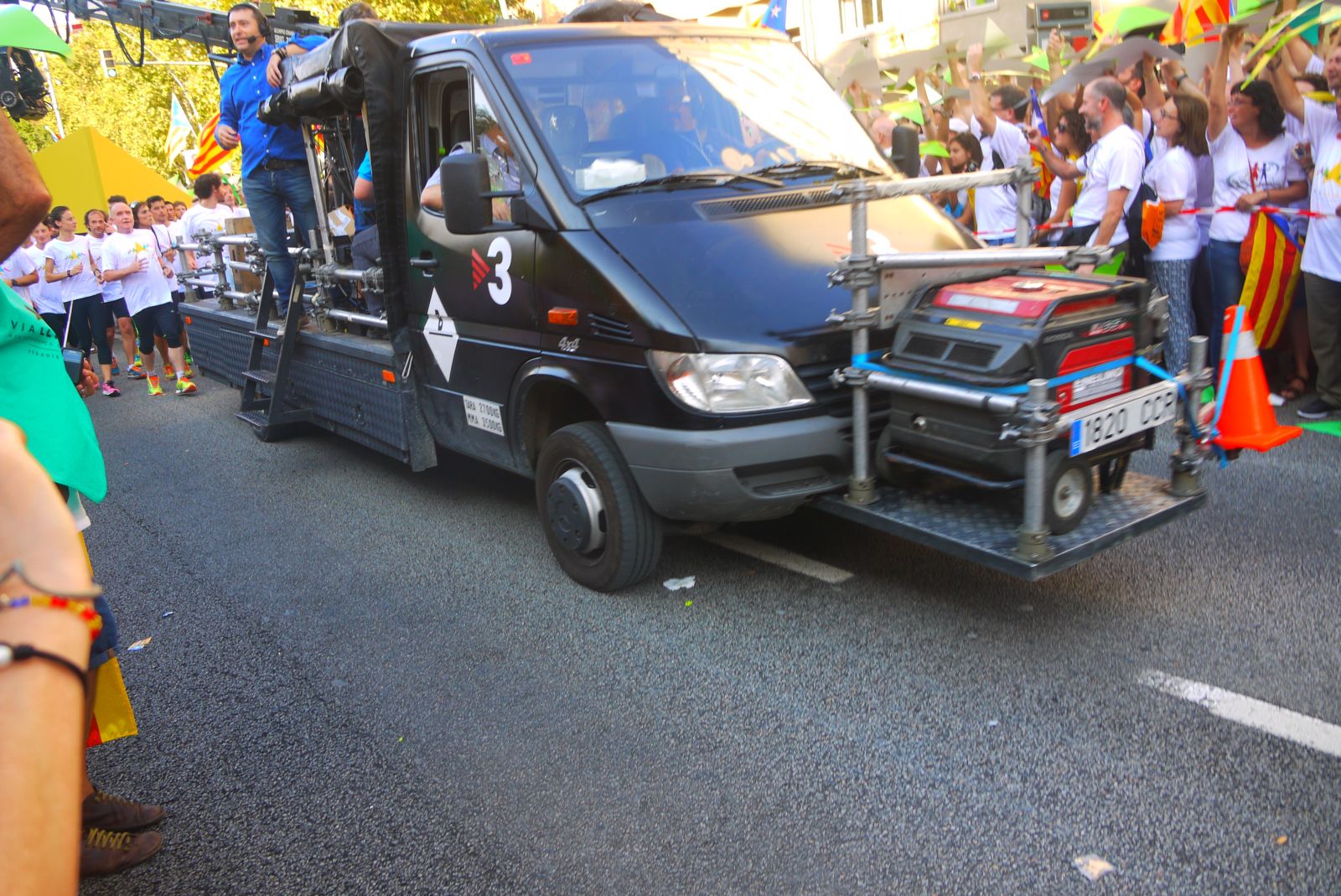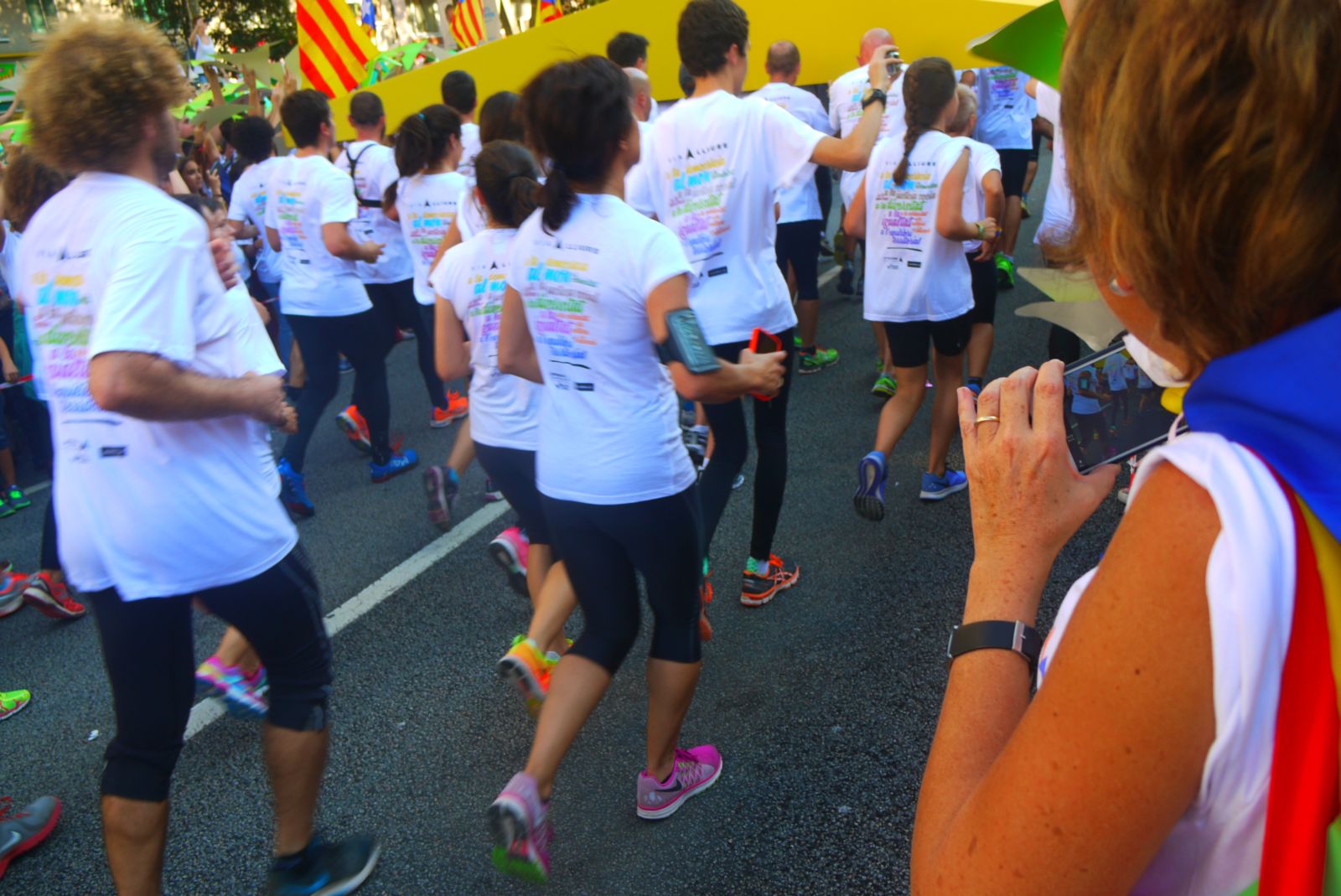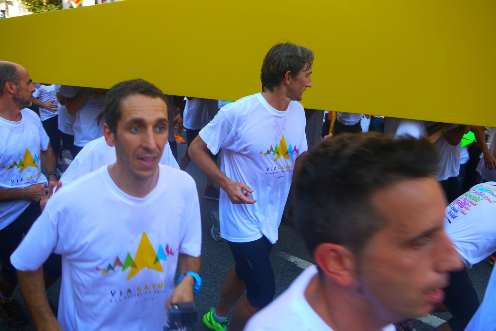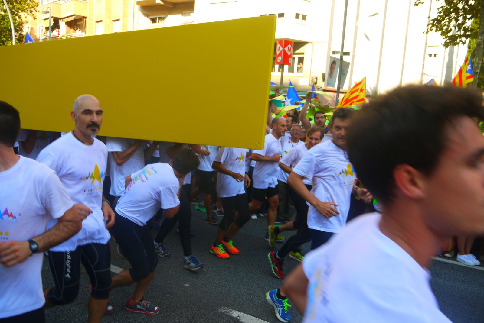 La Via Lliure va ocupar més de cinc quilòmetres de l’avinguda Meridiana. Els assistents vam formar un enorme mosaic blanc amb les samarretes blanques. La Via tenia un carril central obert que és per on va avançar el punter gegant. A mesura que passava aquest punter tothom aixecava el seu punter amb el color que li tocava segons el tram que ocupava. El mosaic, que fins aleshores es veia blanc, s’anava omplint amb els colors dels eixos de la República Catalana.