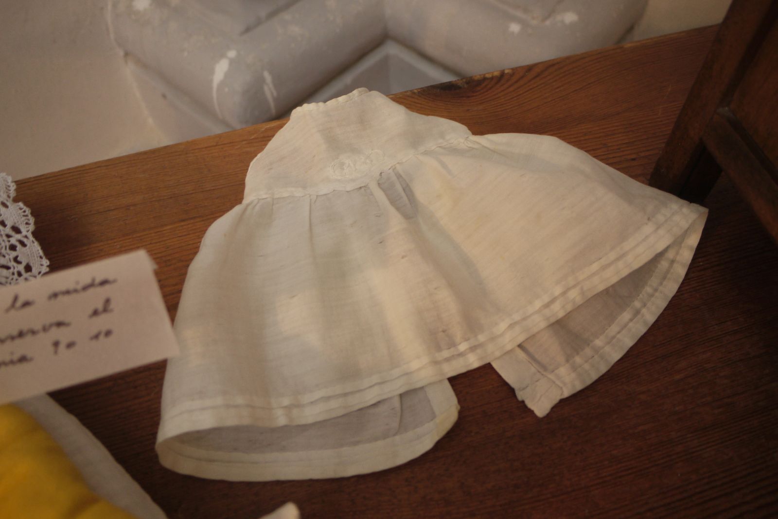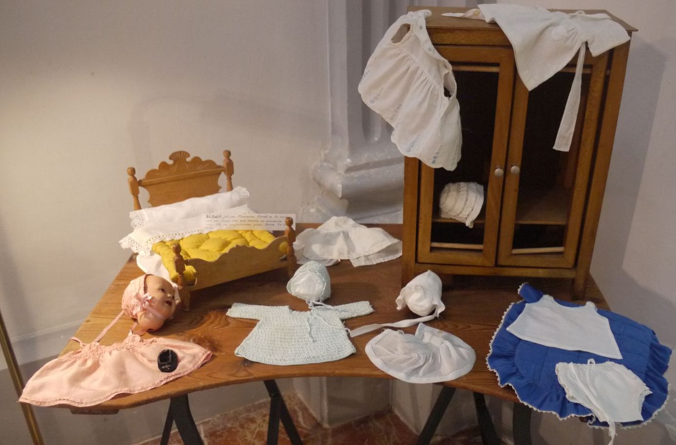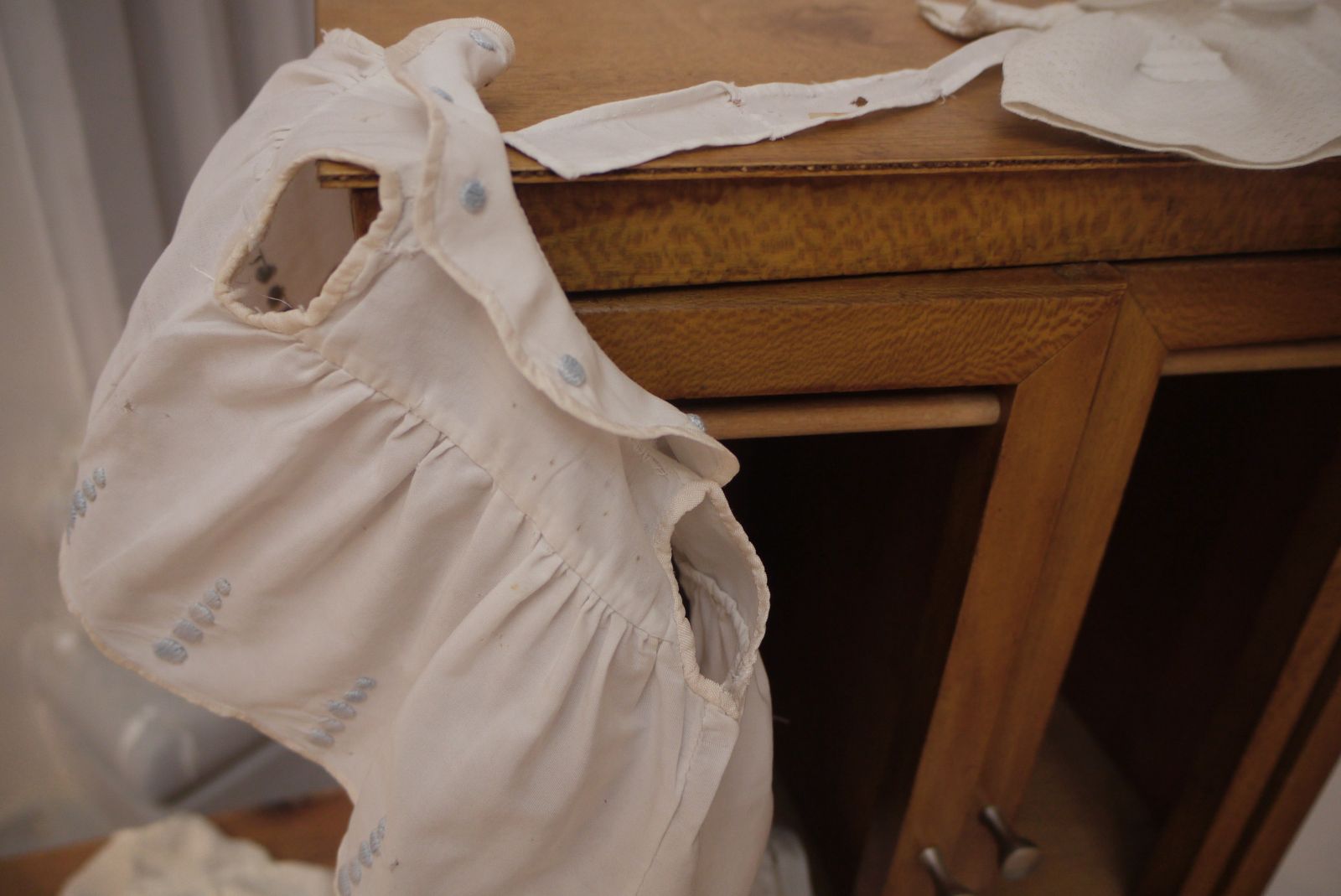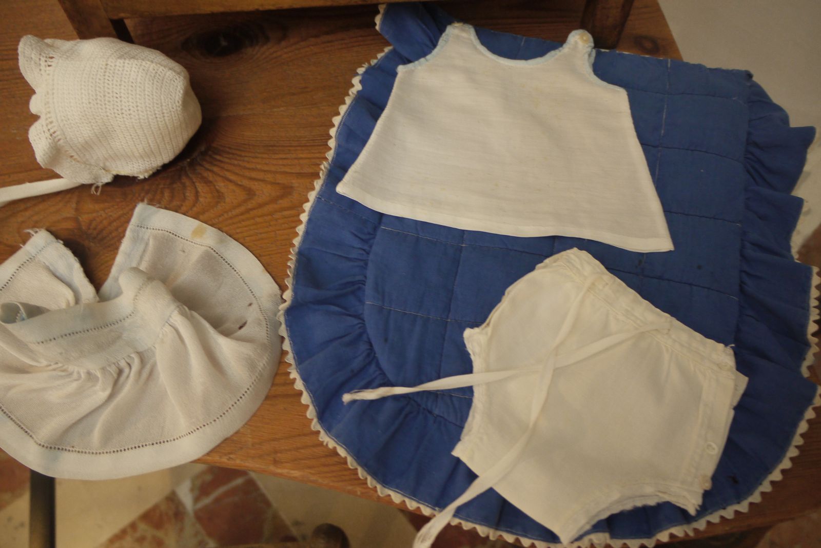 Amb una fusta de cosir i un parell de cavallets vaig preparar un espai per posar la roba de nino que Ramoneta Bonet havia cosit amb tant encert. Només tenia 9 o 10 anys quan va realitzar aquestes peces tan ben elaborades.