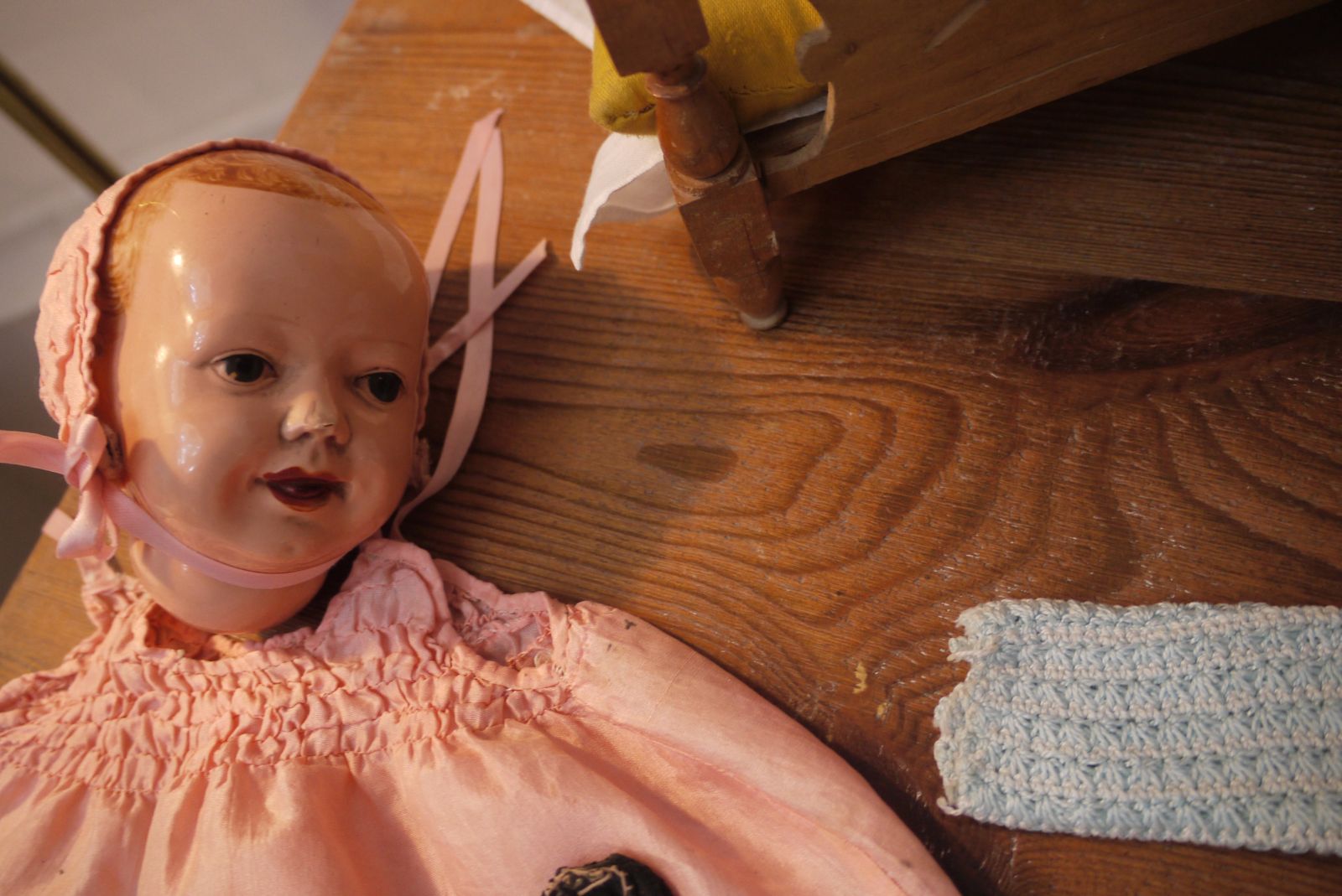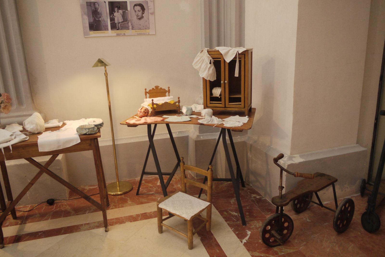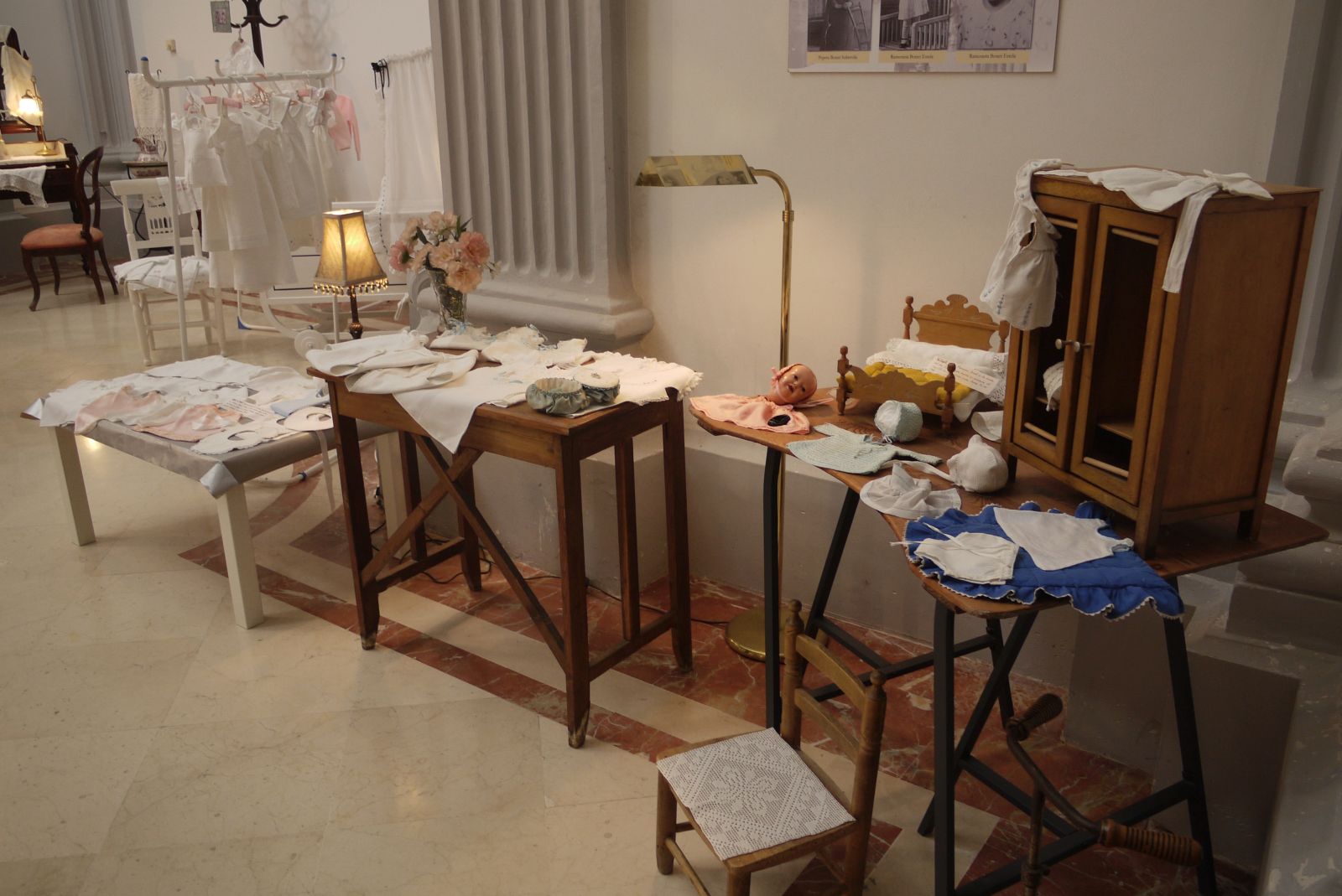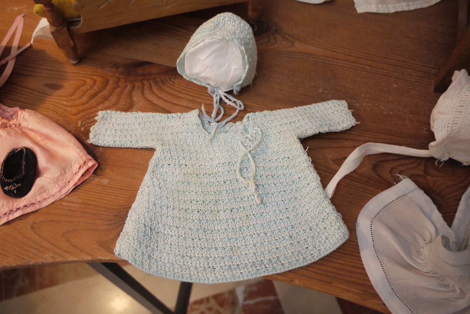 Amb una fusta de cosir i un parell de cavallets vaig preparar un espai per posar la roba de nino que Ramoneta Bonet havia cosit amb tant encert. Només tenia 9 o 10 anys quan va realitzar aquestes peces tan ben elaborades.