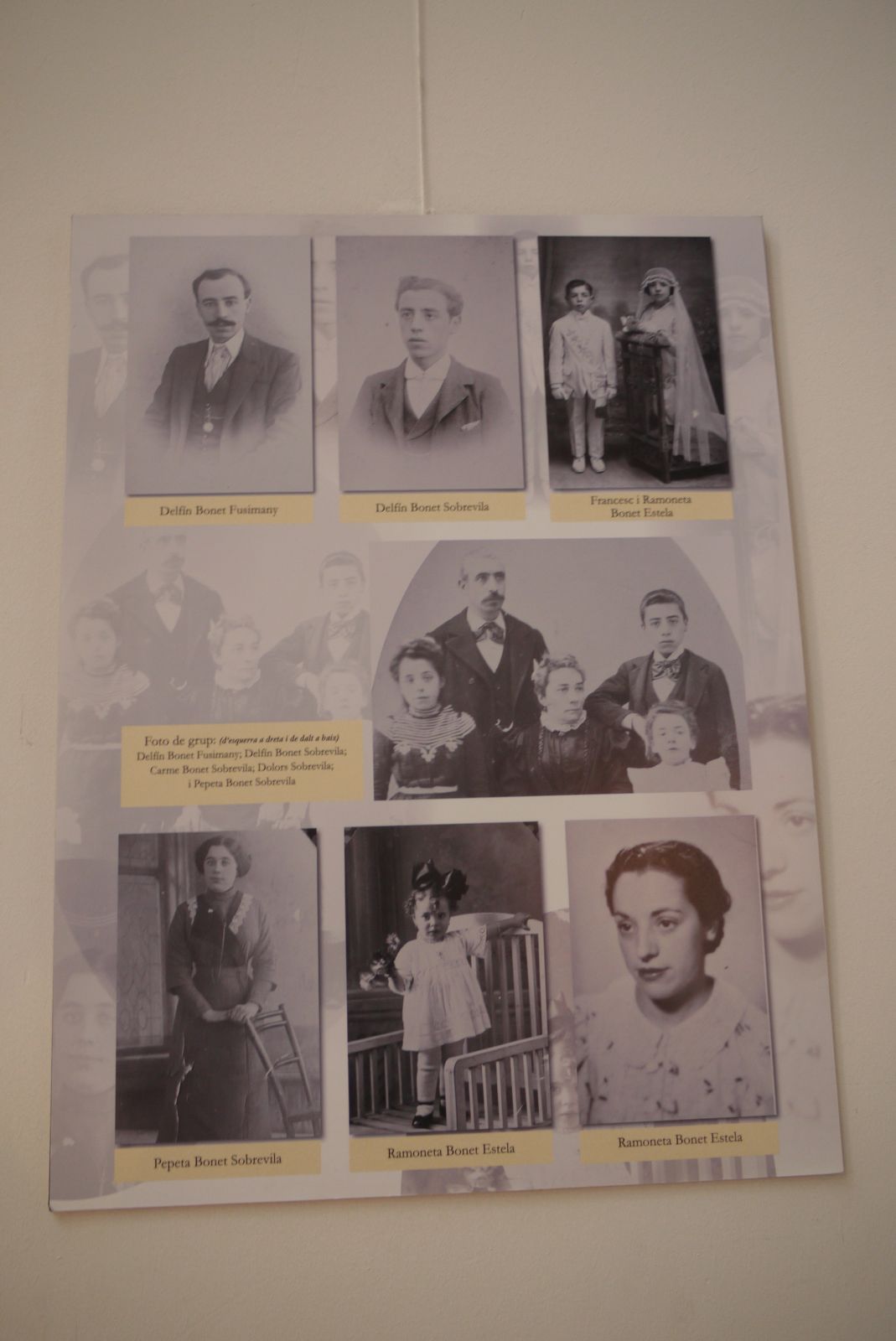 La nena vestida de blanc a la fotografia de grup és Pepeta o Josefa Bonet Sobrevila, una tia àvia meva, de la que hi ha abundant material seu en aquesta exposició i que va morir molt jove, de tifus. És la noia que veieu a baix a mà esquerra.