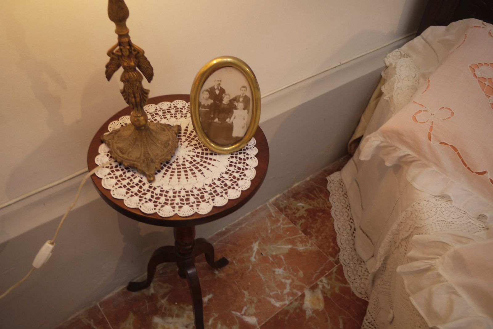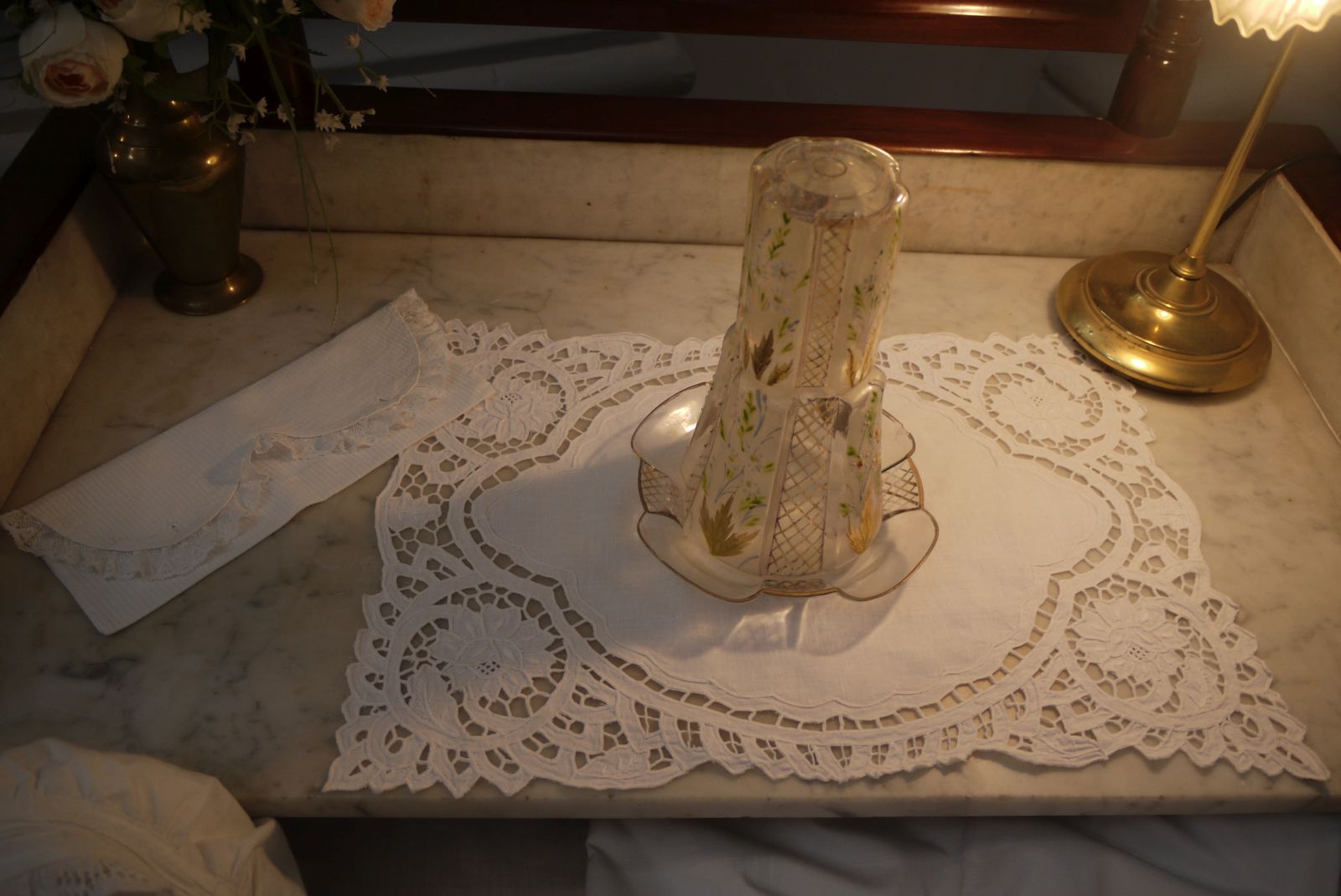 Damunt el tocador, un tapete embellit amb un treball anomenat Richelieu, contrasta amb aquest recipient de vidre pintat. Funcionava com a ampolla d’aigua amb la part superior que servia com a vas. A l’esquerra s’hi veu una bosseta per guardar les pintes.