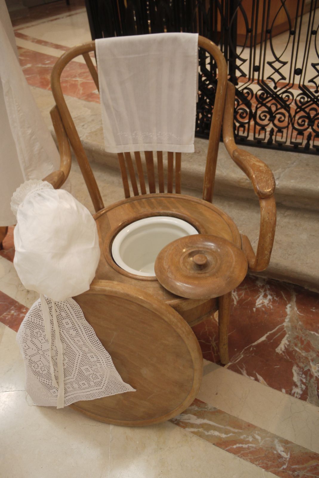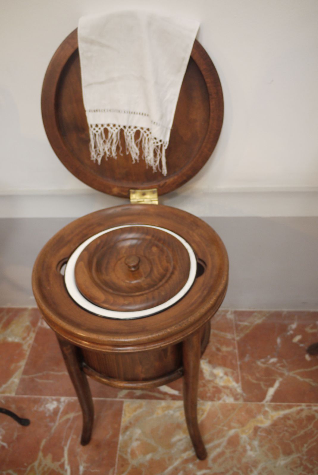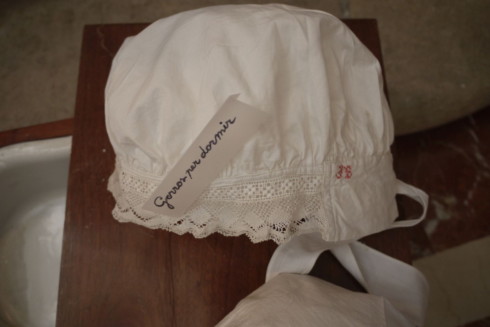 Damunt un estri que funcionava com a bidet es pot veure un gorro de dormir, marcat, com tota la roba, amb les inicials de la seva propietària: Pepeta Sobrevila.