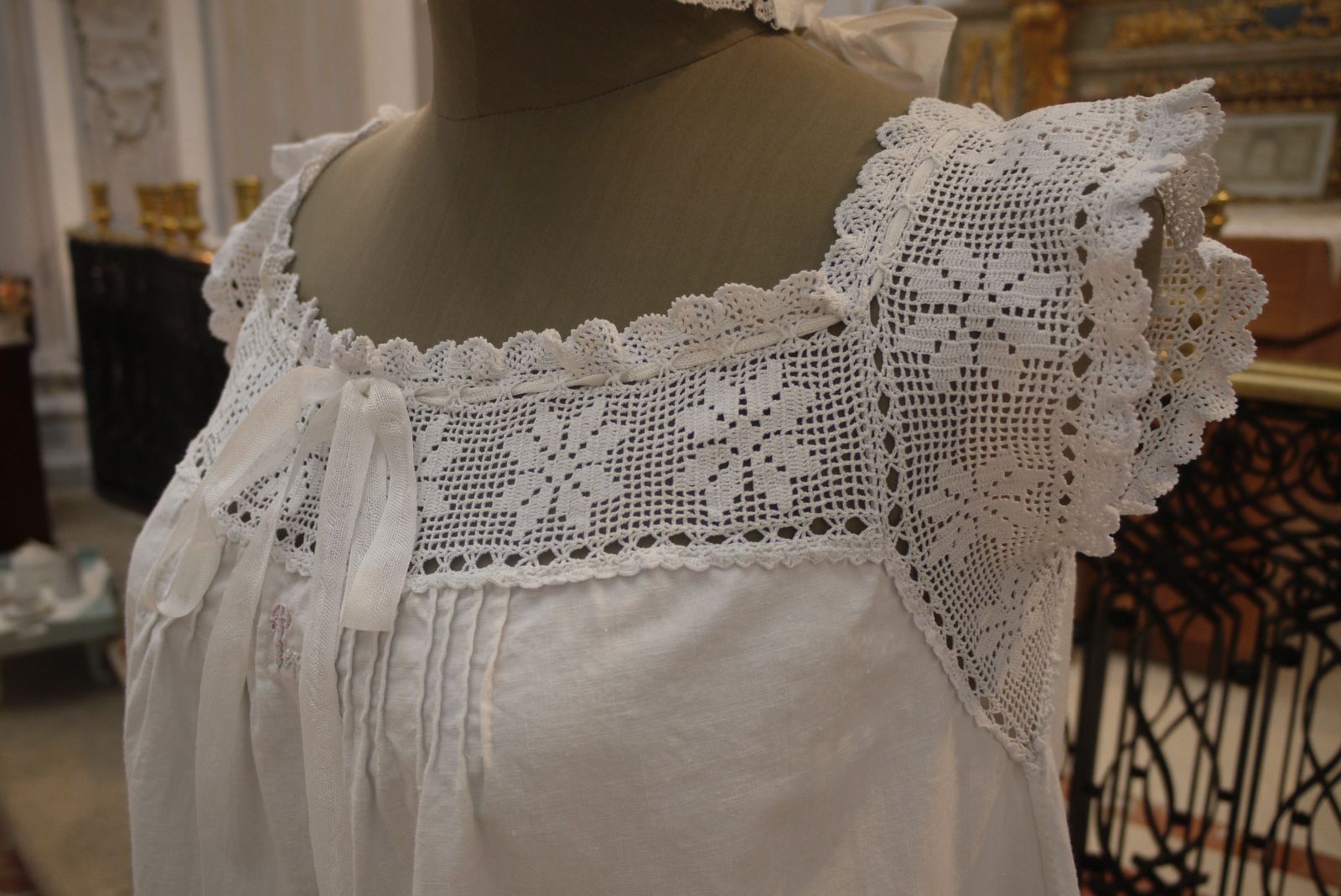Camisa i gorro de dormir de Josefa Bonet Sobrevila. Al fons, damunt el mirall del tocador, s’hi pot endevinar un pentinador que era com una capeta que es posava a les espatlles per no embrutar-se al moment de pentinar-se.