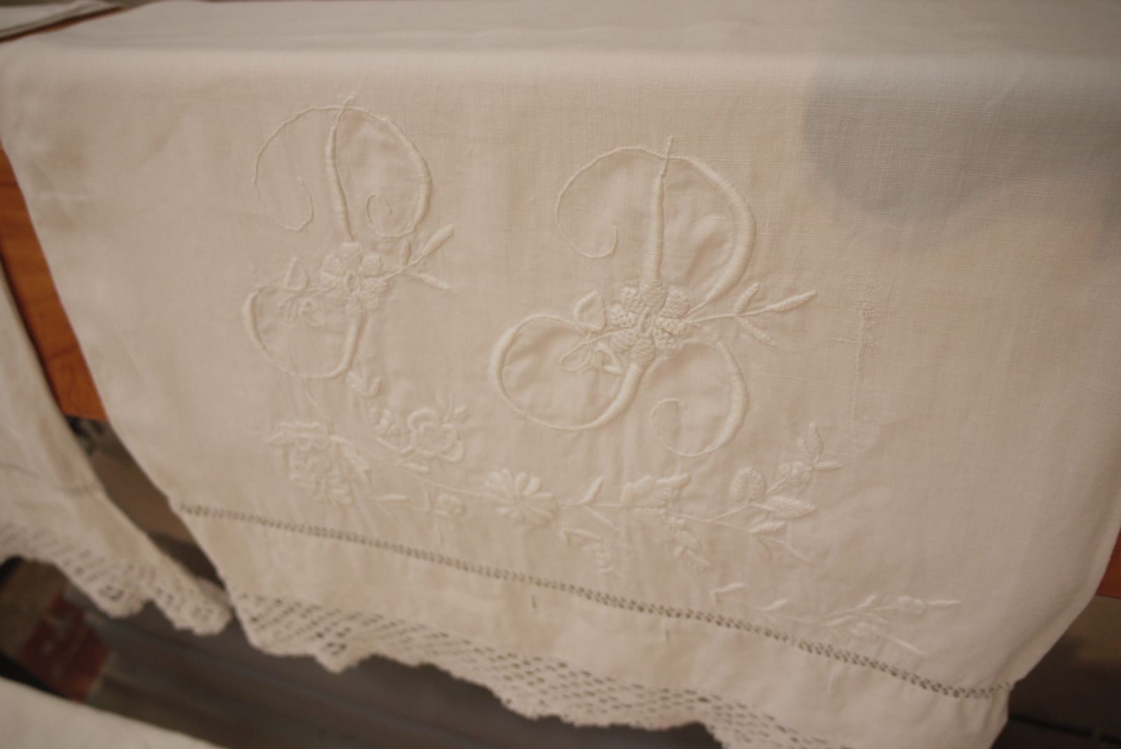 Llençol de fil amb brodats i puntes que formava part de l’aixovar de Pepeta Bonet.