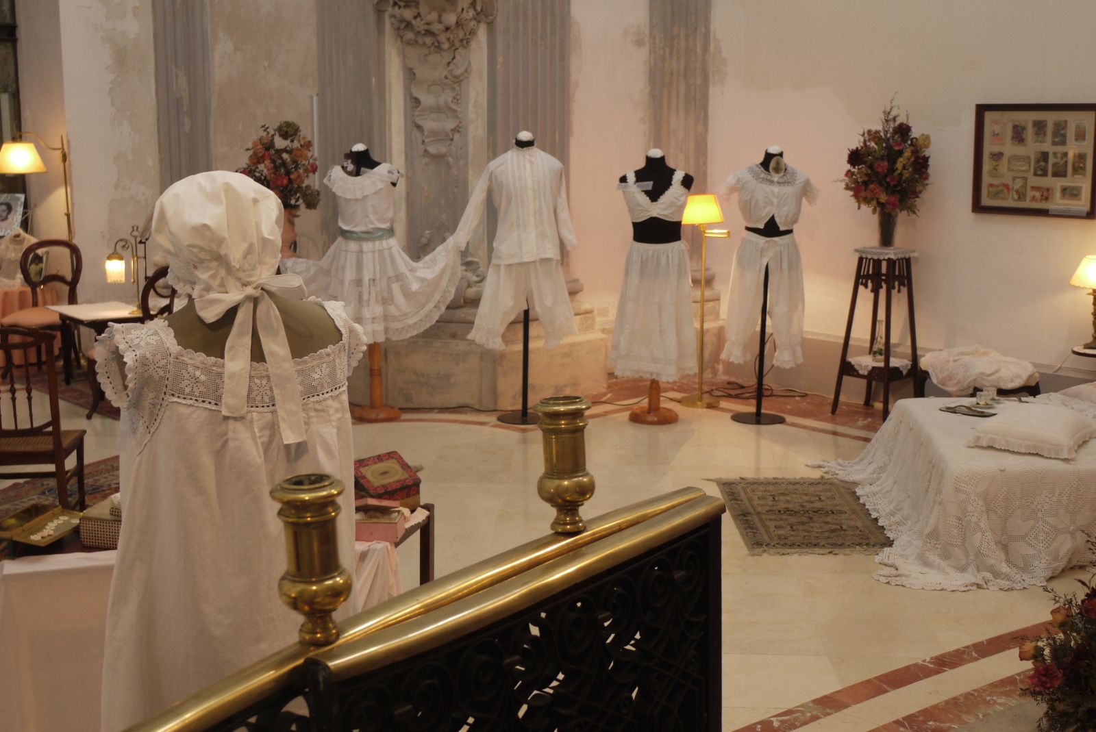 Gorro de dormir, vist des de darrere, acompanyat de la camisa de dormir. Al fons, les tres peces de roba interior abans esmentades que formaven part de l’aixovar de la jove Pepeta/Josefa Bonet que, dissortadament morí en la flor de la joventut a principis del segle XX.