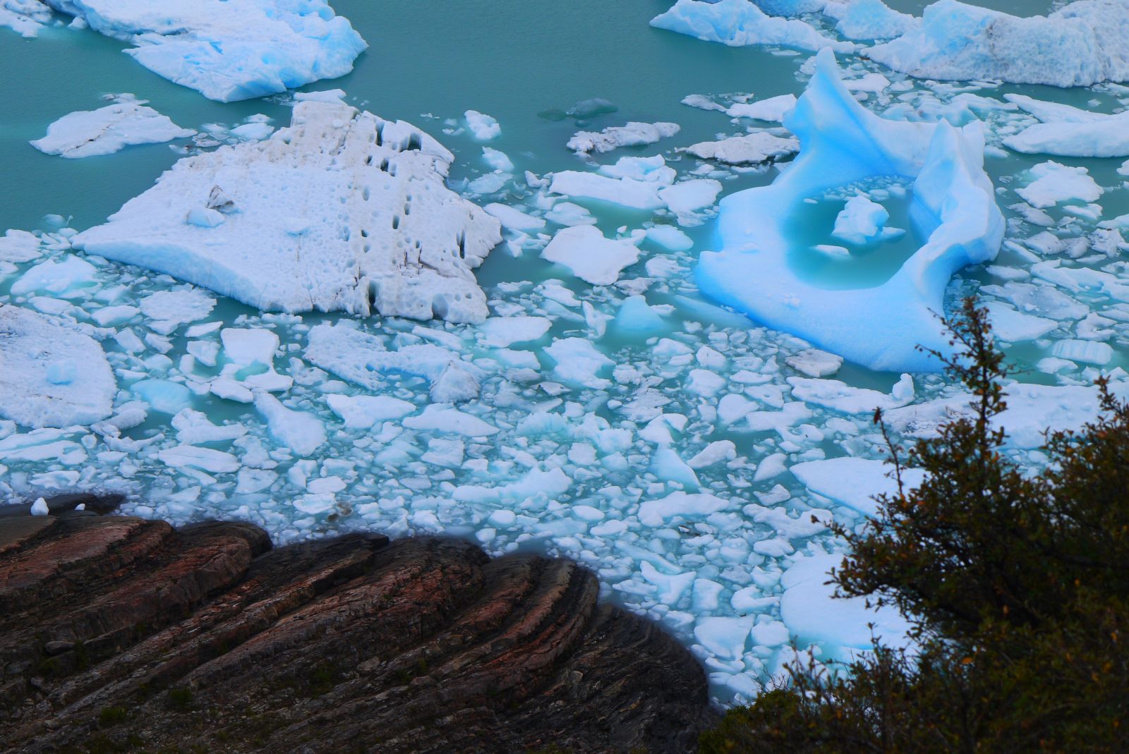 Aquestes restes són d’un trencament i ja s’han escampat. Si el trencament puja del gel que hi ha amagat sota l’aigua resulta encara més espectacular ja que surt disparat enlaire. La primera vegada que vaig visitar el Perito Moreno era al gener, mes de màxima calor a l’Argentina, que es quan la glacera no para d’escopir gel i vaig veure diferents trencaments d’aquests, del gel soterrat dins el llac Argentino.