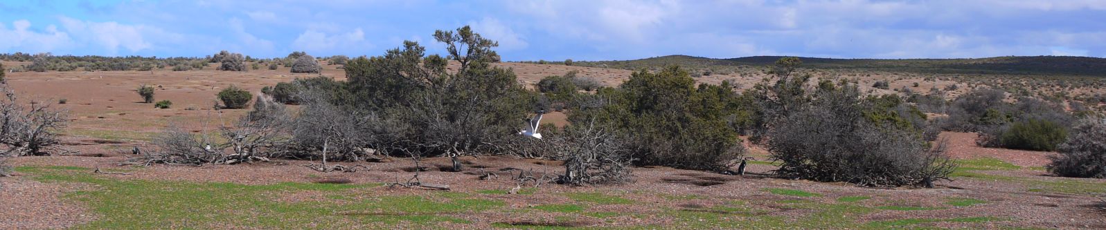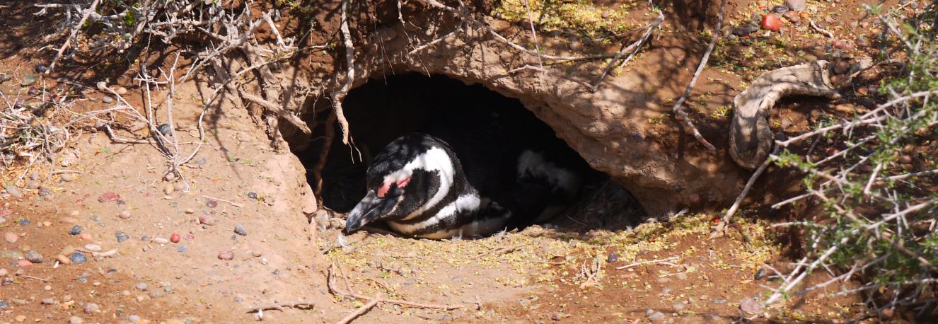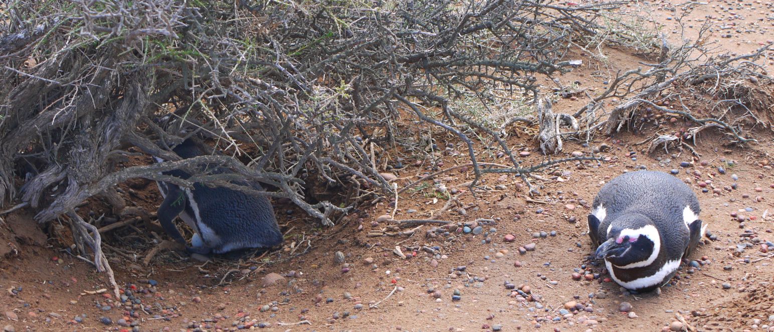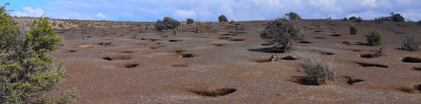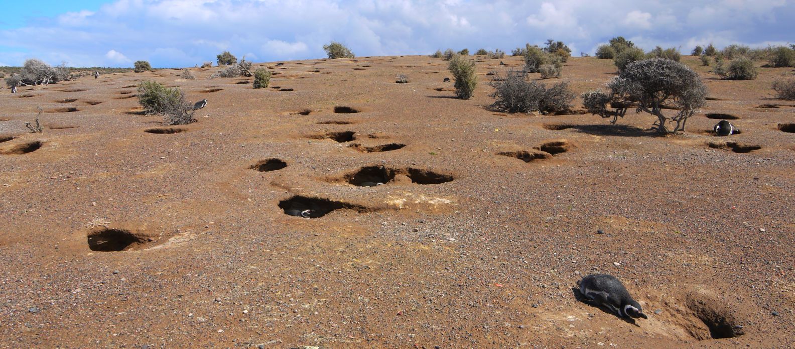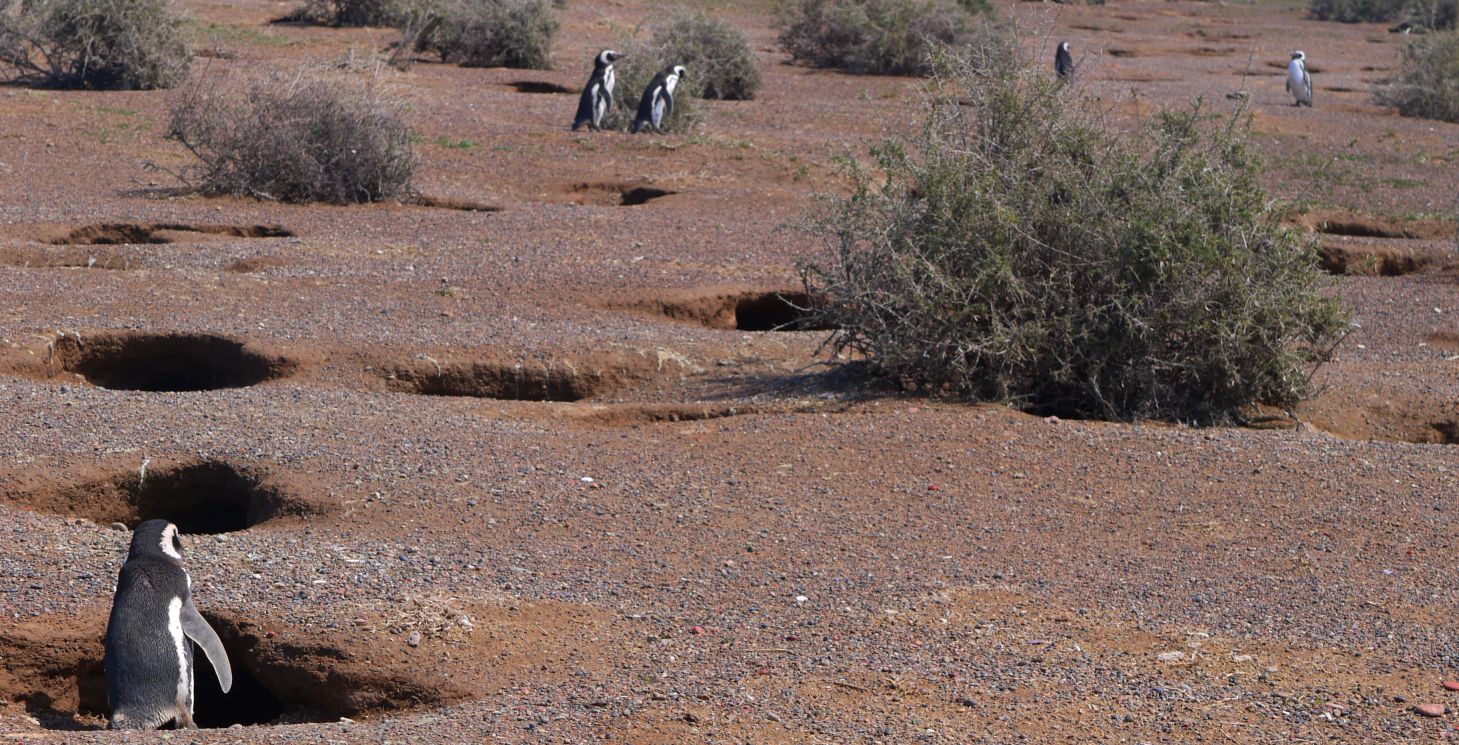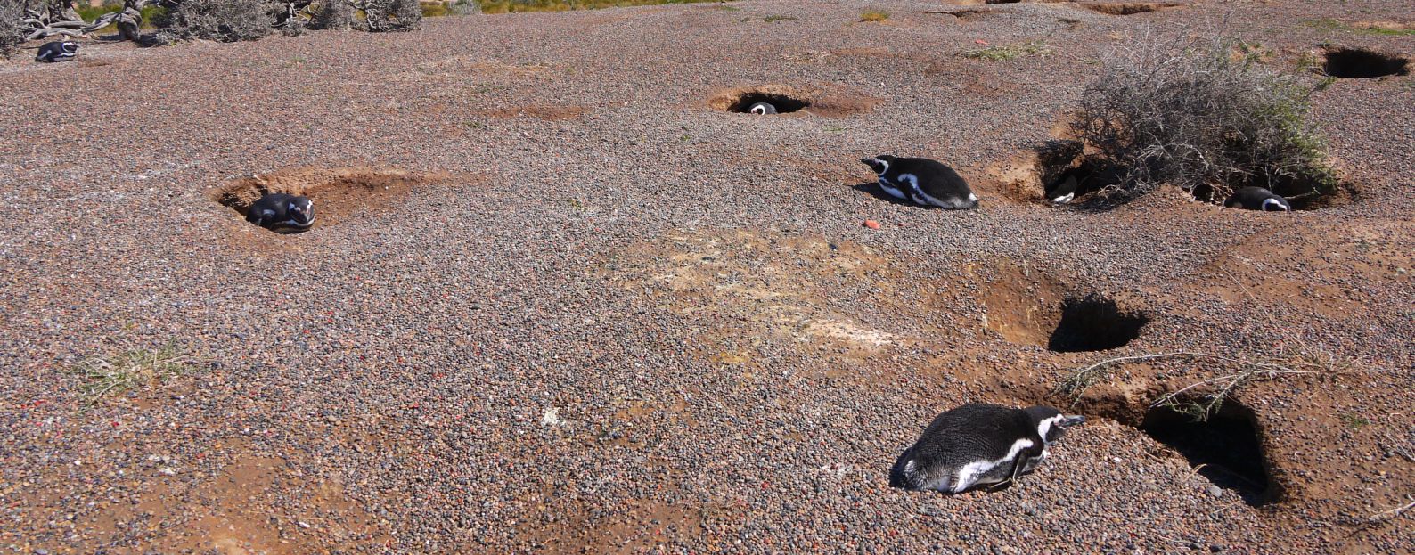 El vast terreny està farcit de clots, que són els seus nius. Cada parella s’apropia d’un i allí, un cop la femella ha fet la posta dels ous, esperen el naixement de les cries. Sempre es veuen per parelles i, si n’hi ha un de sol, és que l’altre ha anat al mar per obtenir aliment.