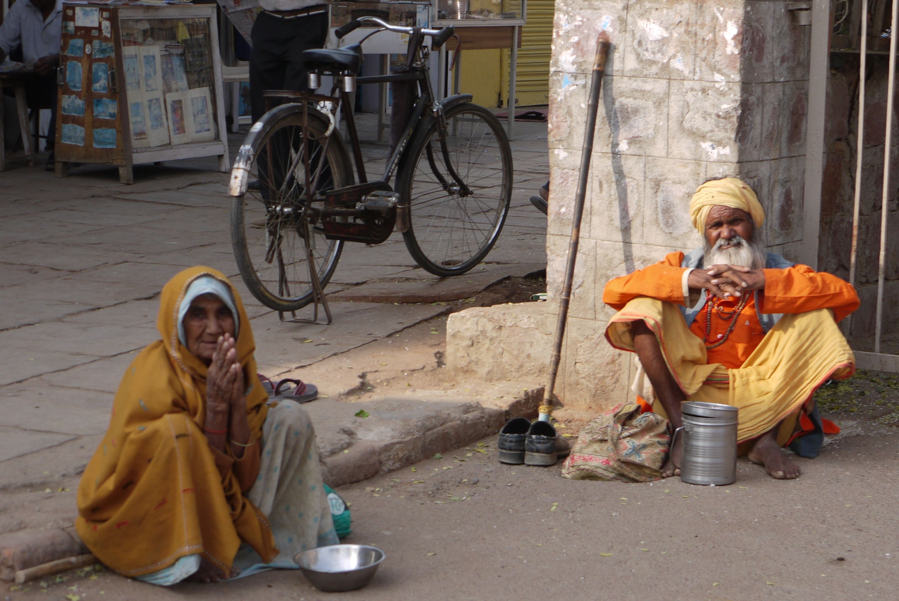 Gent que demana. Alguns, com el senyor amb aquesta vestimenta especial ha fet una aposta de vida bolcada amb la pobresa. Van amb aquest potet d’alumini per posar-hi les almoïnes ja que viuen del que els hi dóna la gent
