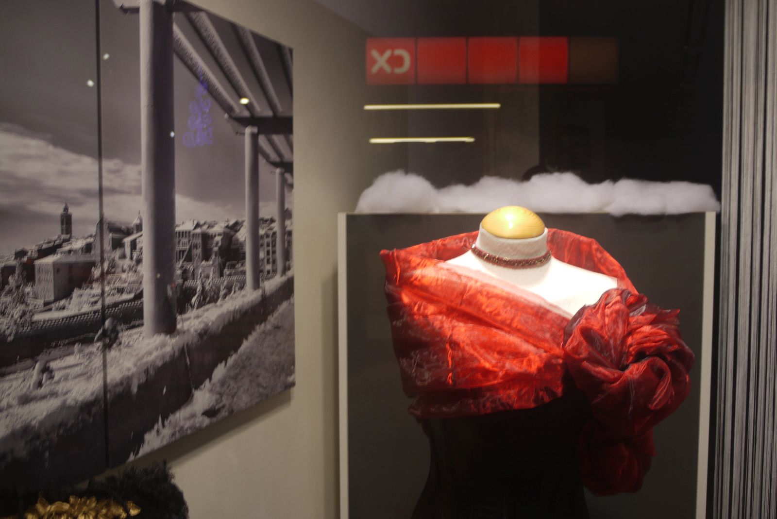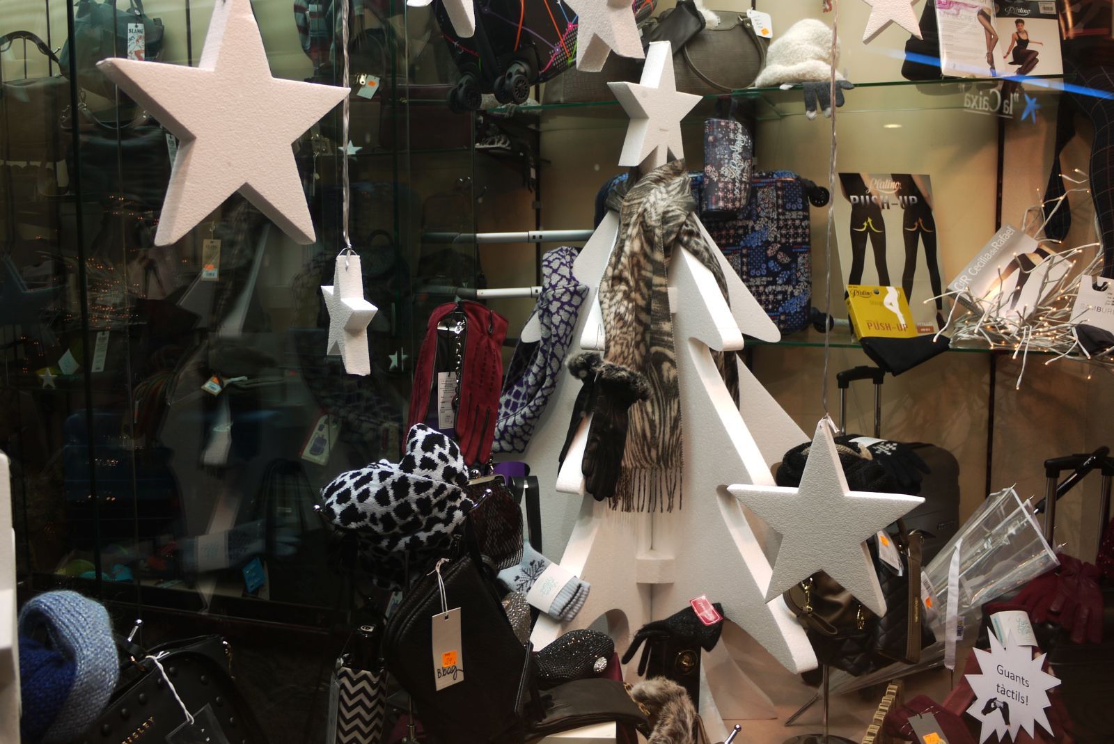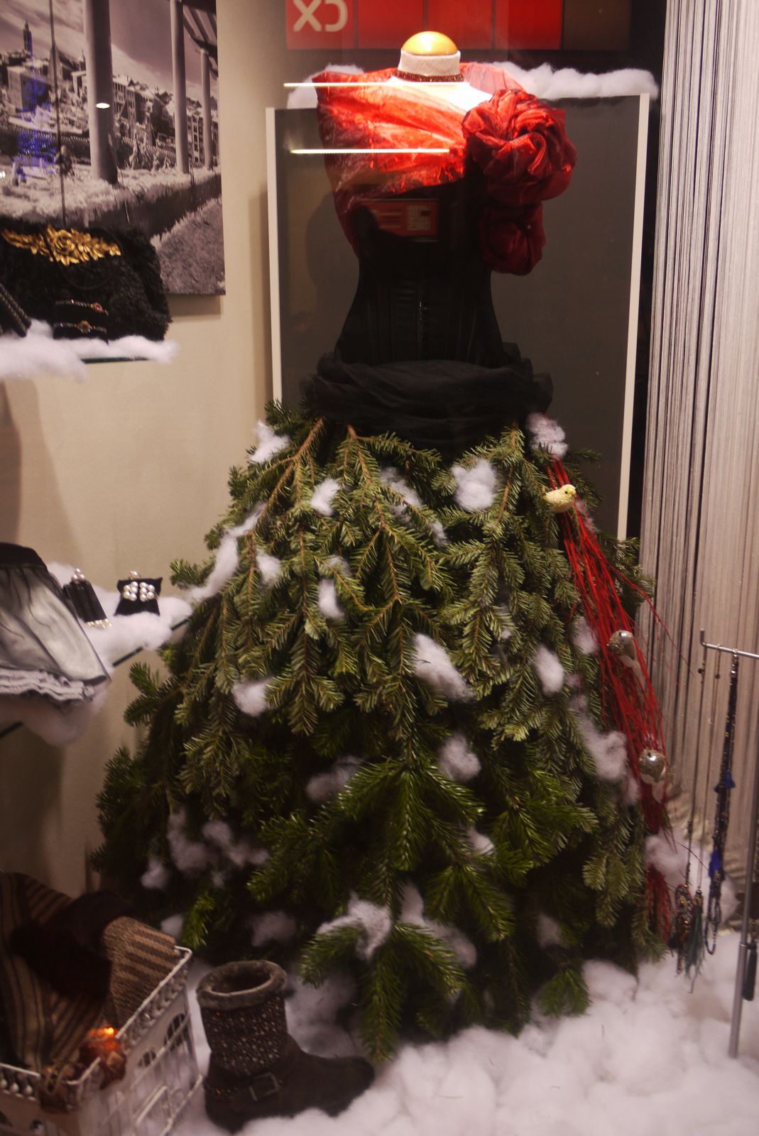 Aquesta faldilla reconvertida en arbre de Nadal o tal volta un arbre fent la funció de faldilla, resulta una presentació ideal. A més, els flocs de neu, enyorats aquest hivern, li donen el toc de fred tan propi d’aquestes festes. Els tocs de vermell, al xal i a la faldilla, són un contrapunt perfecte per acabar d’arrodonir l’estètica d’aquest aparador.