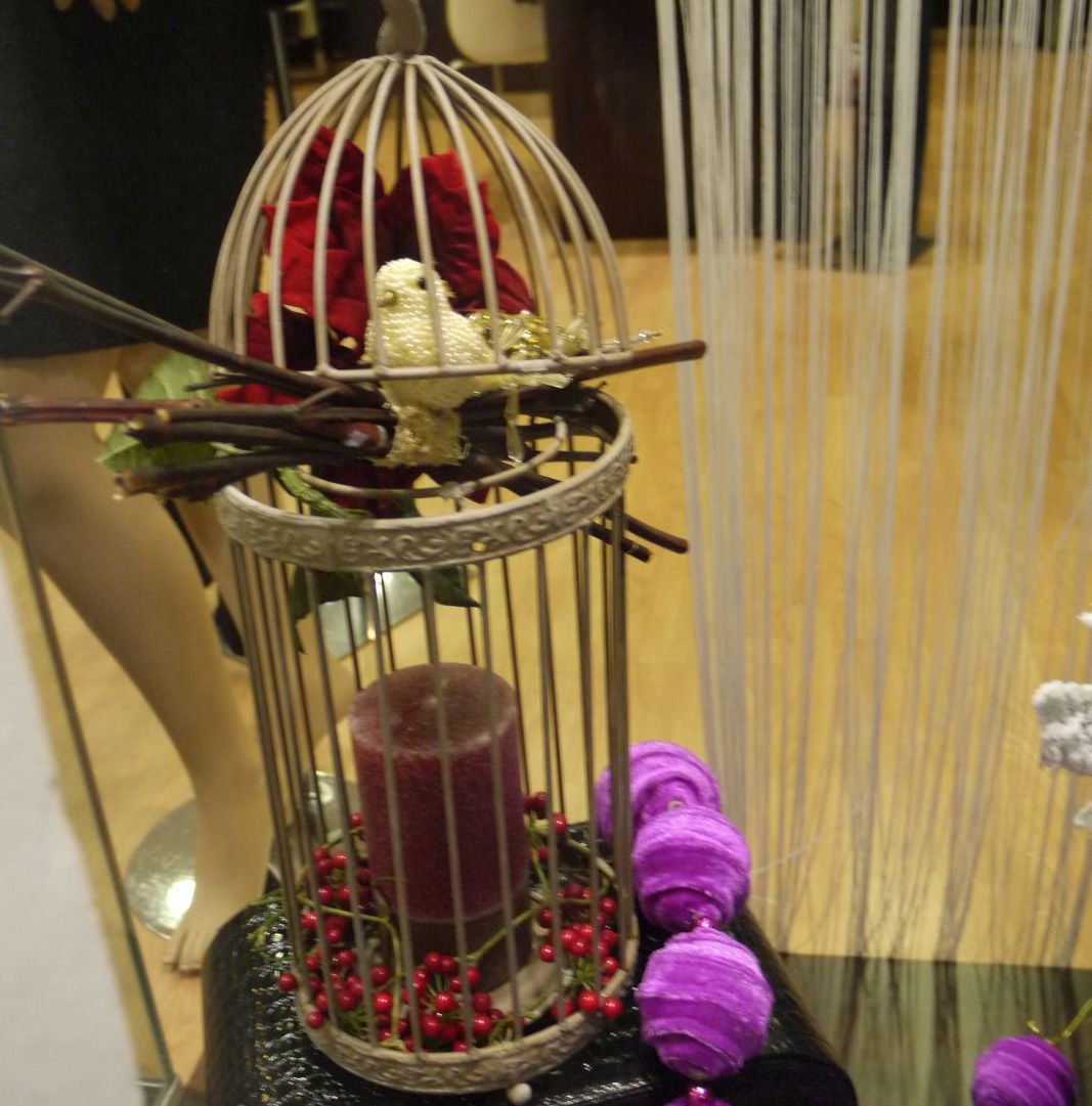 Crida l’atenció aquest bonic detall que completa la decoració d’aquest aparador: una delicada gàbia que conté un ocellet joia.