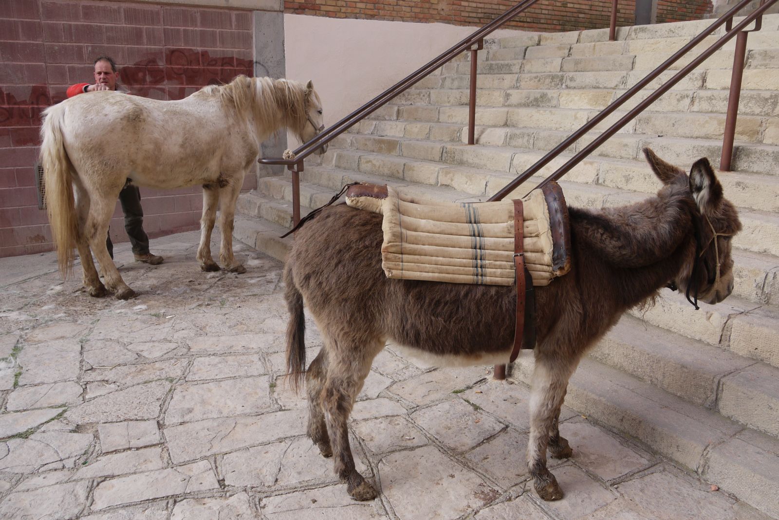 Aquí podeu veure el cavall blanc que embelleix tot un conjunt d’escenes i l’entranyable ruquet, la Vireta, que entra amb Jesús a Jerusalem el diumenge de rams. Els estan preparant els seus cuidadors. El Josep Mas no es veu però és qui tenia cura del petit.
