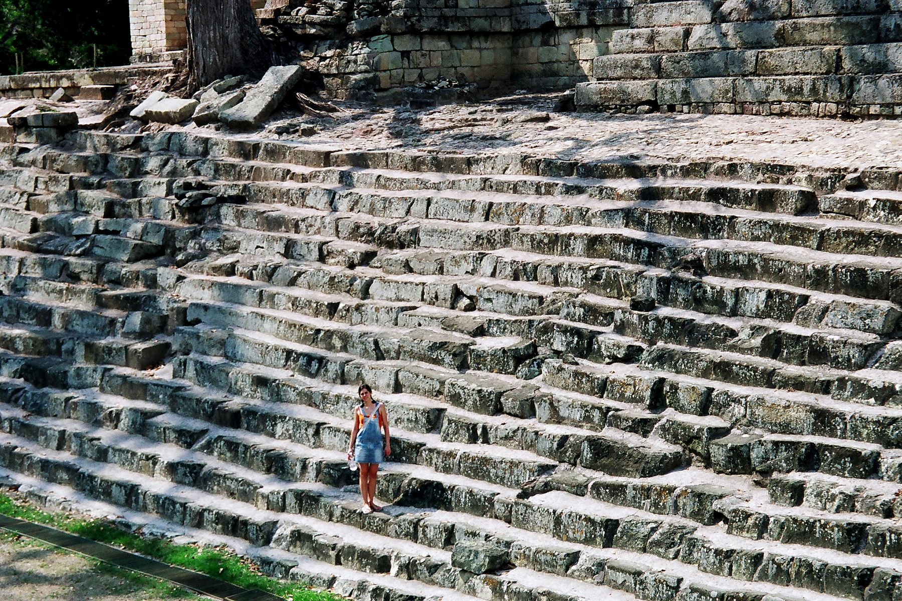 Copan. Hondures. Magnífica escalinata d’un dels temples d’aquesta importantíssima zona arqueològica. La referència amb la mida de la persona dóna fe de la majestuositat de la construcció.