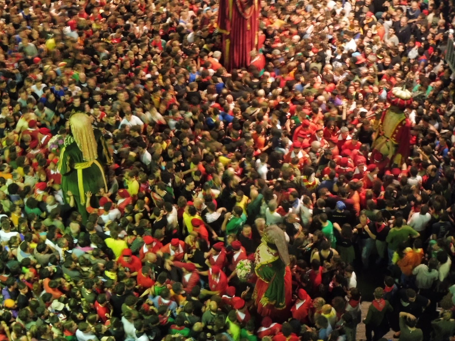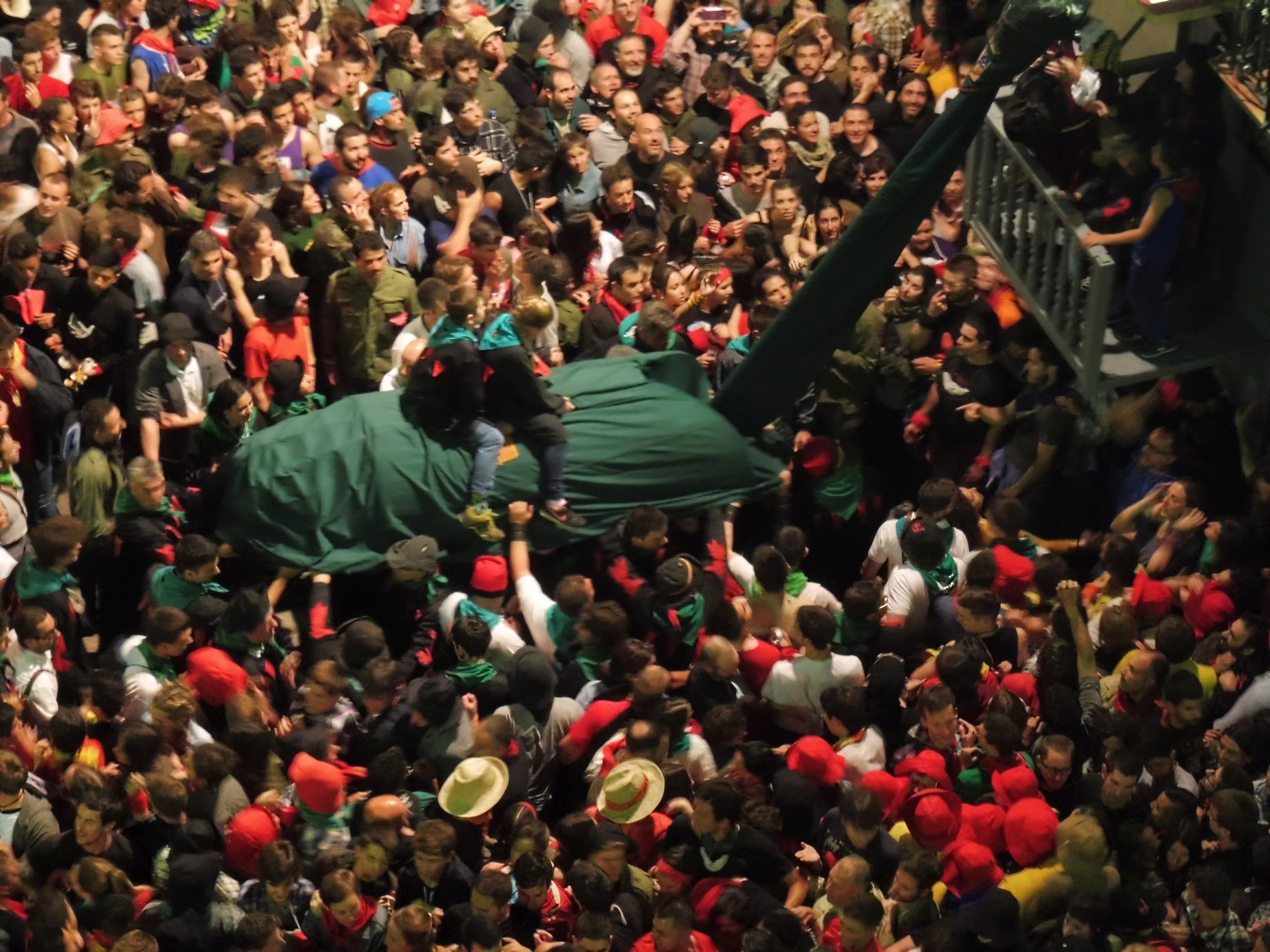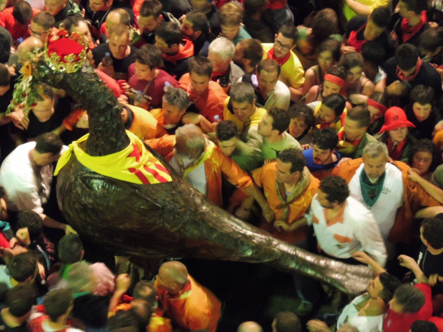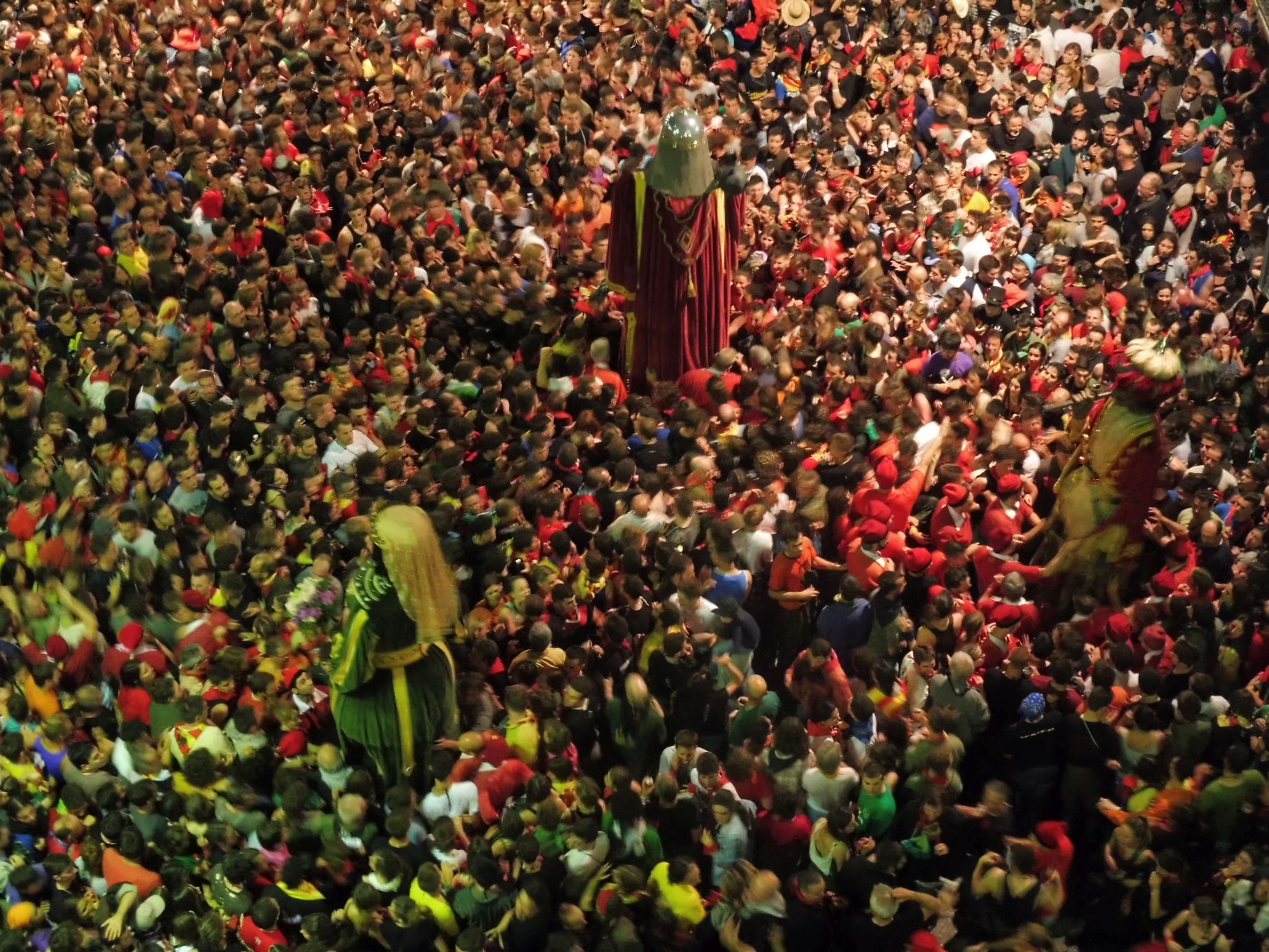 En acabar i ja a la plaça la perspectiva canvia. Els gegants se’n van a descansar ja que sempre la Patum es repeteix dues vegades. És la tradició.