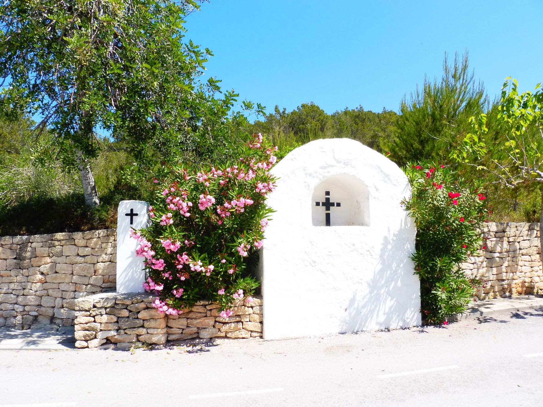 Petites construccions, en aquest cas, un via crucis segueixen mostrant aquesta bellísima barreja de pedra, vegetació i emblanquinat.