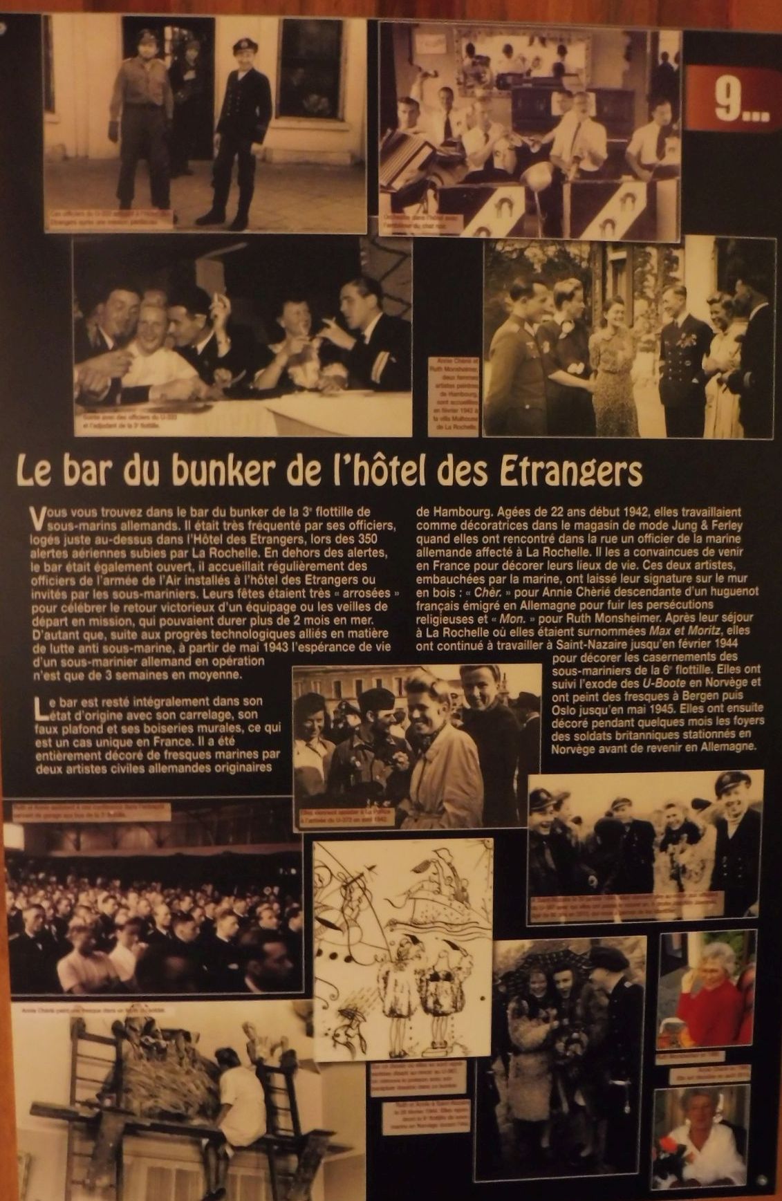 Sabia que La Pellise, a La Rochelle, era un lloc emblemàtic com a base de submarins i de protecció total d’aquests en els segurs i inexpugnables hangars però, tot i haver vist uns quants búnkers, no estaba assabentada d’aquest tan ben conservat i amb la reproducció feta amb tanta fidelitat d’un ambient mundà ben alié al dolor i angoixa de la guerra i, especialment, la decoració amb motius del mar que embelleix i humanitza parets i sostres.