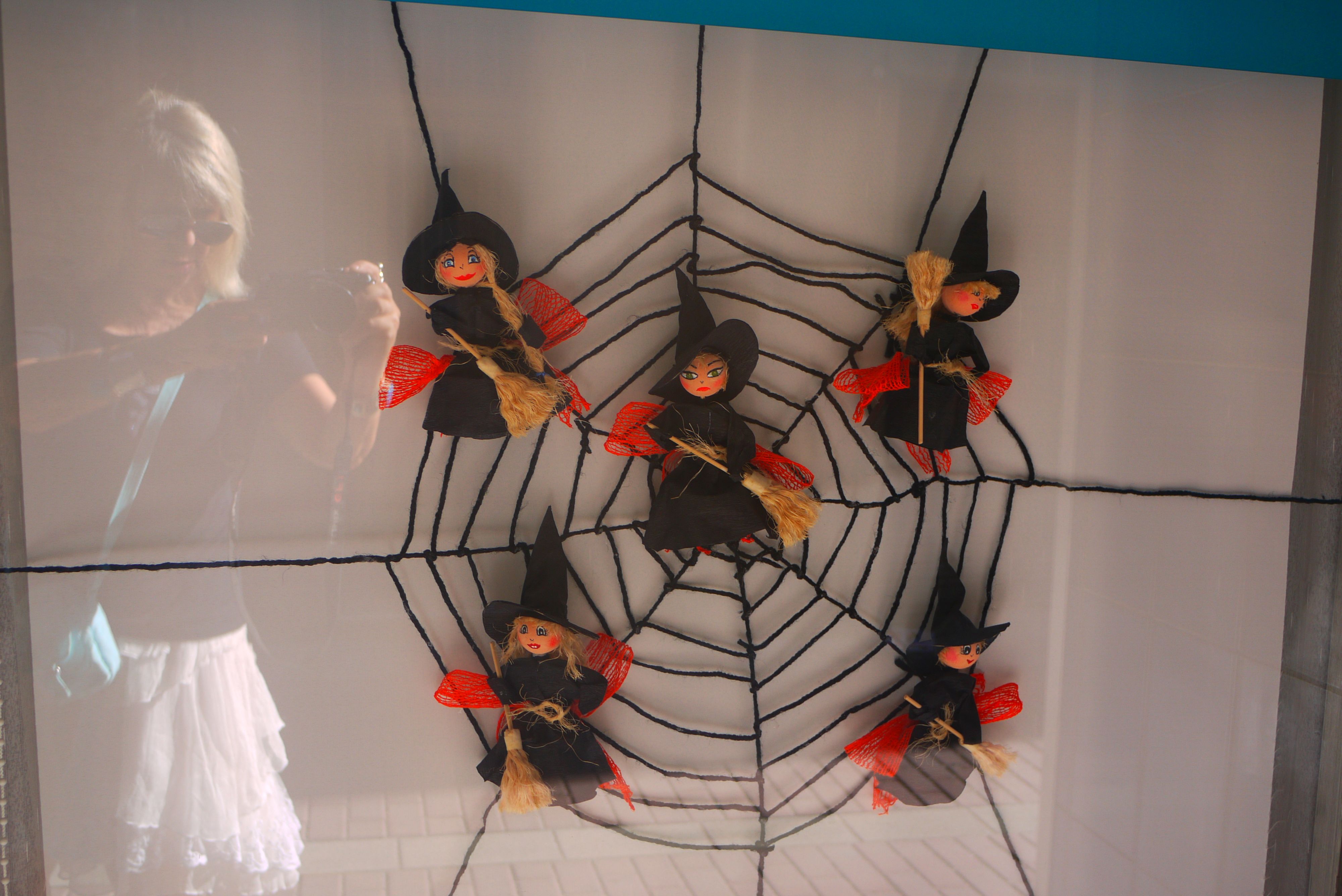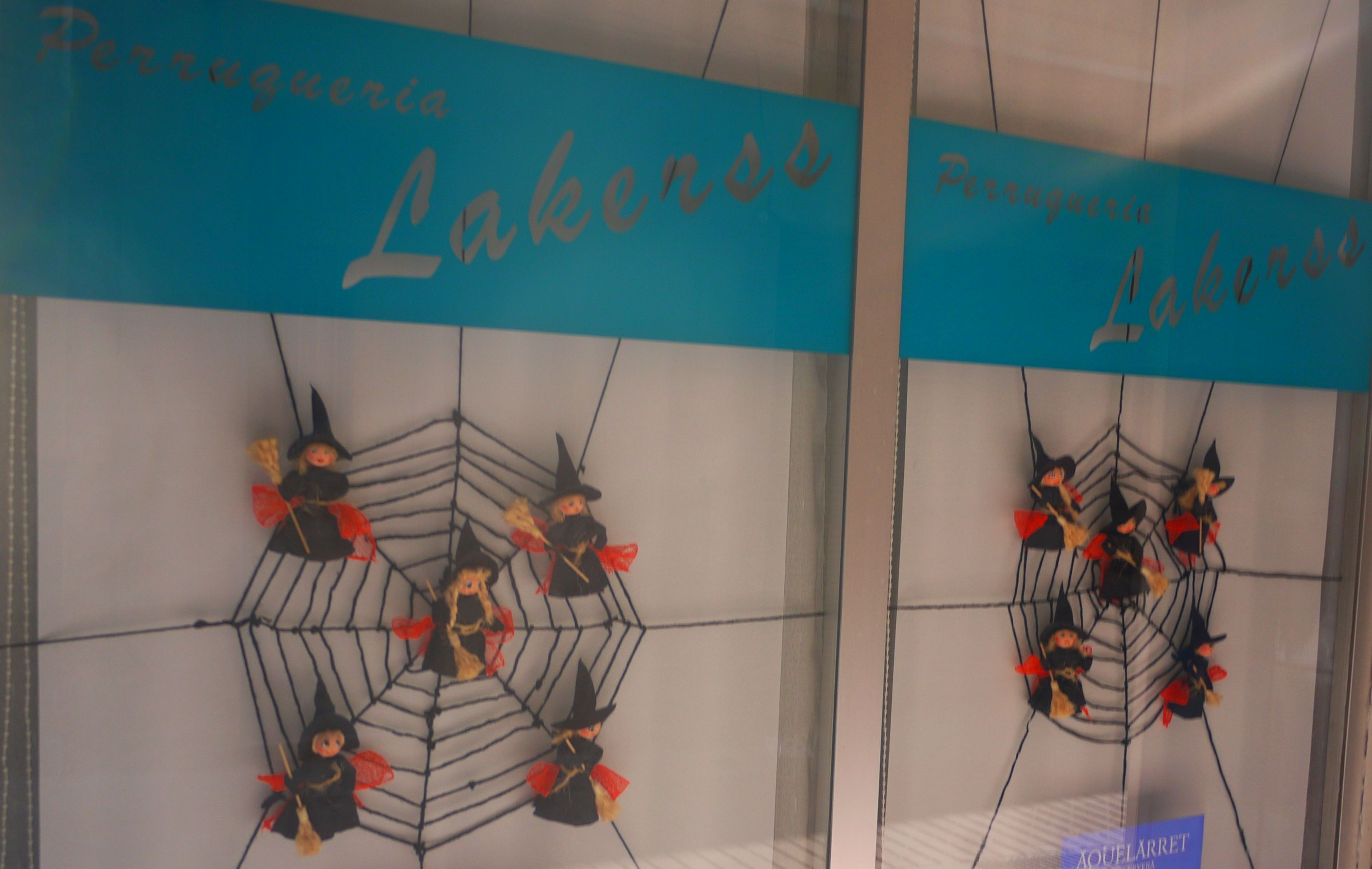 A la Perruqueria Lakerss sempre ens trobem amb bonics muntatges. Per Nadal, el pessebre és una preciositat, i per l’Aquelarre, unes simpàtiques bruixetes ens miren des d’aquest aparador. Aquest any, les encantadores bruixetes suspeses d’una teranyina, lluuïen amb el seus diminuts vestits i els seus alegres complements.