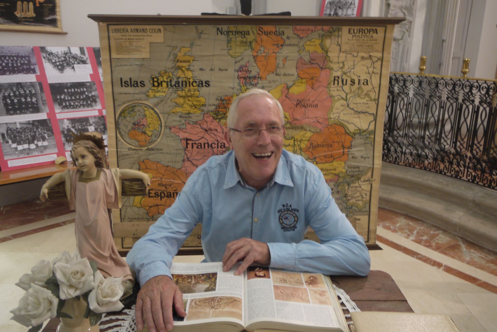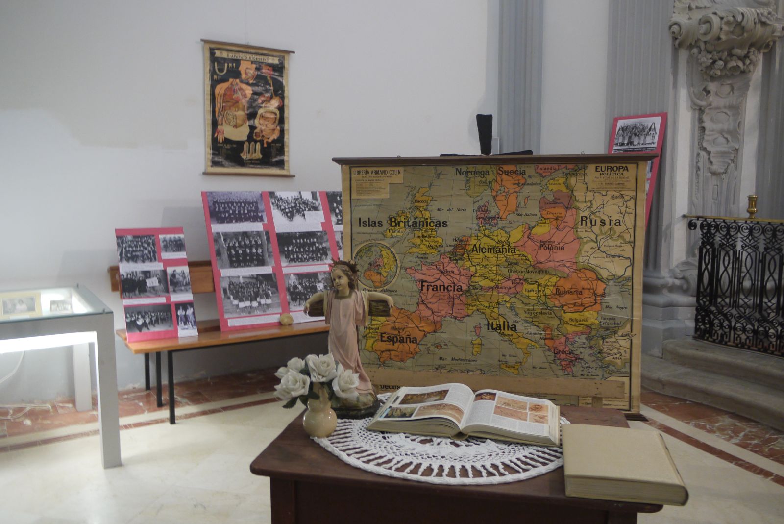 En primer terme, s’hi veu un pupitre de fòrmica, que ja té uns quants anys. Al damunt llibres, tinters i altres estris escolars fan companyia a aquesta bonica peça de fusta, també del Col·legi, que representa diferents aspectes de la bola del món.