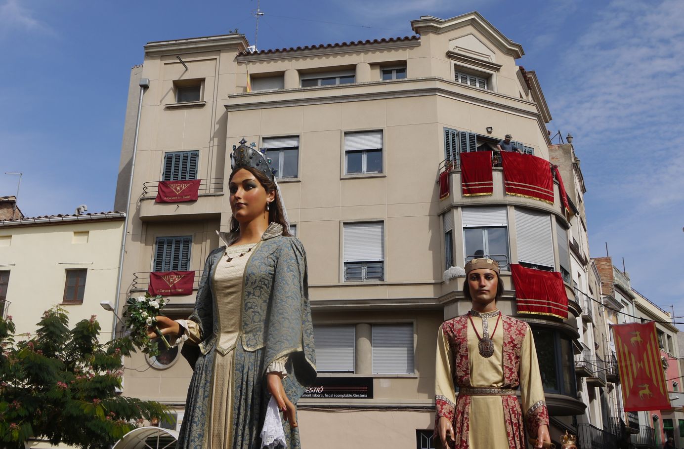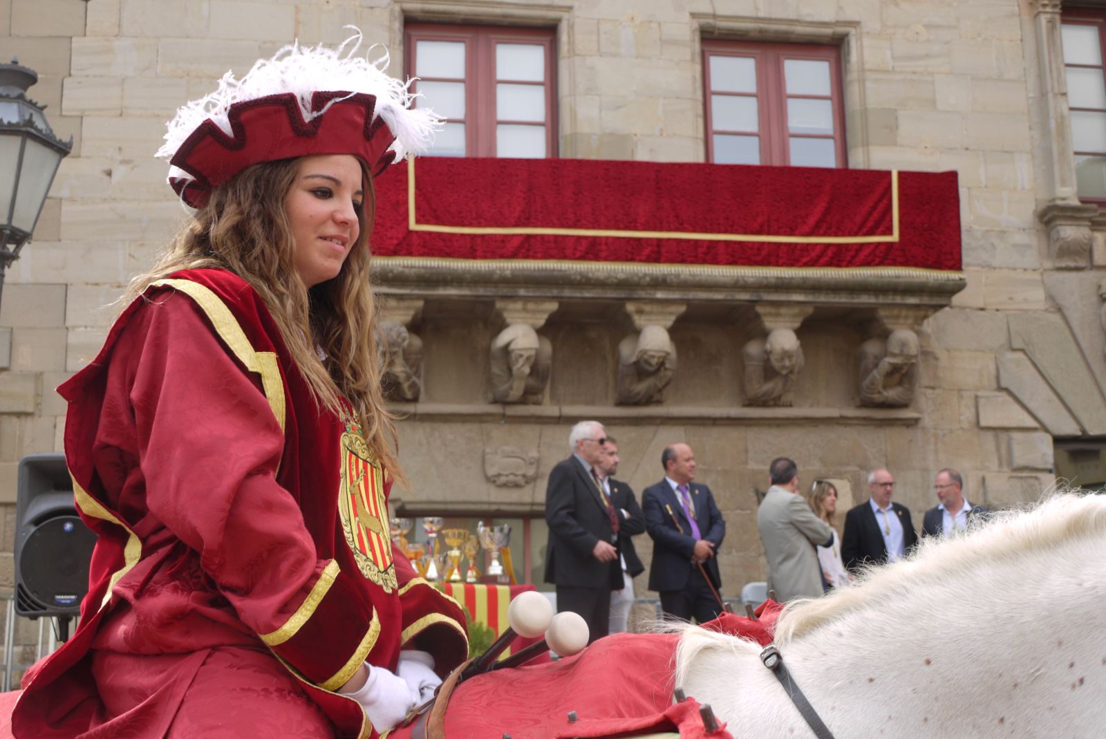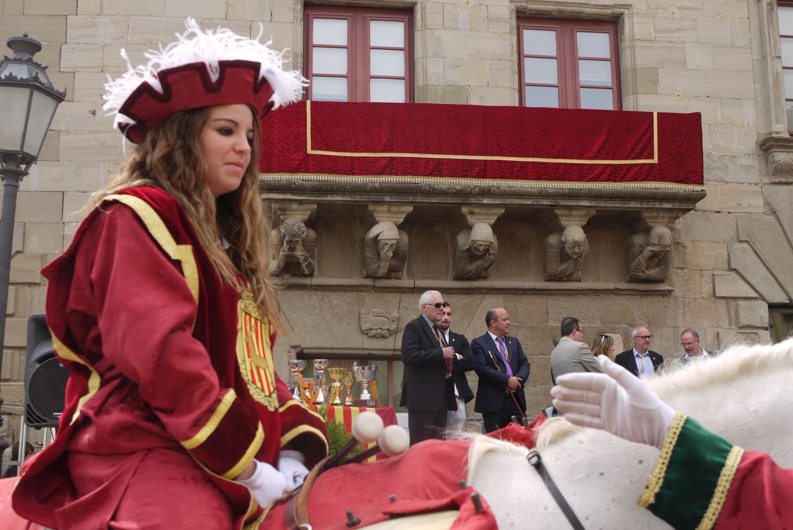 La vestimenta que porta l’Ester, tan de Festa Major, conjunta amb el domàs que hi ha al balcó de la Paeria. Grana i daurat, combinen a la perfecció donant una elegància de festa grossa al conjunt.