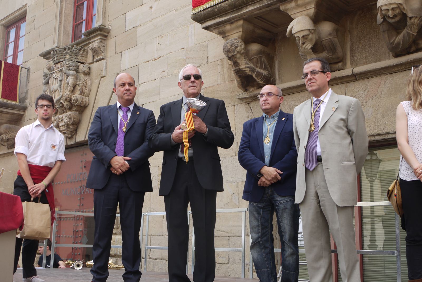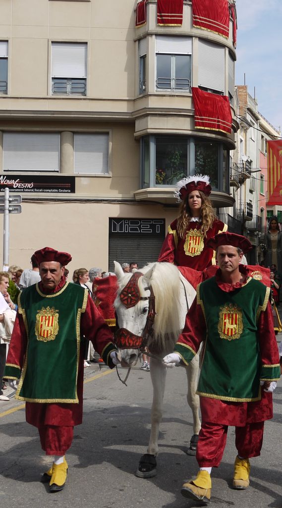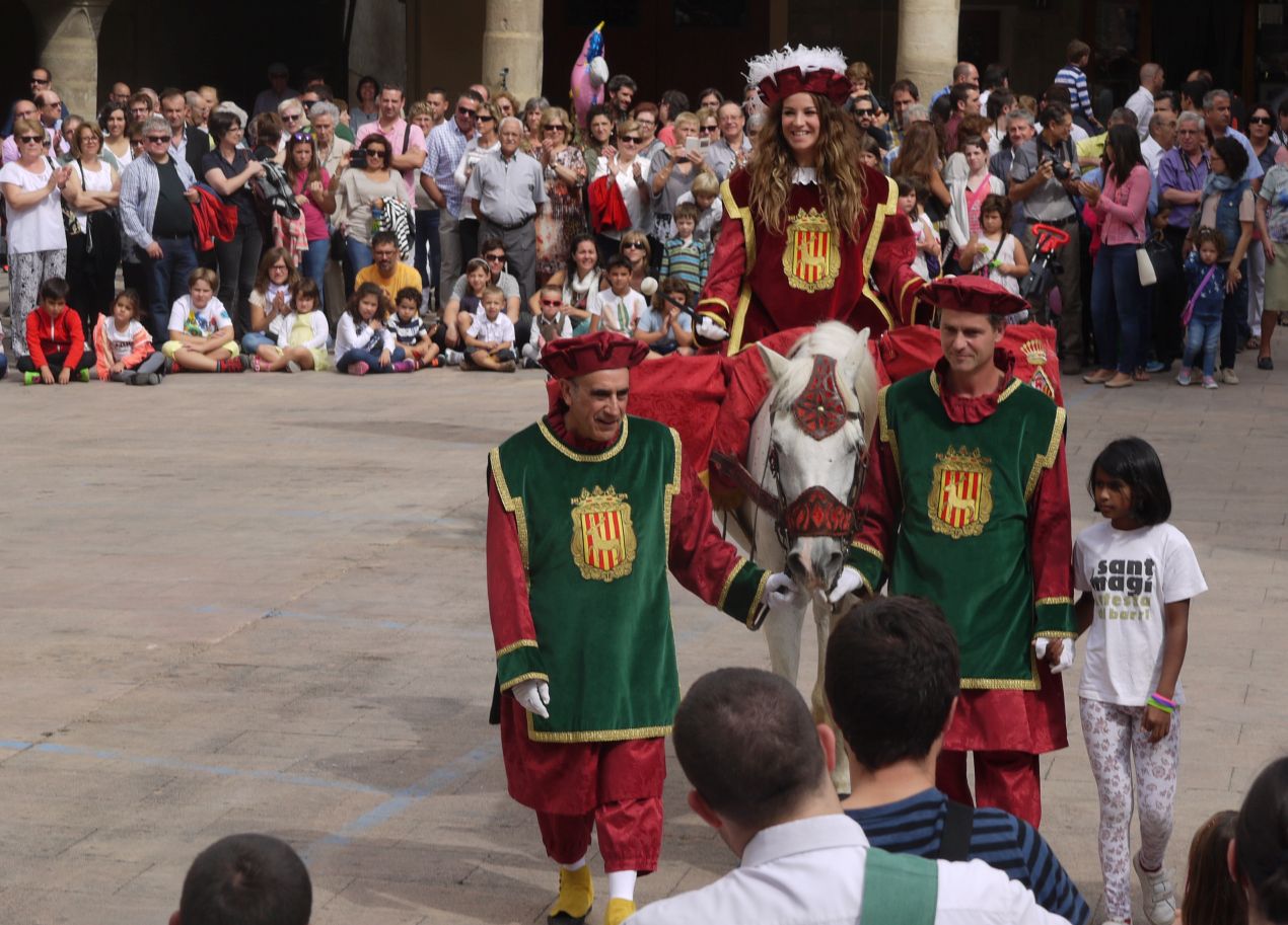 La vestimenta que porta l’Ester, tan de Festa Major, conjunta amb el domàs que hi ha al balcó de la Paeria. Grana i daurat, combinen a la perfecció donant una elegància de festa grossa al conjunt.