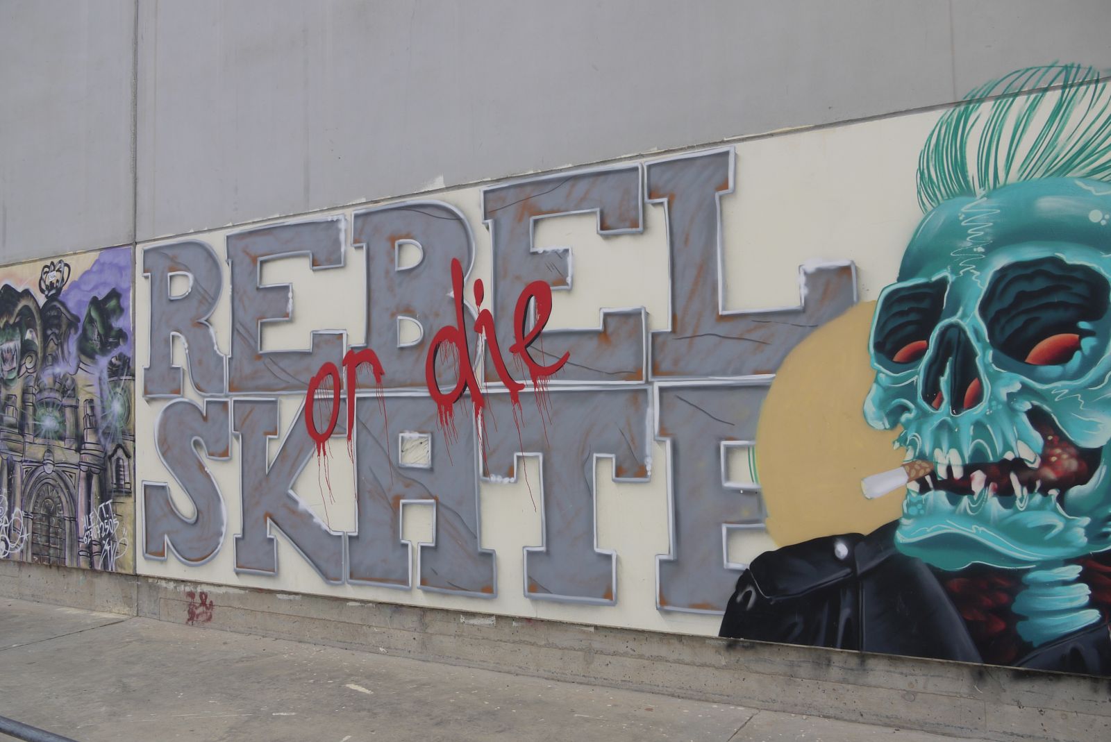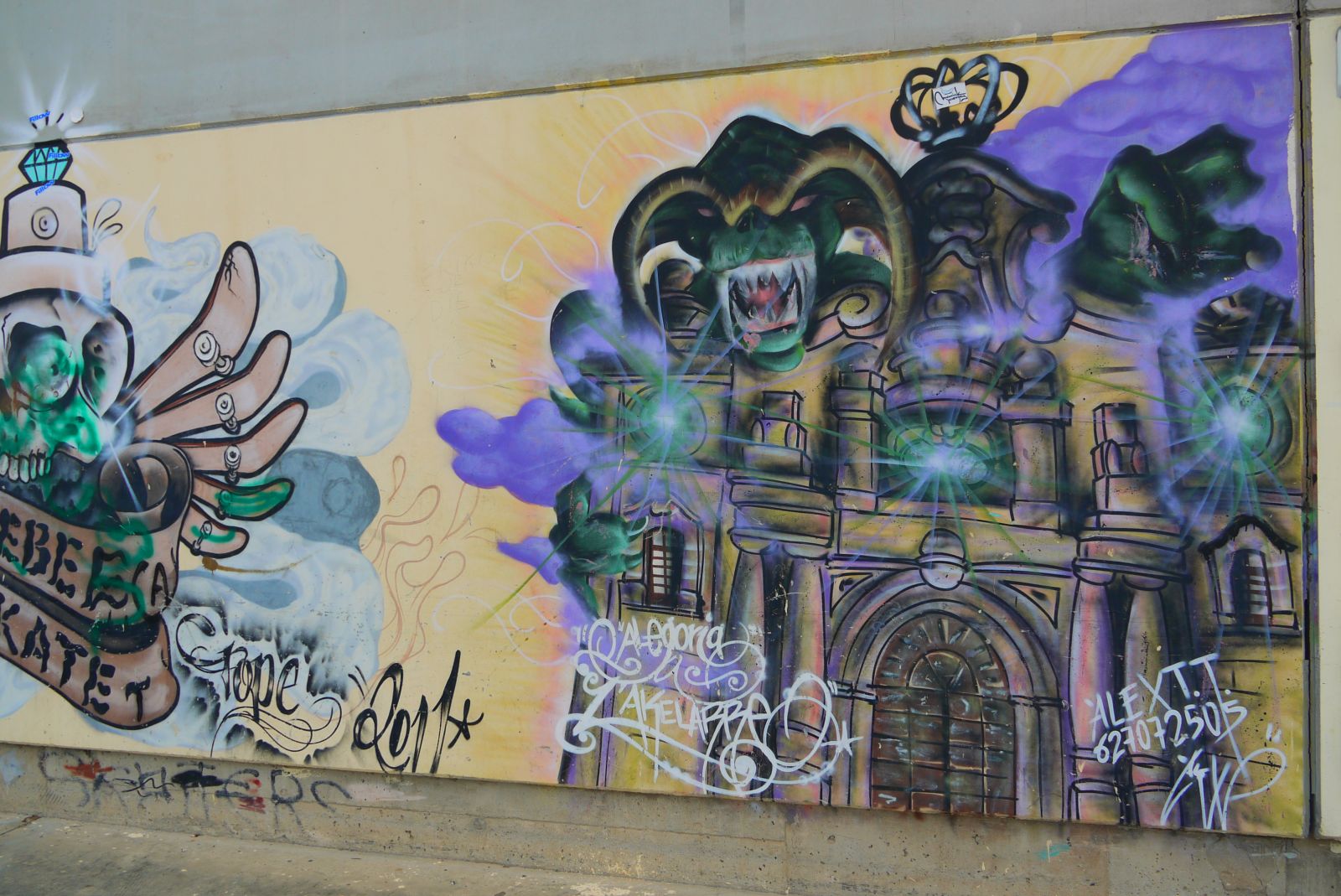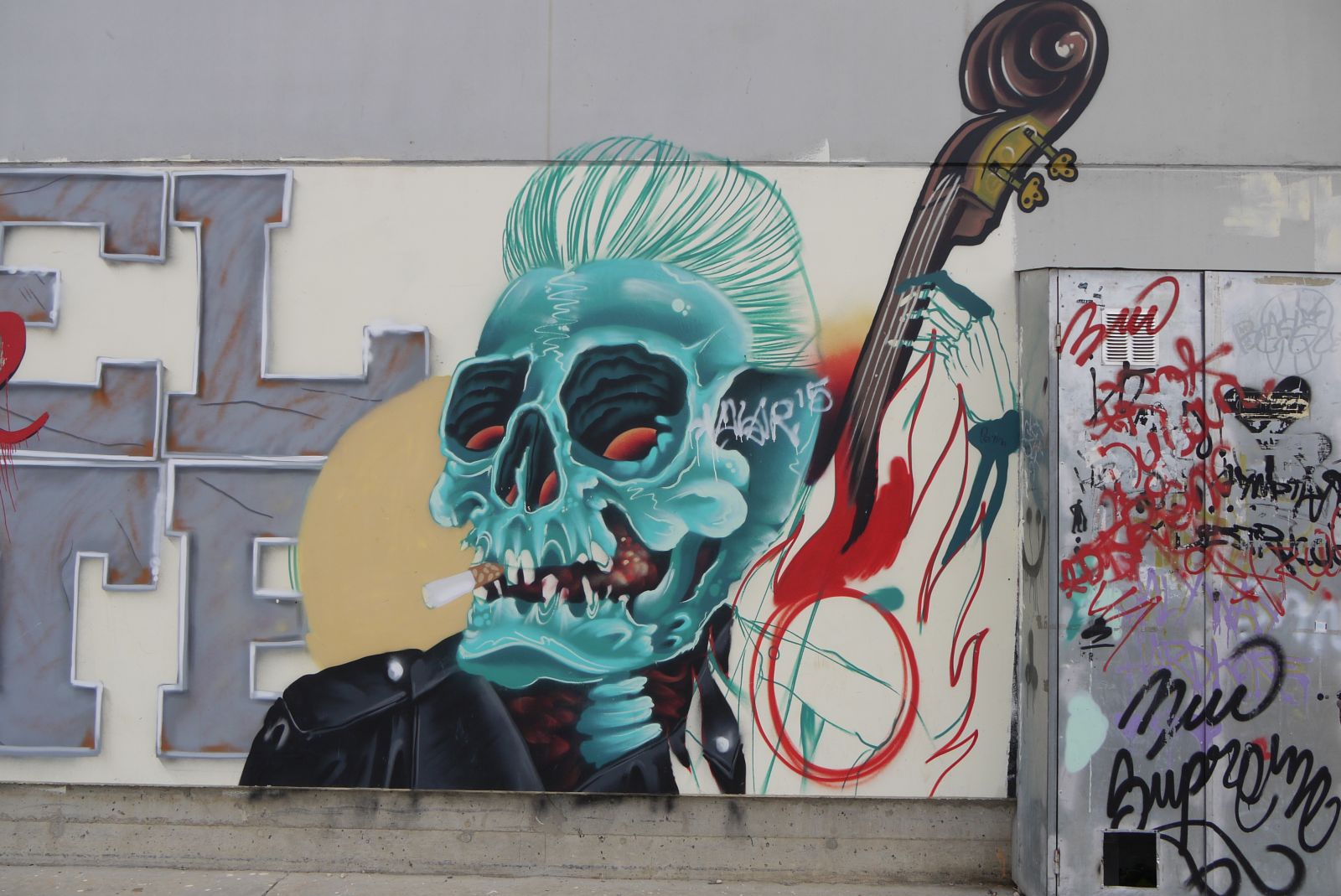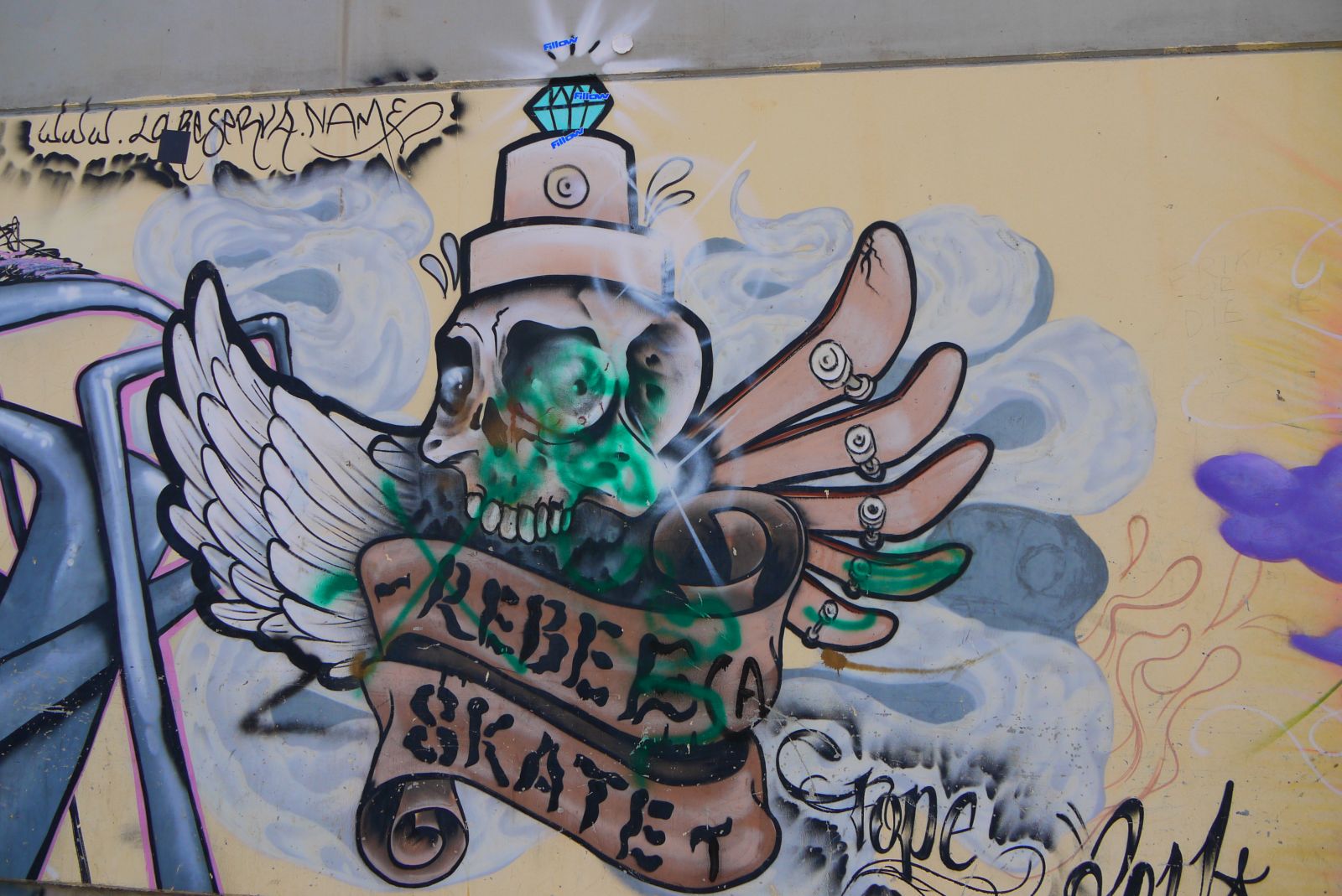 A continuació podeu veure detalls de les pintures que han fet en el mural decoratiu. La calavera sempre és una constant en aquest tipus d’art.