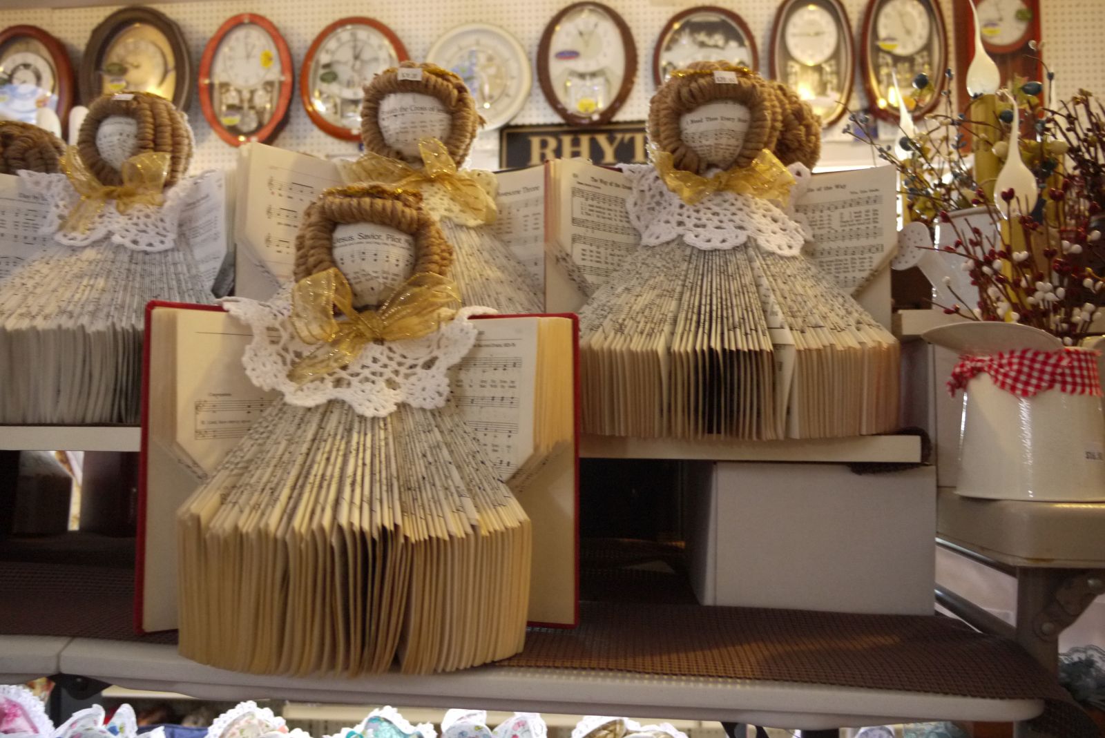 Està fet amb la tècinca del plegat de paper. El llibre és un text de música i han plegat les pàgines de manera que l’àngel presenti un vestit una mica estarrufat, pel que fa a la part de baix, i a la part superior, el plegat dóna forma a les ales. Un tapete de punta blanca emblelleix el coll. La cara, també amb paper, i el cabell, fet amb una corda enrotllada com si portessin tirabuixons, dóna un encant molt especial a aquesta bonica i original figura.