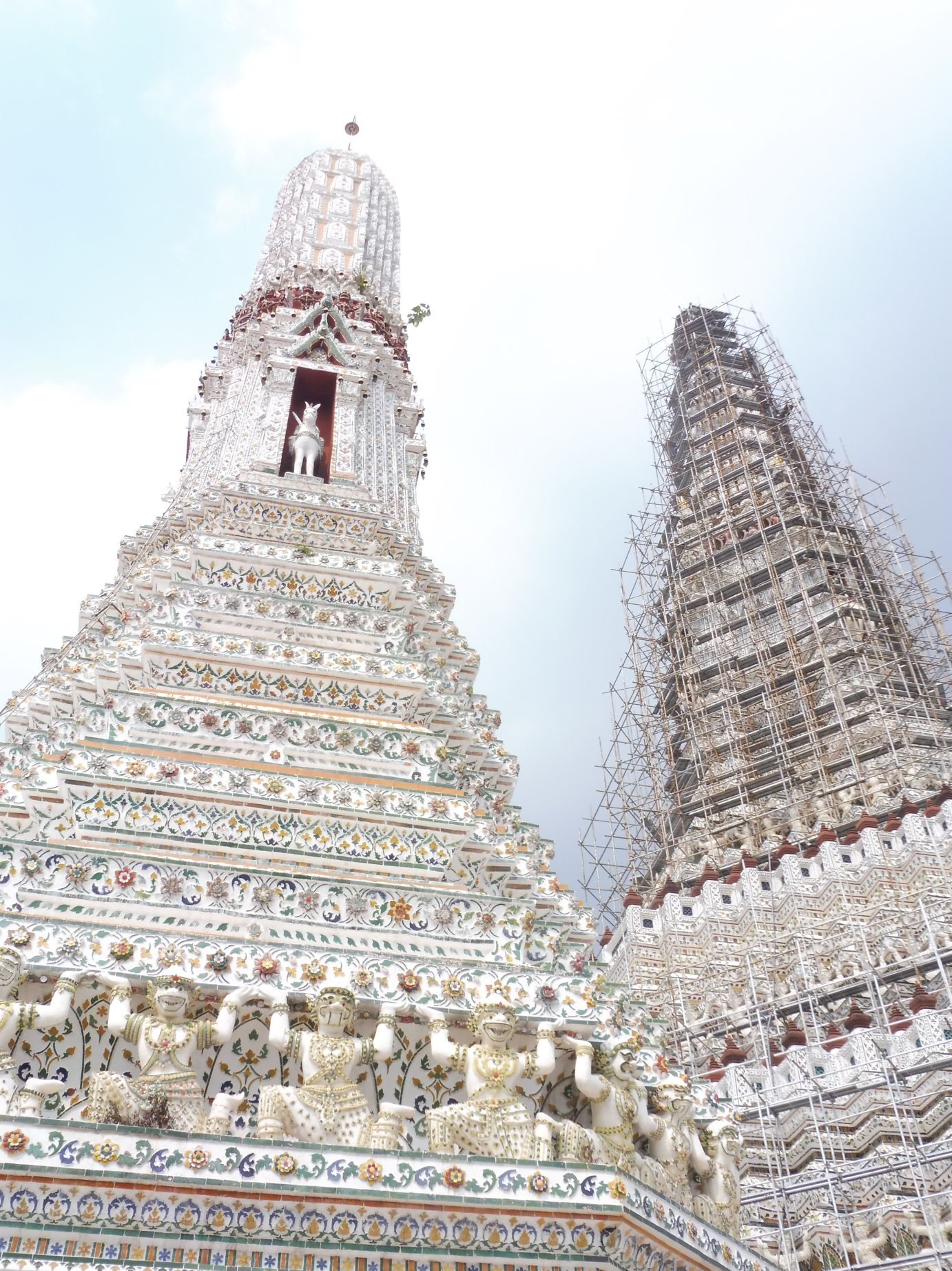 Aquest és l’aspecte que presenta el temple vist des del riu. De nit, navegar pel Chao Phraya va ser una molt bona experiència ja que el vaixell va recórrer tota una amplia zona i es va poder gaudir amb les edifiacions més properes a l’aigua. Aquesta fotografia és manllevada. Ara seguien amb el procés de neteja del temple i estaven treballant a l’alta torre central que ells anomenen prang. En aquesta imatge encara estan en un dels prangs laterals.