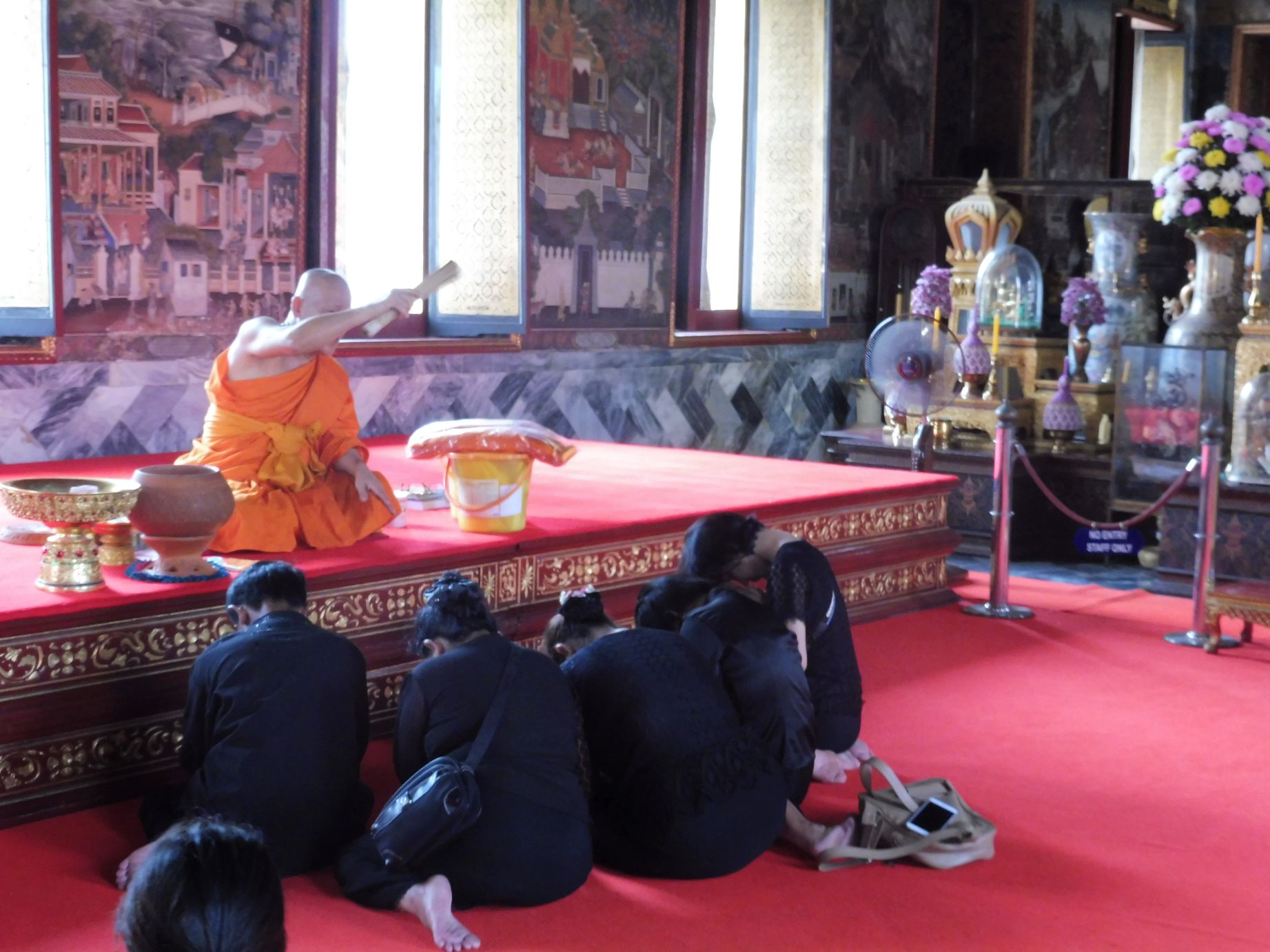 Aquest monjo beneix a un grup de gent endolada que ha vingut a retre homenatge al rei. Després de passar pel Palau Reial aprofiten el viatge per anar a visitar i pregar en altres temples de la ciutat.
