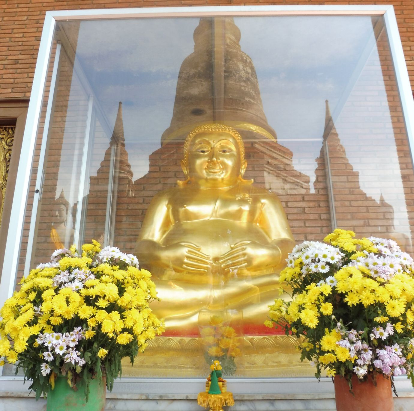 Un Buddha d’apecte poc habitual roman tancat dins una vitrina, cosa que possibilita que es barregi amb la part frontal del temple.