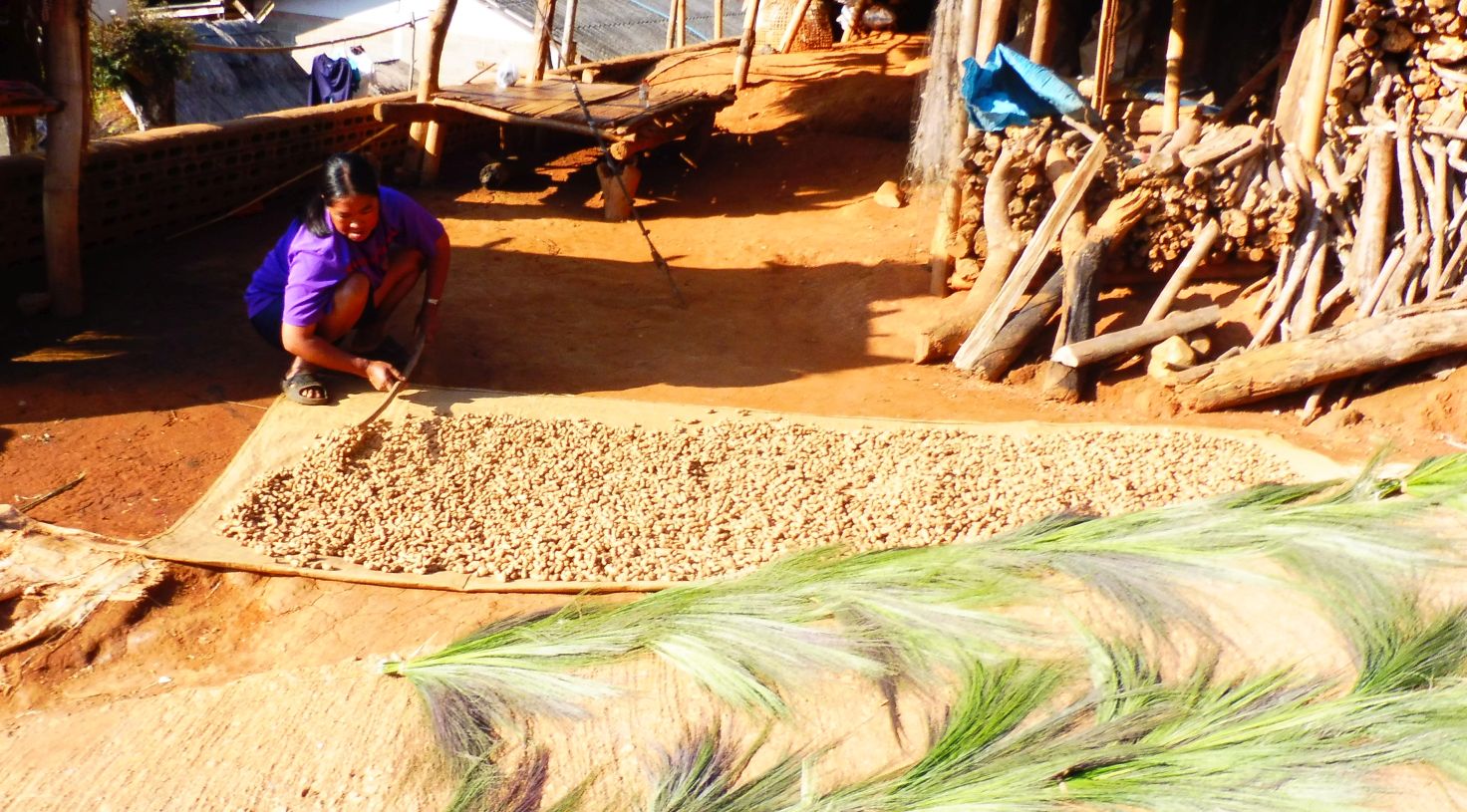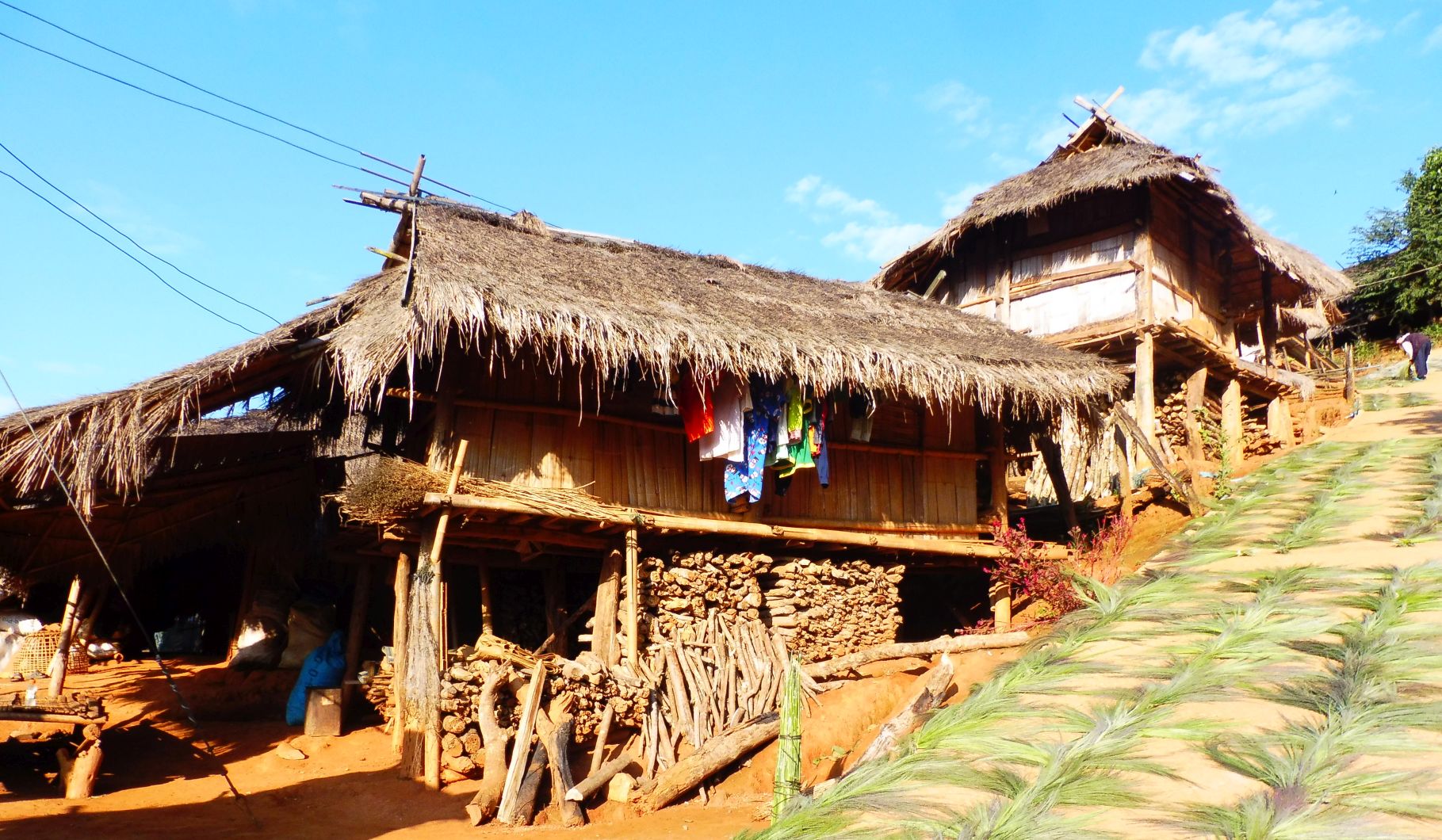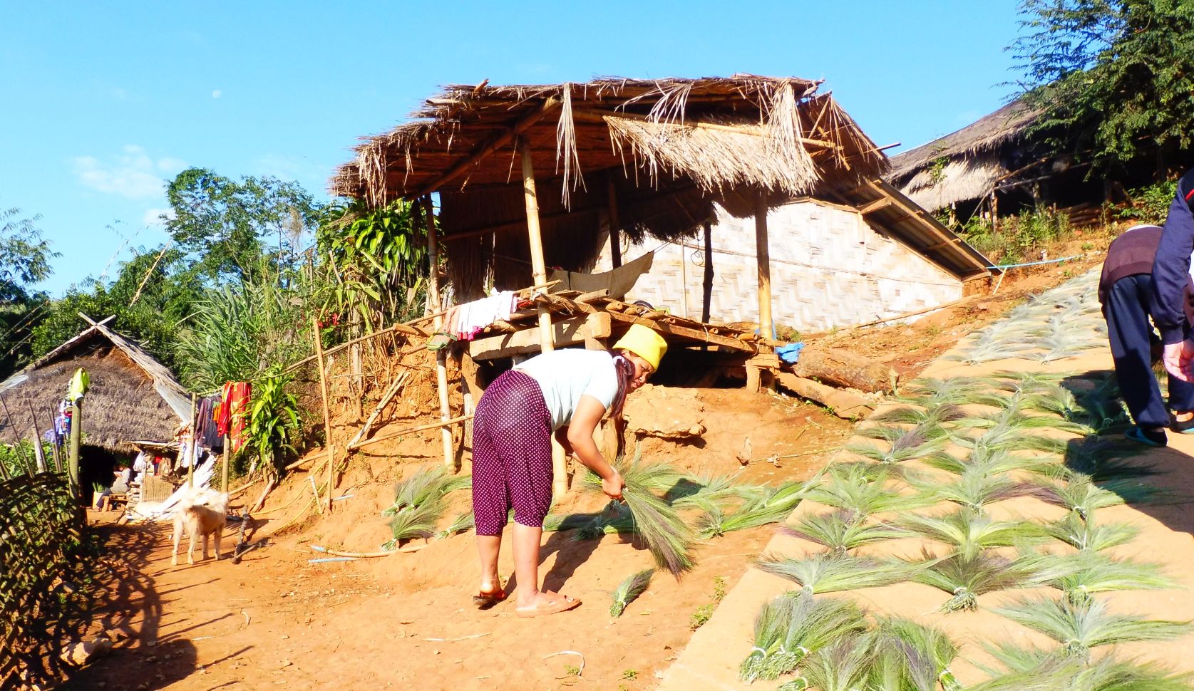 Cal recordar que en aquest país hi fa fred molt poc fred i això permet que les vivendes puguin estar molt obertes. La pujada era ben dreta i, a la vora del camí, les plantes que fan servir per cobrir les teulades, s’assecaven. Les havien tallat i les preparaven.