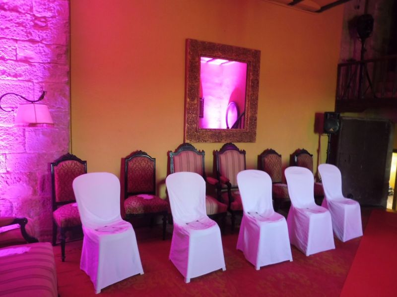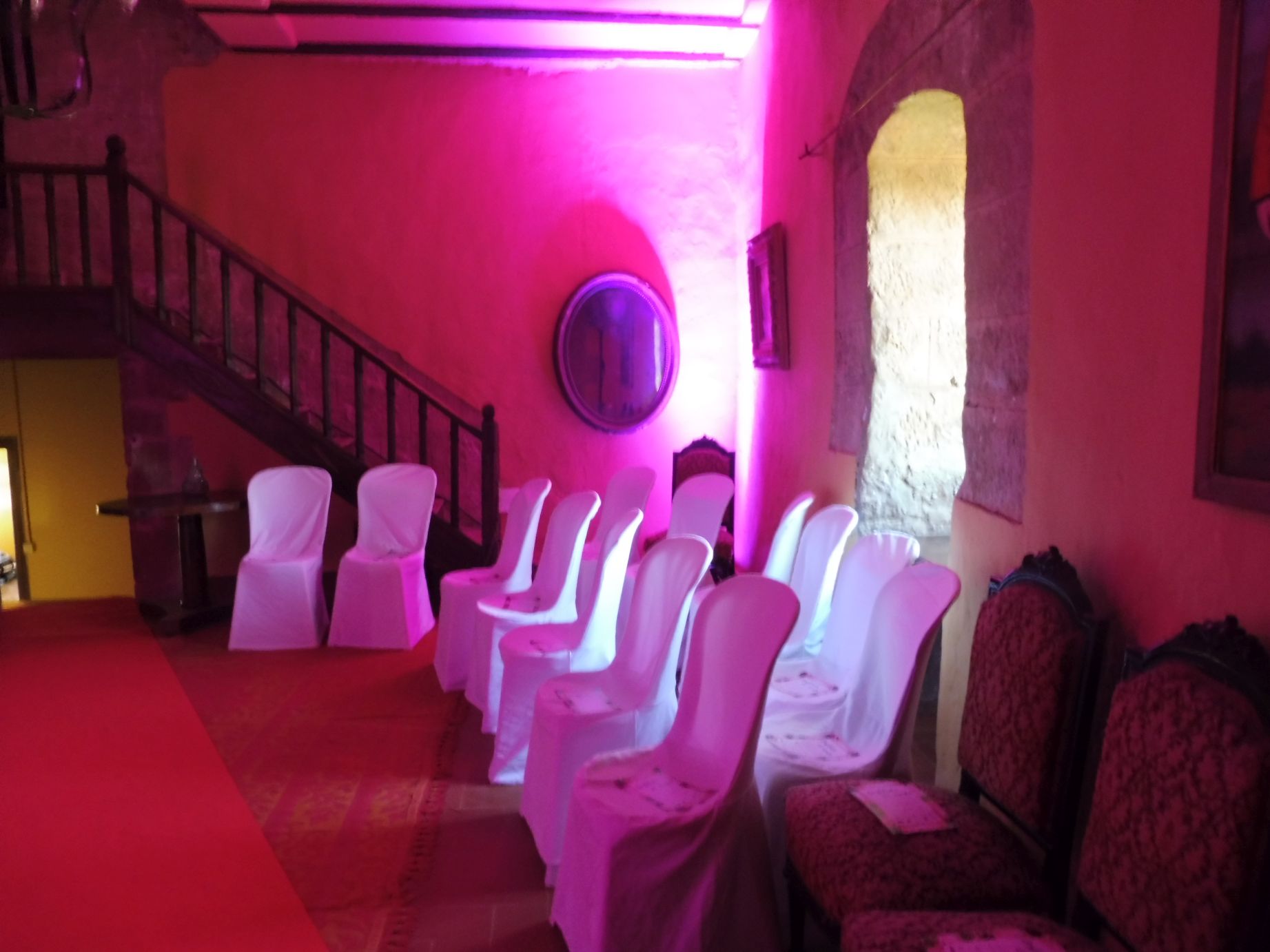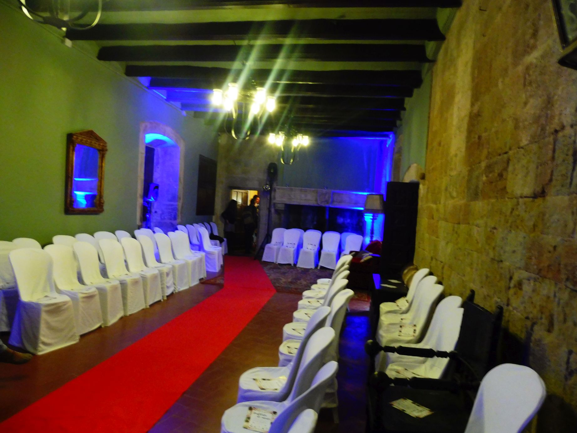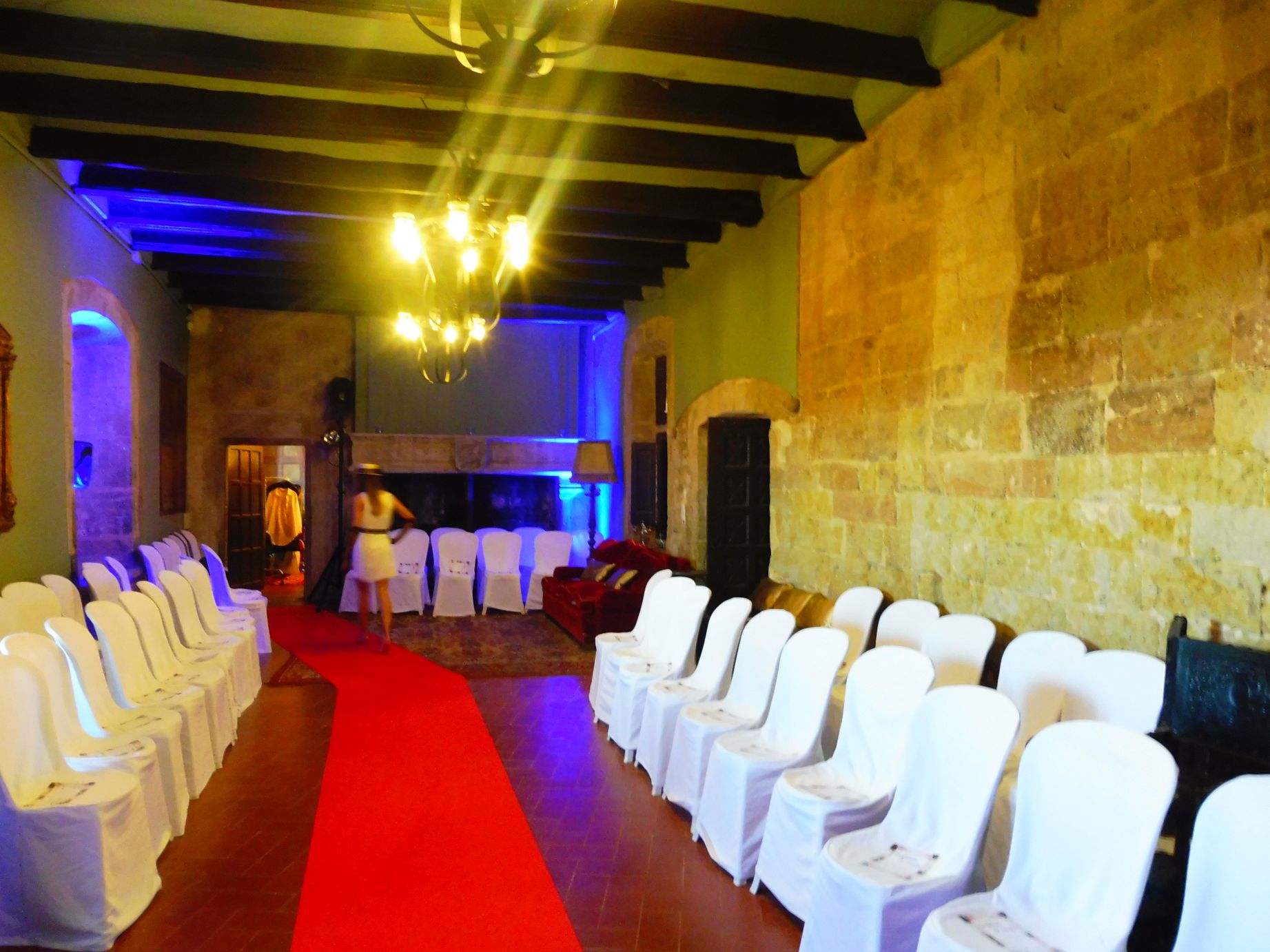 Ara podreu entrar a l’espai on va tenir lloc aquesta desfilada i en podreu gaudir quan encara estava buit. La il·luminació hi jugava un paper molt important. Es van fer servir totes les sales, de manera que les models anaven passant pels diferents espais, on s’hi havien posat moltes cadires que, folrades de blanc, acompanyaven a altres seients que formen part del mobiliari del castell.