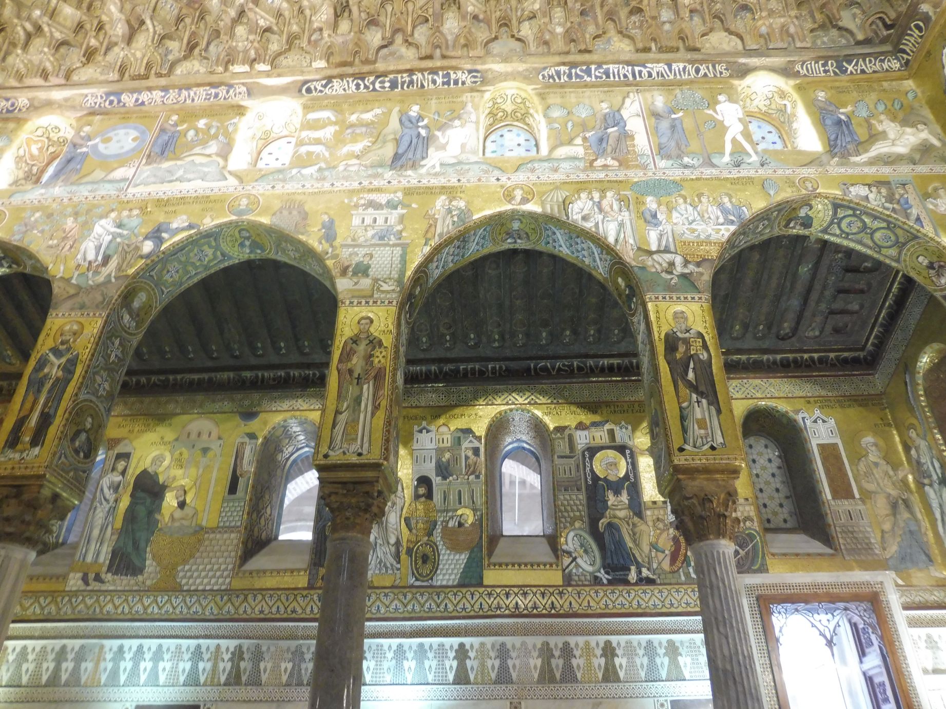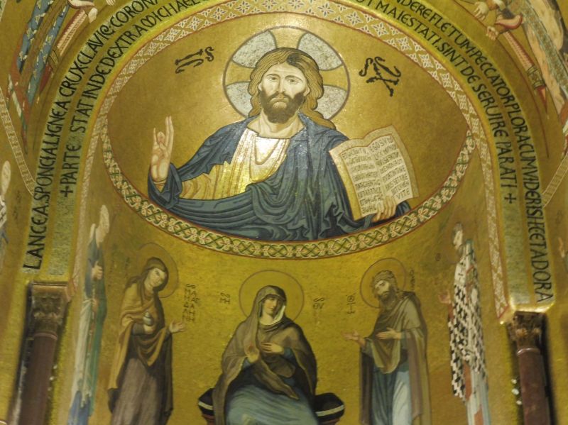 La joia de la corona d’aquesta ciutat és la Capella Palatina que està en el Palau dels Normands. Si deia que línterior de l’església de Monreale era d’una bellesa extraordinària la Capella Palatina la supera del tot. En entrar-hi totohom es queda bocabadat. Dita capells té tres naus separades per arcs damunt de columnes ricament treballdes, un fantàstisc cel ras de fusta fet a l’estil àrab i totes les parets revestides de mosaics en els que hi destaca el Crist Bendicent que podeu veure en aquestes imatges.