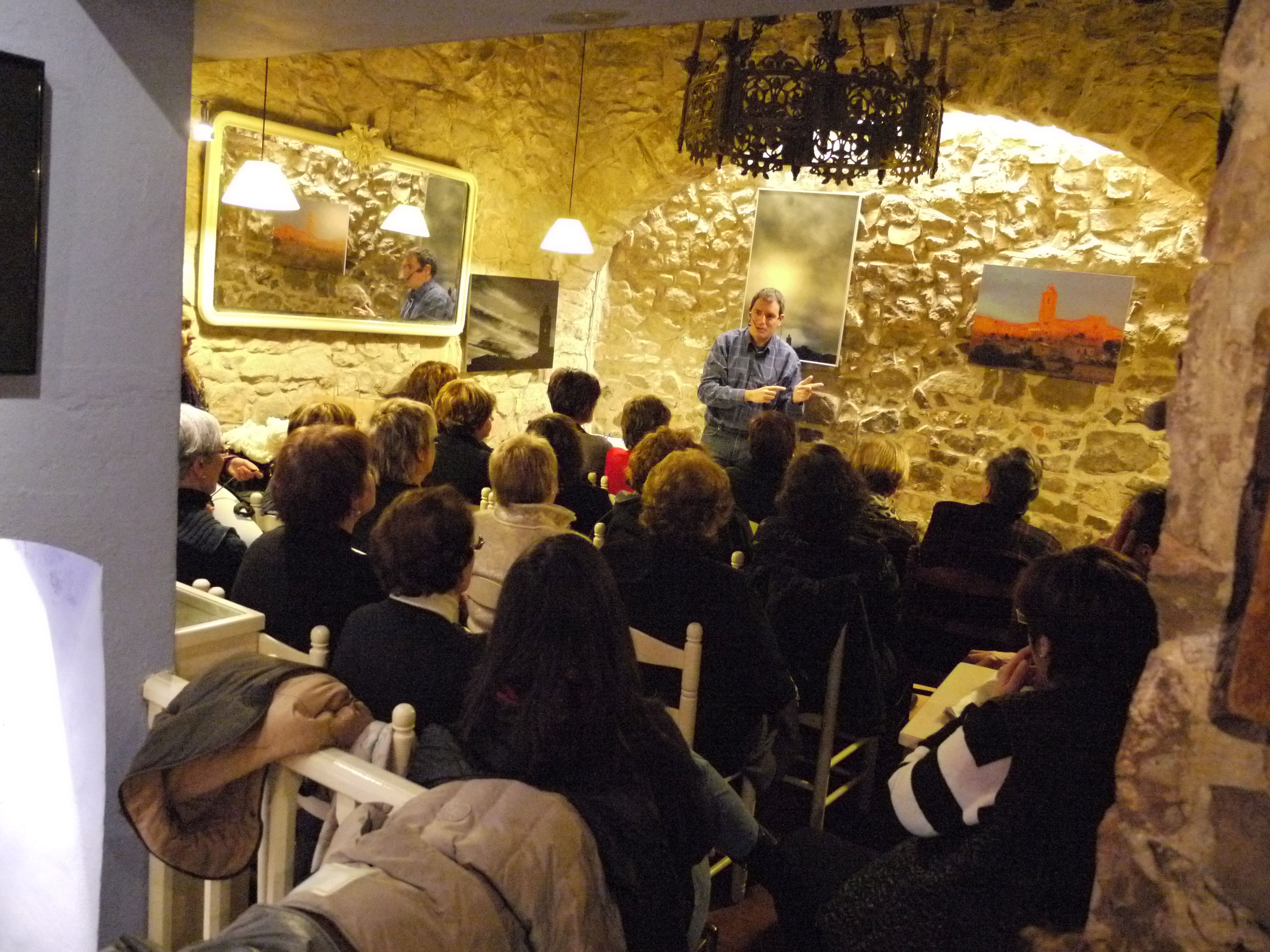 Queda tancada aquesta informació sobre conferències al Campanar amb el record d’un cerverí molt estimat. Aquí el podem veure en el moment que impartia la magistral conferència. Curiosament va descobrir, en una de les fotografies que l’envoltaven i que formaven part de l’exposició presentada per Ramon Aldomà amb les imatges del calendari, un helicòpter que volava molt proper al campanar. Va resultar que era ell la persona que hi viatjava. Una anècdota molt simpàtica que sempre recordarem.