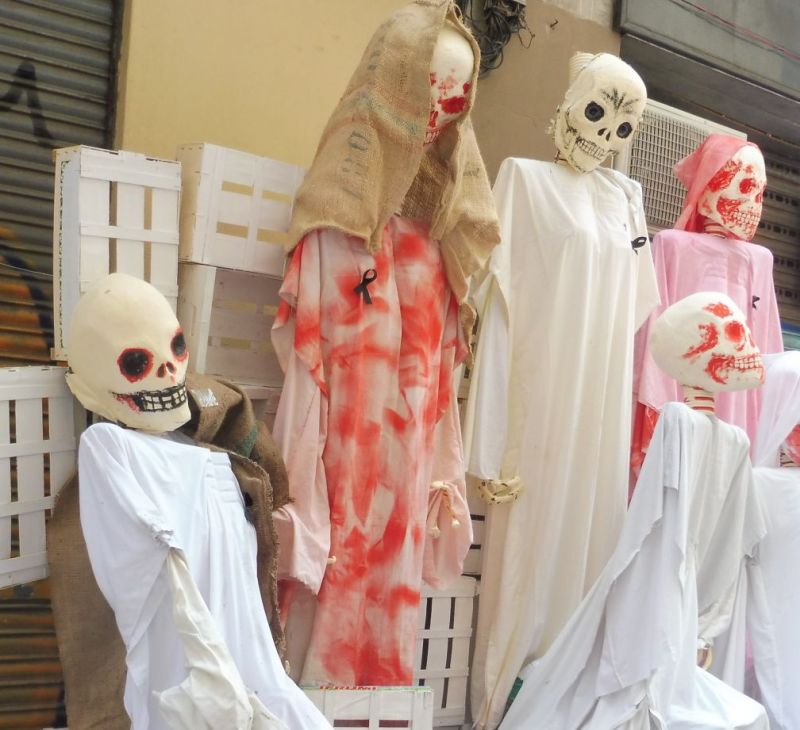 Munts de calaveres s’apilonaven en aquest infern.