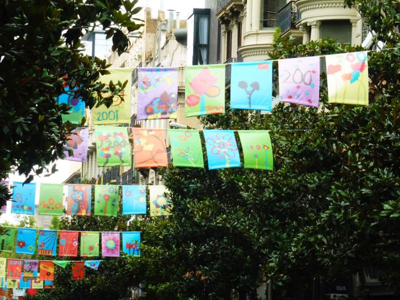 Seguim fent camí. Ens trobem amb el carrer Gran de Gràcia, el més important de la Vila de Gràcia, que feia molt goig. Una quantitat nombrosa de banderoles l’embelleixen i li donen vistositat. Com podeu veure el record de la celebració de 200 anys de Festes hi és ben present.