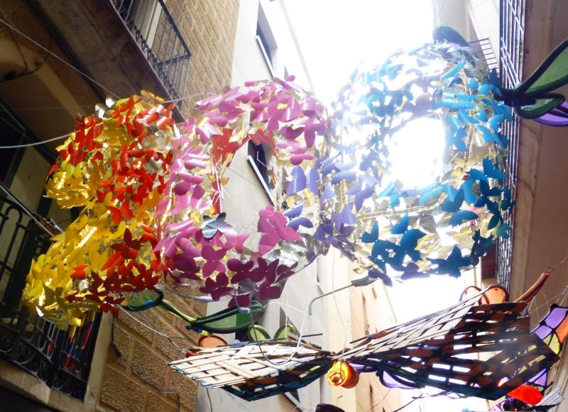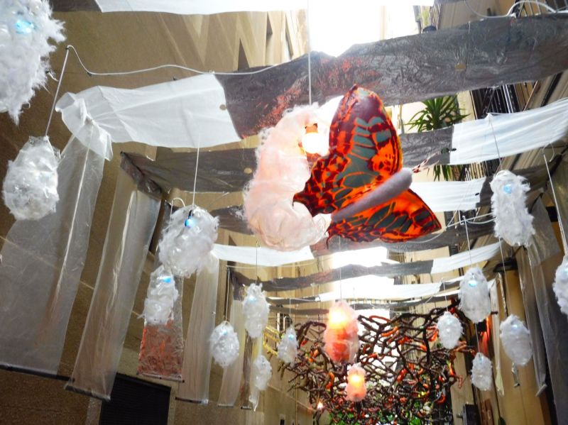 Pot ser que imatges no transmetin prou bé la bellesa d’aquest muntatge però us puc assegurar que era espectacular. S’anunciava d’aquesta manera: “Benvinguts al carrer Jesus, que aquest any s’ha omplert de verdor. Les plantes del nostre jardí han esdevingut l’aliment dels cucs que, seguint el cicle de la vida, s’han convertit en crisàlides de les que en sortiran papallones de totes mides i colors”
