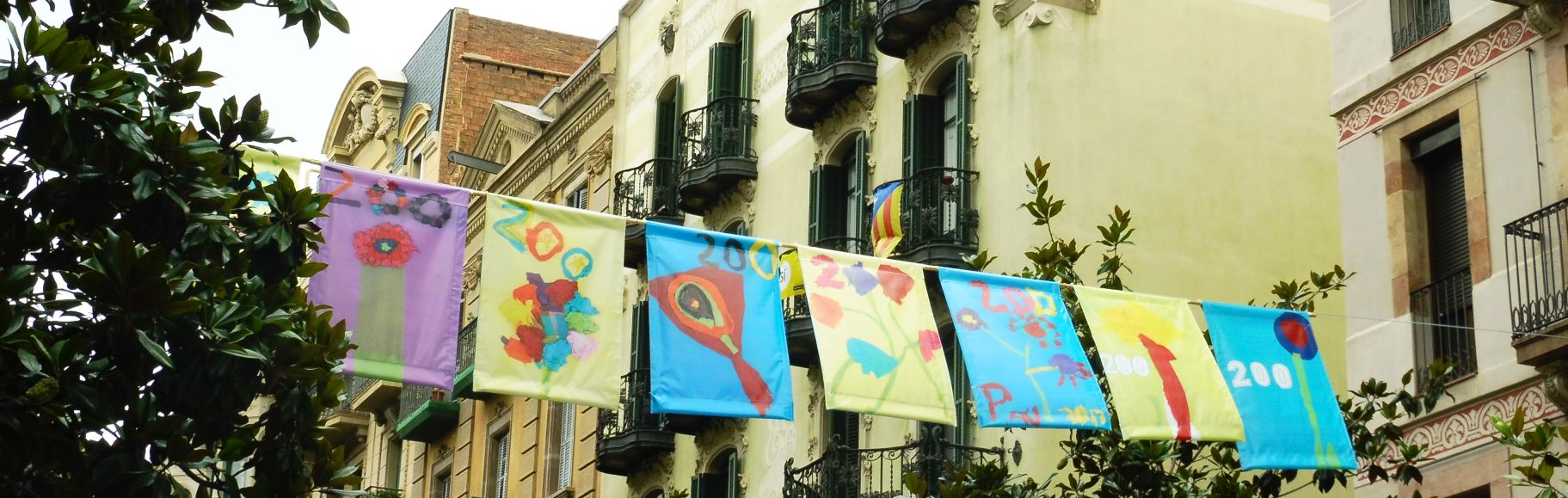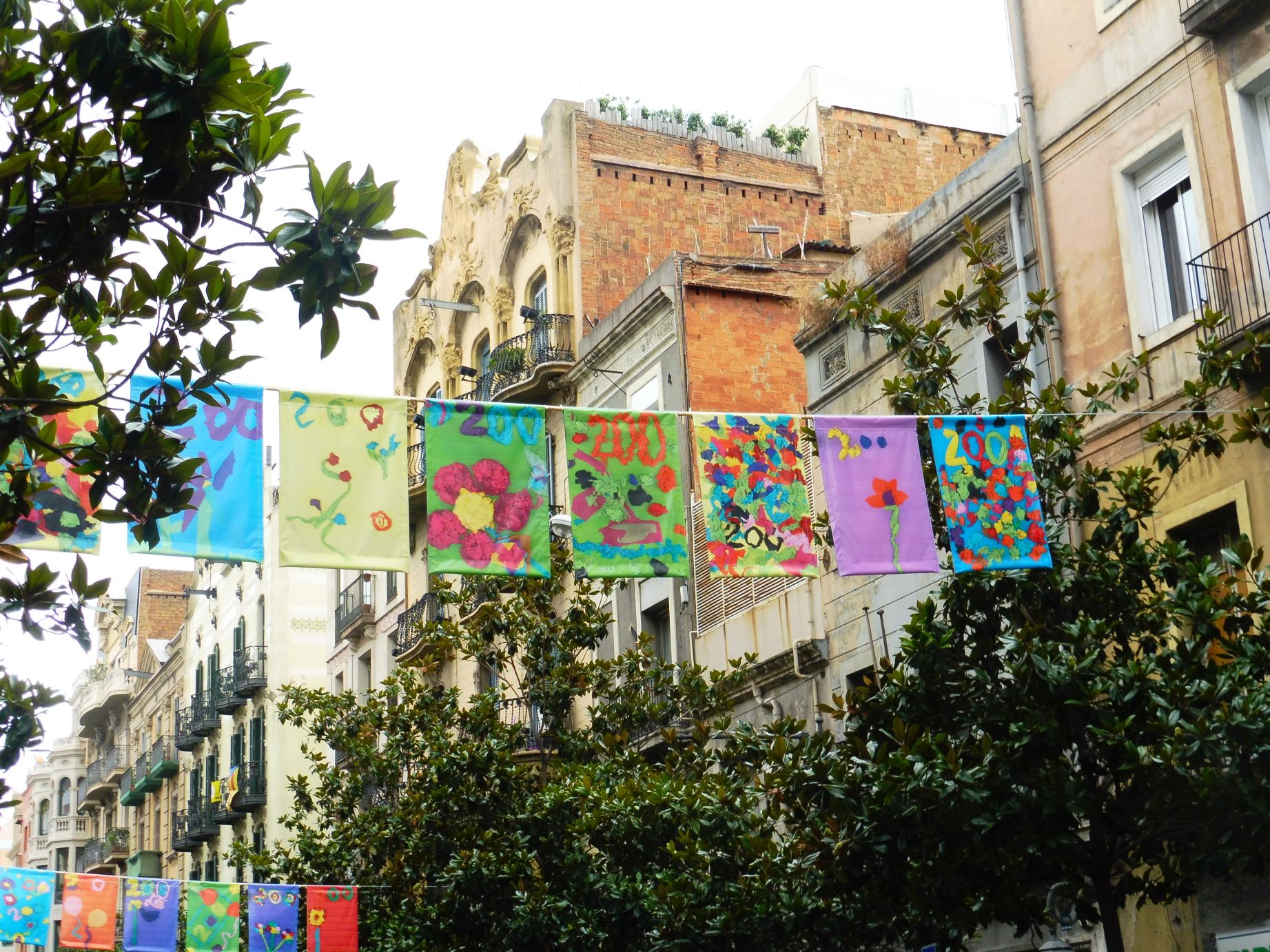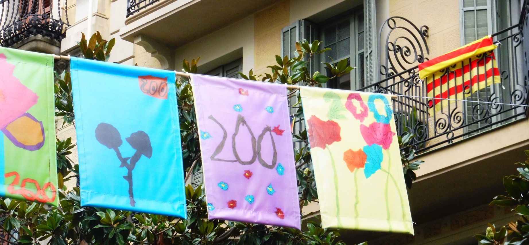 Seguim fent camí. Ens trobem amb el carrer Gran de Gràcia, el més important de la Vila de Gràcia, que feia molt goig. Una quantitat nombrosa de banderoles l’embelleixen i li donen vistositat. Com podeu veure el record de la celebració de 200 anys de Festes hi és ben present.