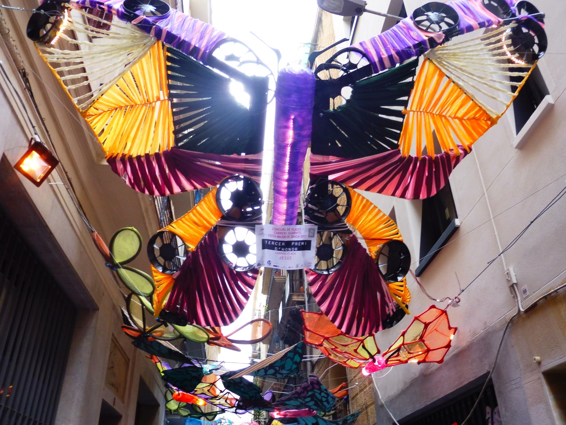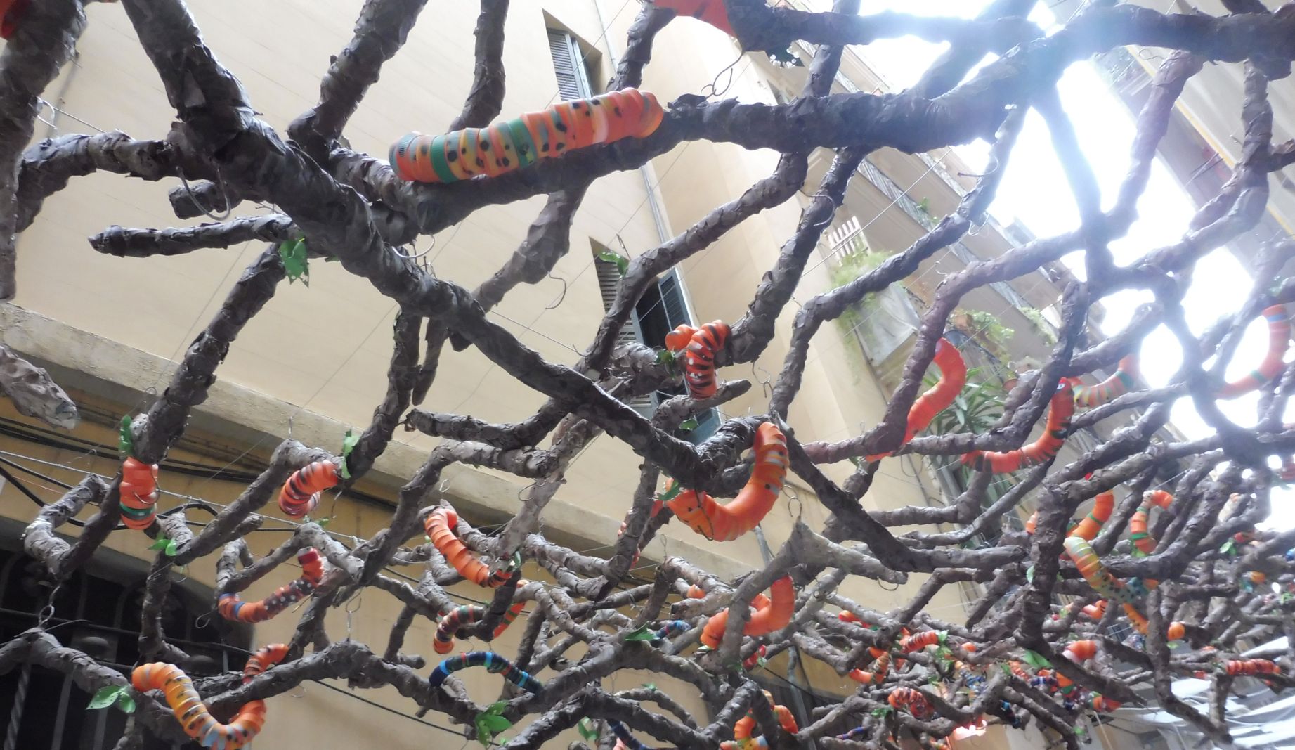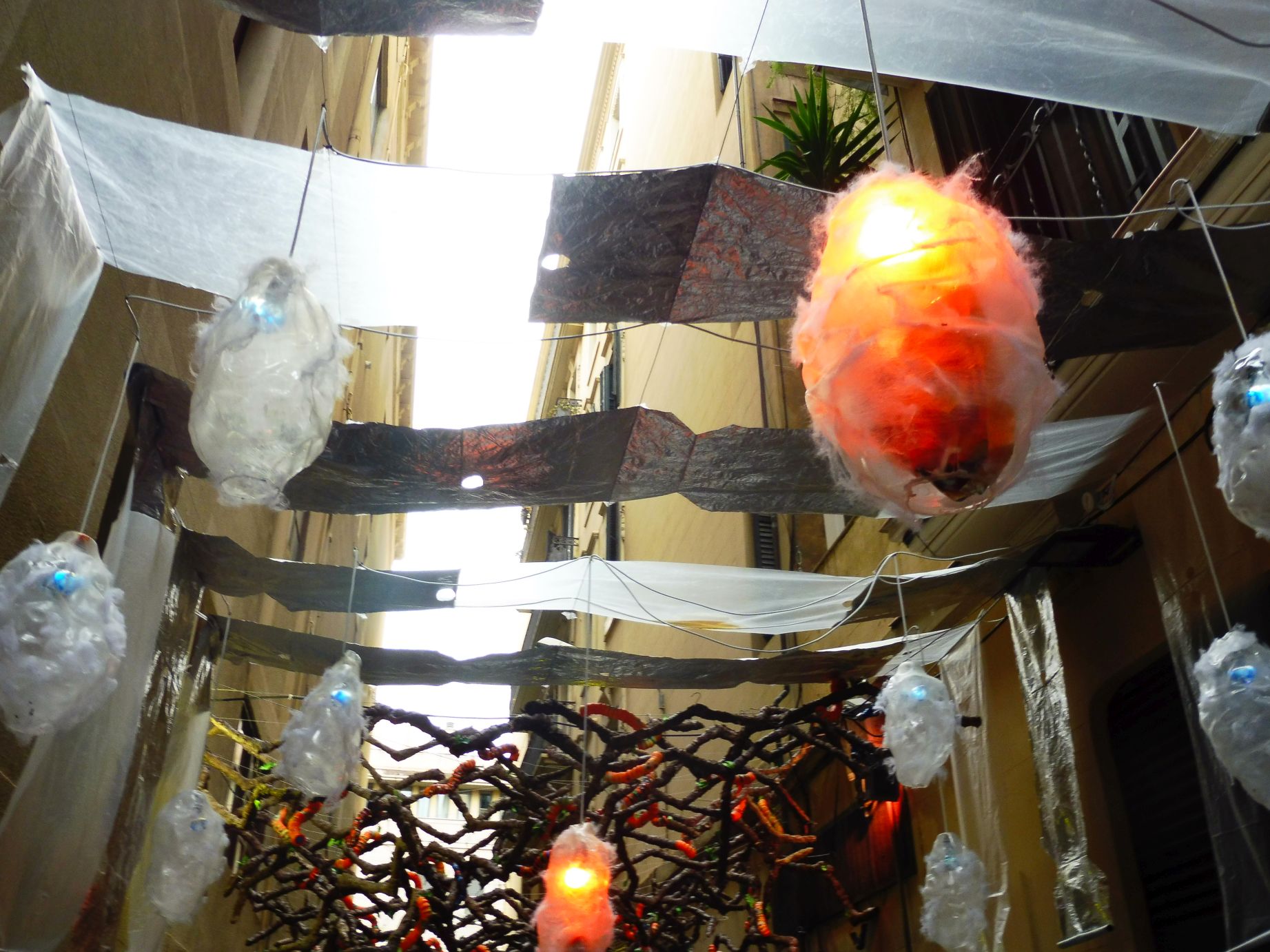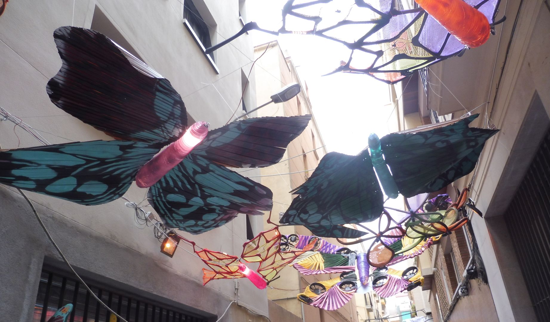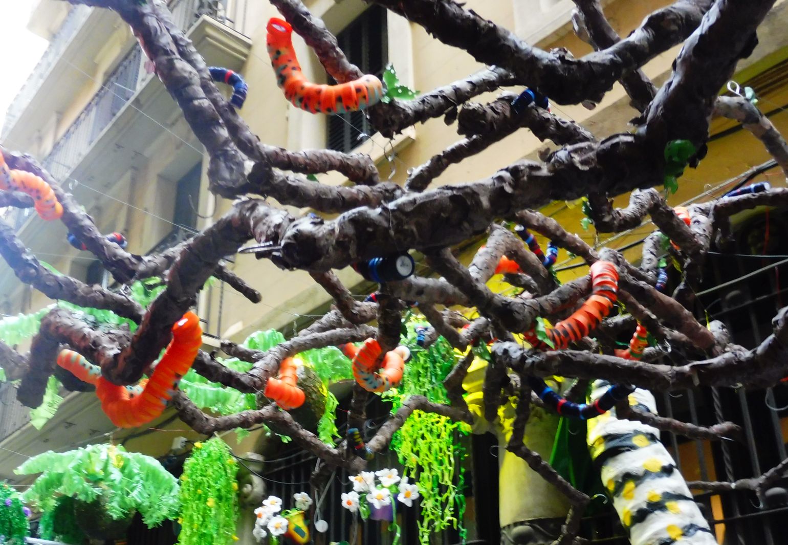 Pot ser que imatges no transmetin prou bé la bellesa d’aquest muntatge però us puc assegurar que era espectacular. S’anunciava d’aquesta manera: “Benvinguts al carrer Jesus, que aquest any s’ha omplert de verdor. Les plantes del nostre jardí han esdevingut l’aliment dels cucs que, seguint el cicle de la vida, s’han convertit en crisàlides de les que en sortiran papallones de totes mides i colors”