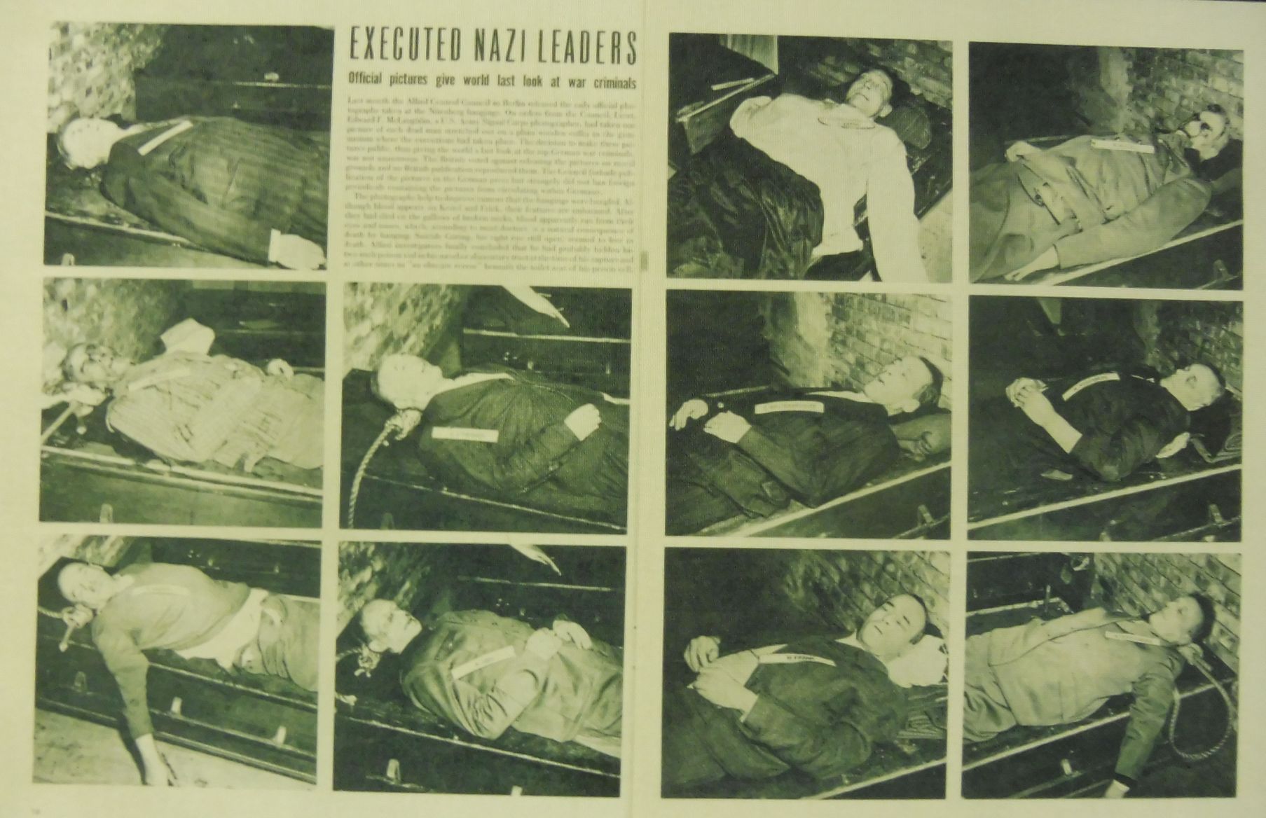 El 16 d’octubre de 1946 va ser el dia triat per les execucions. L’esmentat Hermam Göring es va suicidar a la vigília prenent una càpsula de cianur. Però la sentència es va complir. Tot i que ja era mort el seu cadàver també va ser penjat a la forca. Aquí podeu veure les imatges dels cadàvers de tots ells.