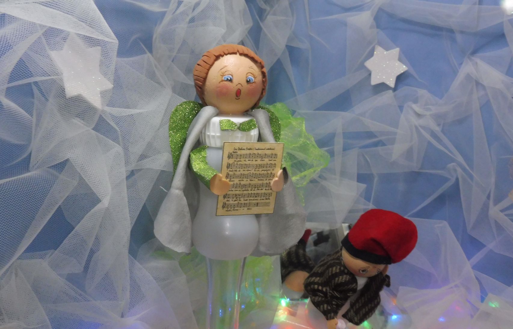 El caganer va fent de les seves mentre l’Àngel canta tot i llegint, ull al detall, una partitura feta a la seva mida.