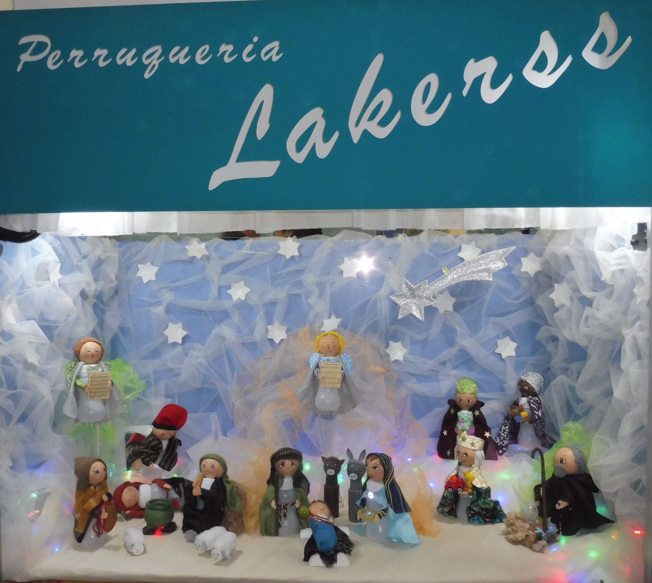 Cada any l’aparador d’aquest establiment, la perruqueria Lakerss, ens enamora. La seva propietària, que té una habilitat especial per les manualitats, ens sorprén amb una nova proposta. Munta el pessebre sempre fent servir material senzills i, sovint de reciclatge.