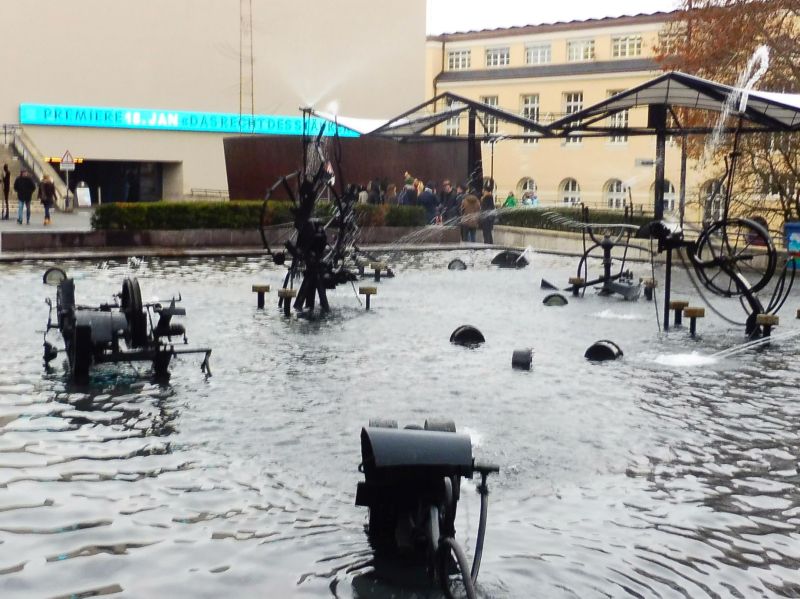Aquest conjunt d’artilugis que escupen aigua formen un espai molt curiós. Són el grup de, diríem fonts, més conegut de la ciutat. Aquí s’en veu només una part i, com que el dia s’anava posant rúfol, queda tot molt enfosquit.