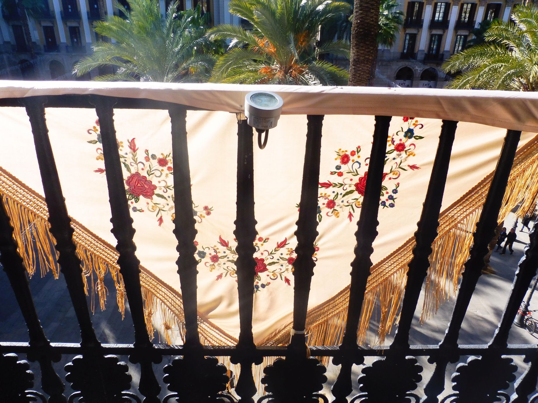 Les treballades baranes de ferro forjat es repeteixen en cadascun d’aquests set balcons oberts a la plaça.