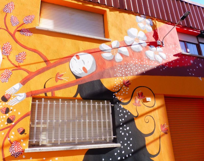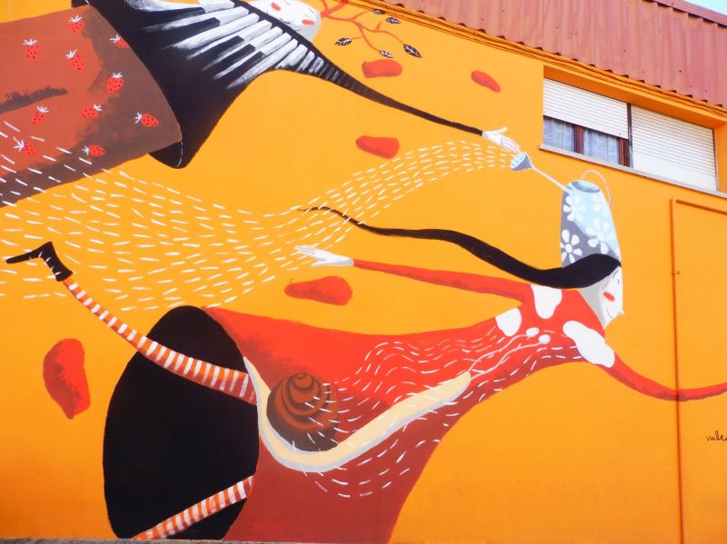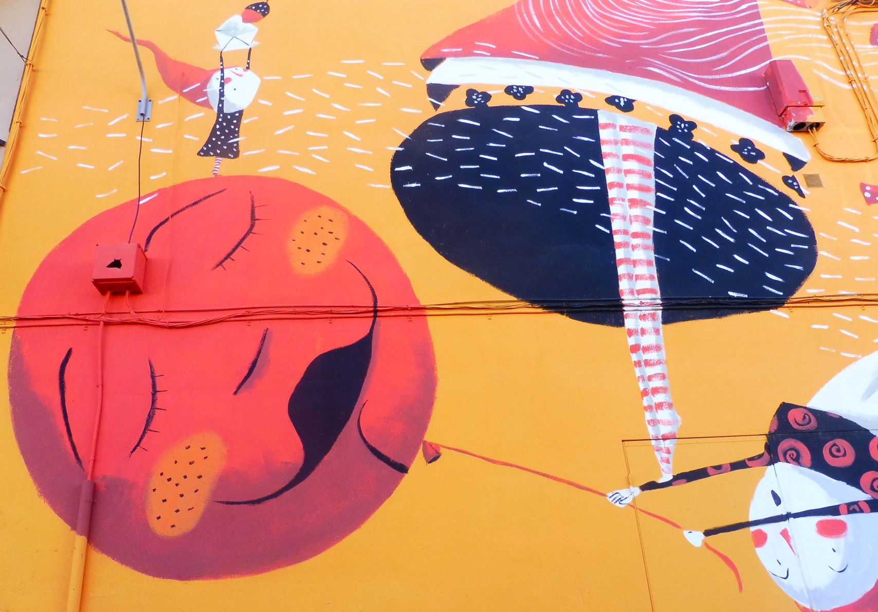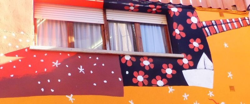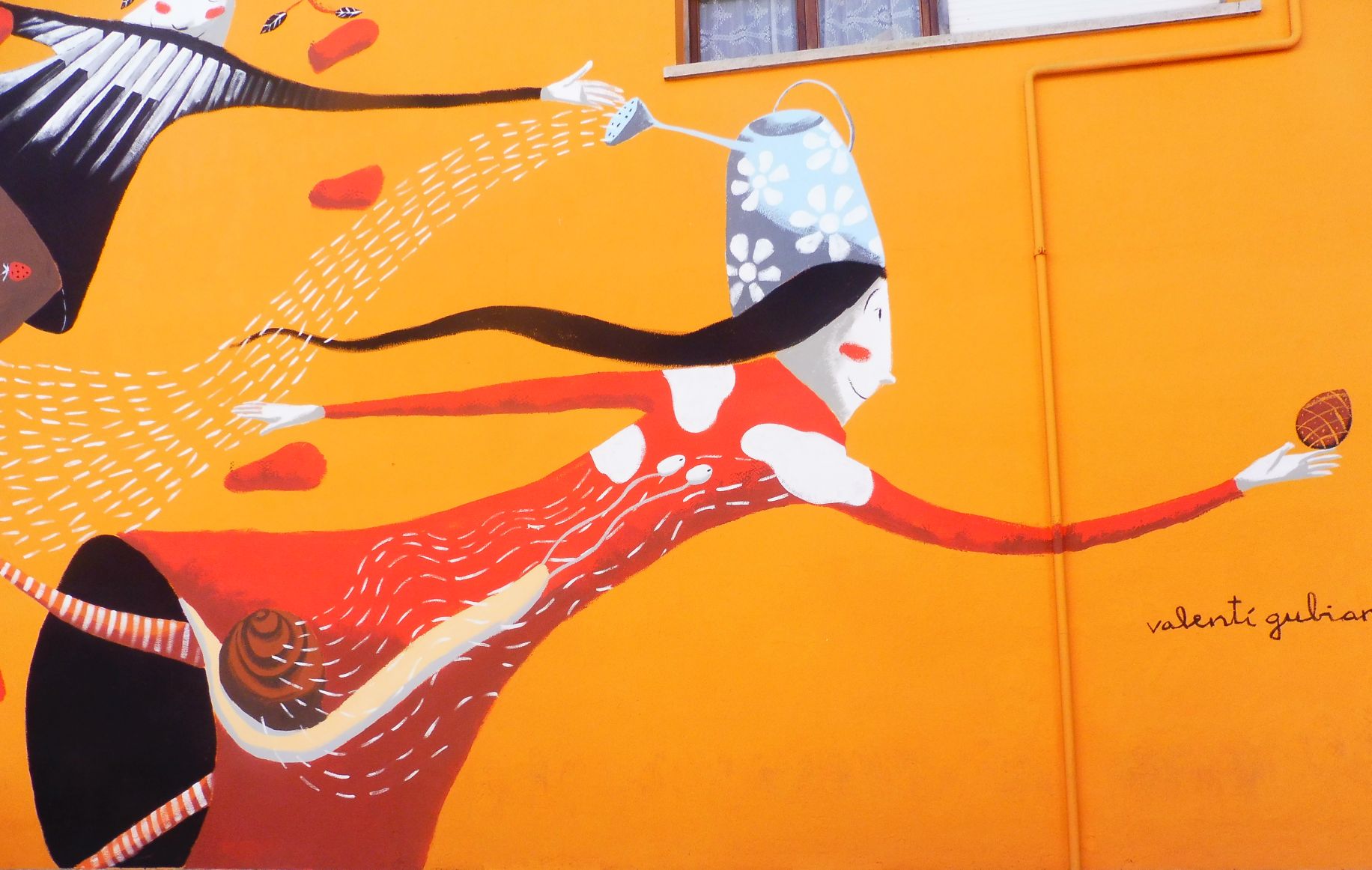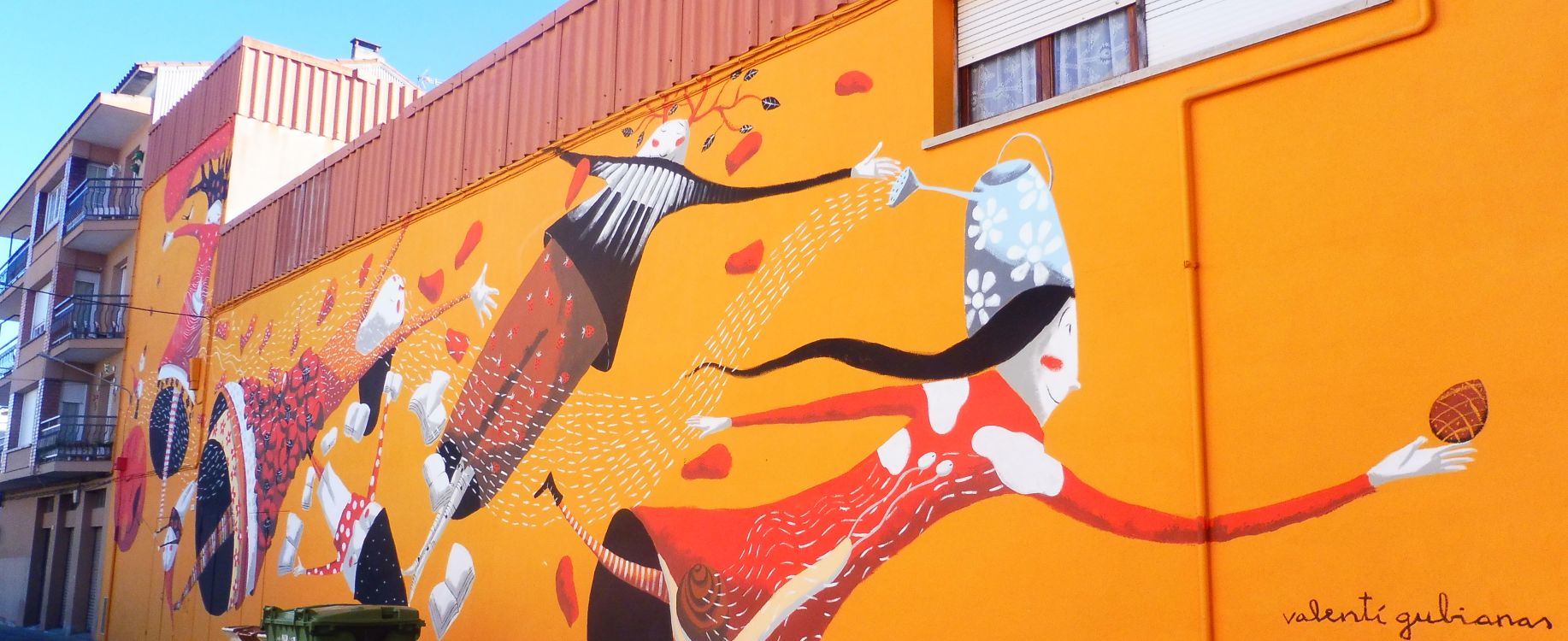 Quan creues la cantonada i arribes a la façana lateral, la sorpresa és majúscula. Un gran tram de paret, en aquest cas sense obertures, serveix de base pel bonic i atractiu mural que hi ha fet l’il·lustrador de Valentí Gubianas. Demostra amb el seu treball tenir un domini del color, una gràcia en les propostes i una sensibilitat exquisida en els detalls.