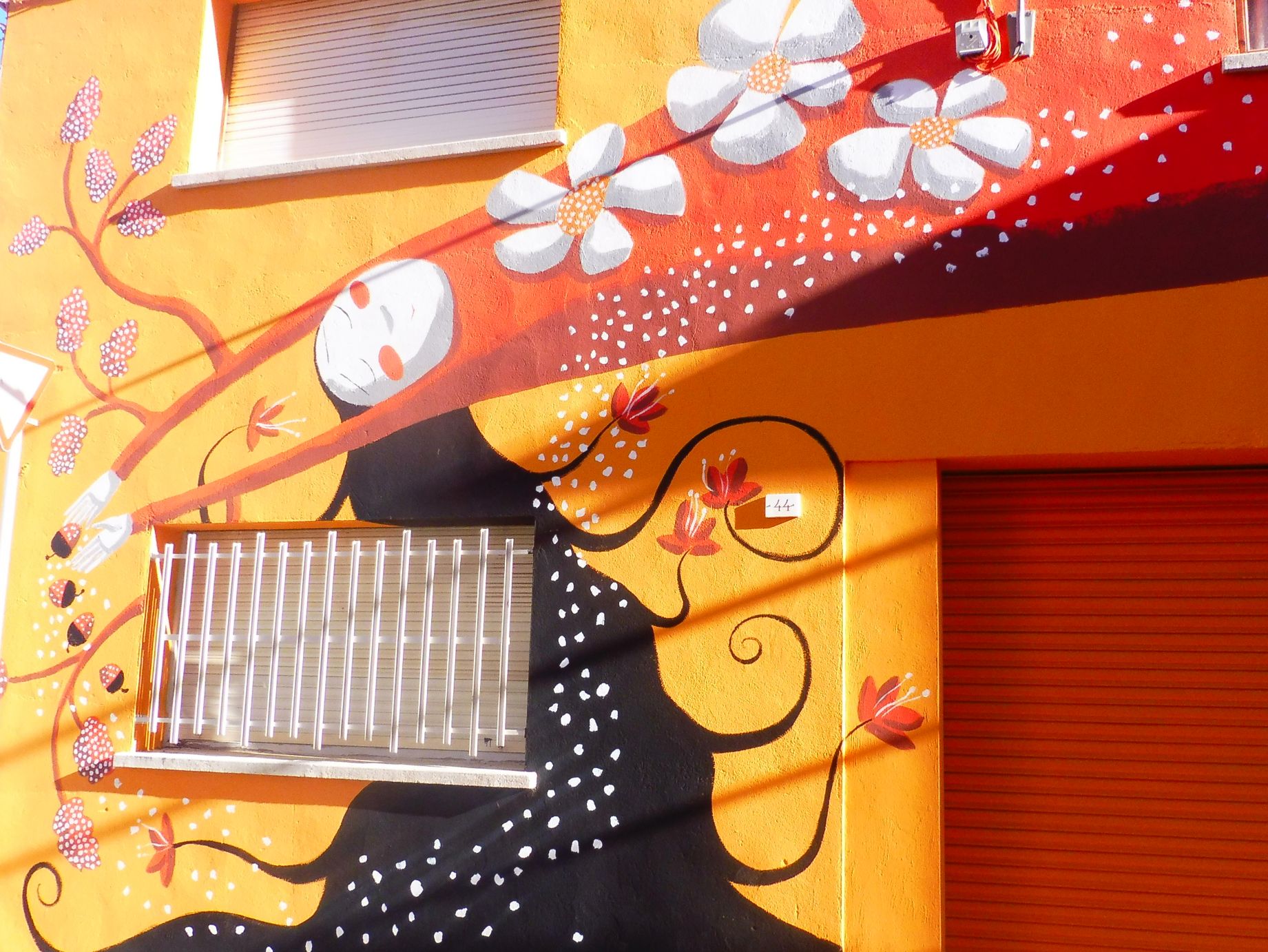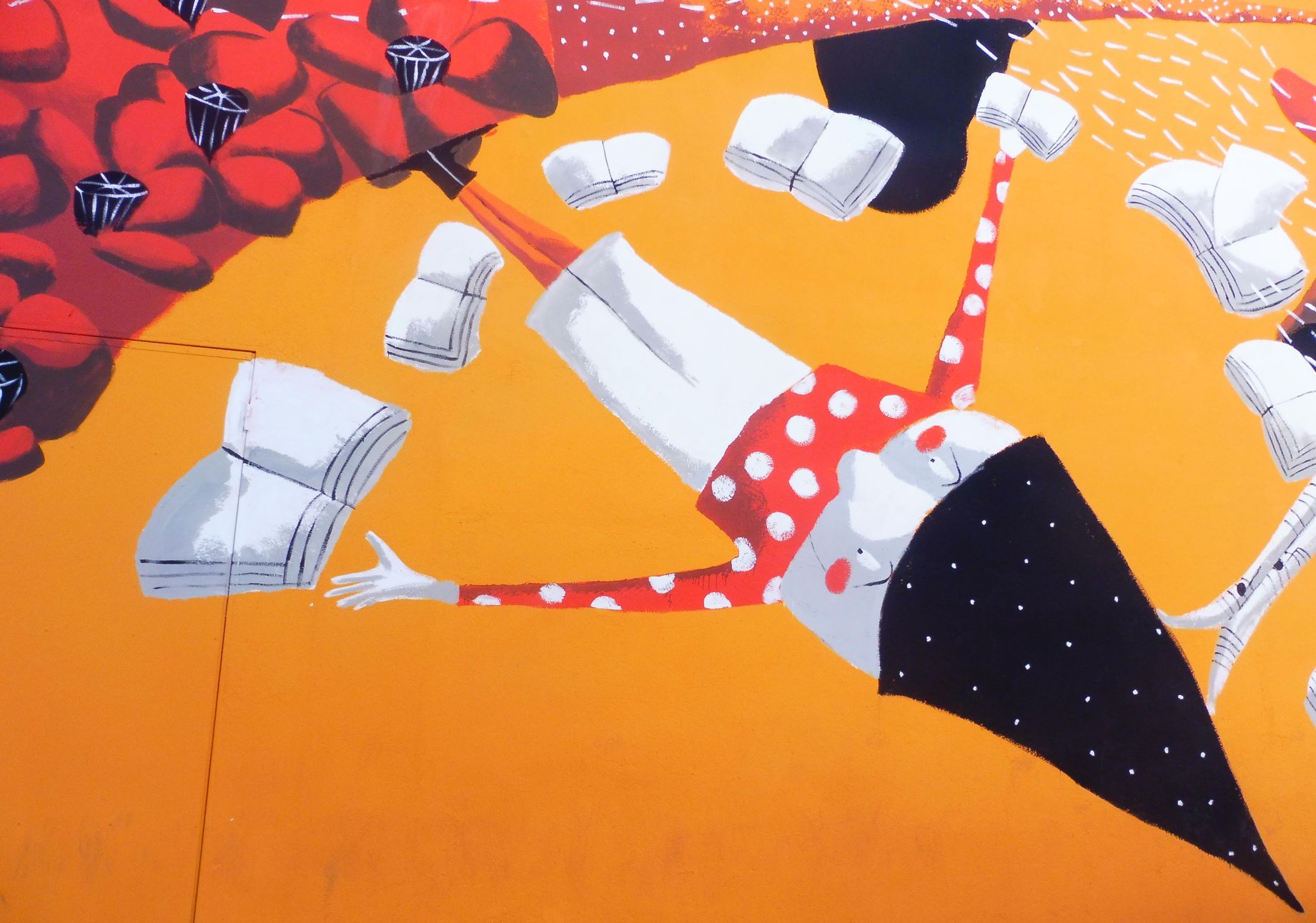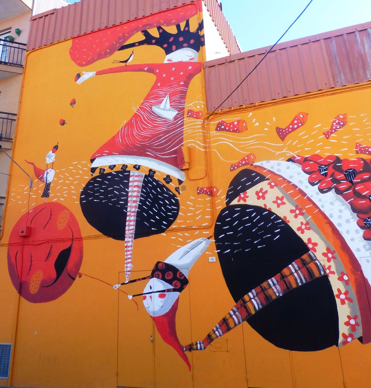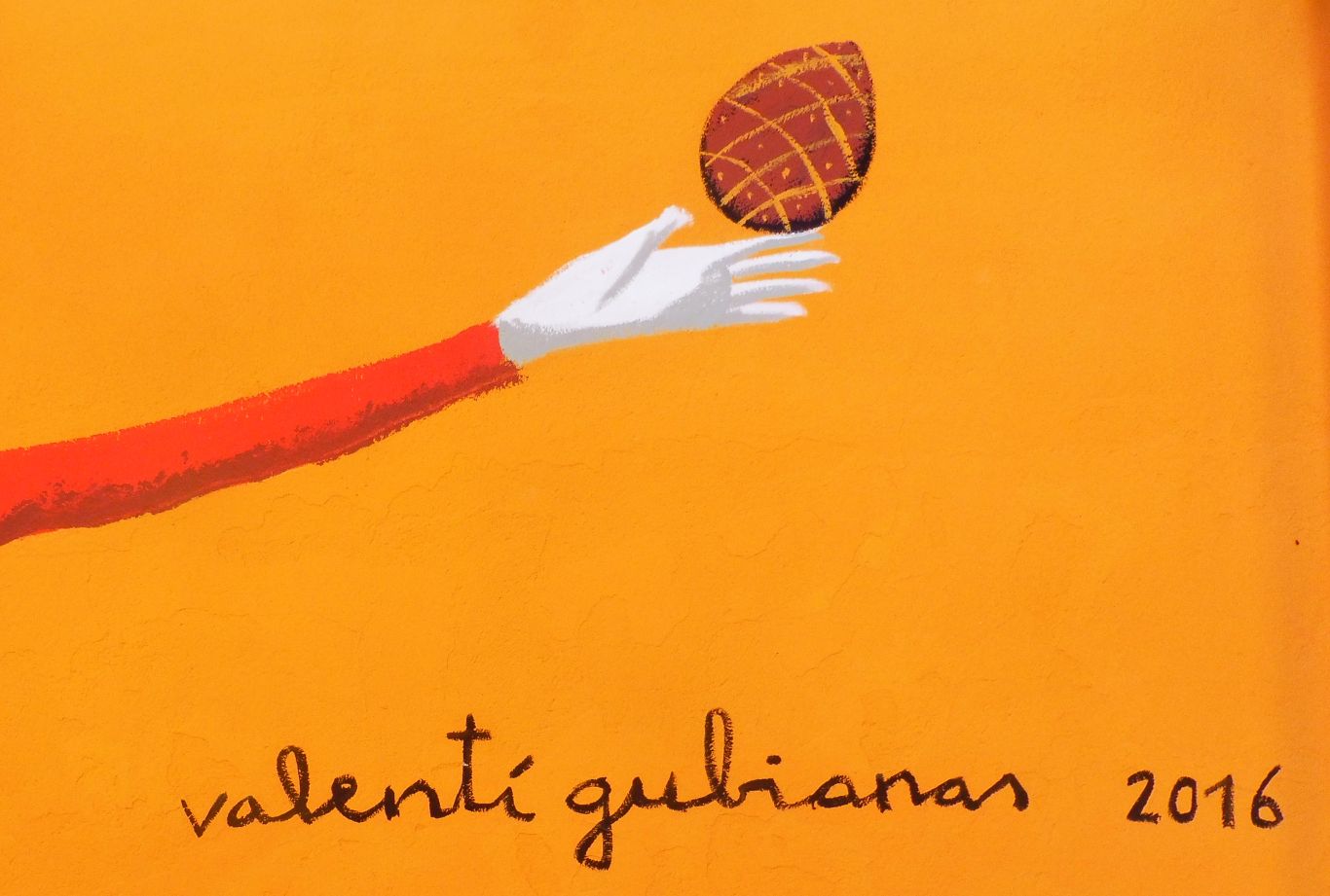 Quan creues la cantonada i arribes a la façana lateral, la sorpresa és majúscula. Un gran tram de paret, en aquest cas sense obertures, serveix de base pel bonic i atractiu mural que hi ha fet l’il·lustrador de Valentí Gubianas. Demostra amb el seu treball tenir un domini del color, una gràcia en les propostes i una sensibilitat exquisida en els detalls.