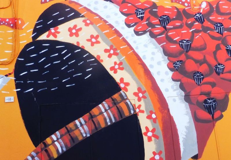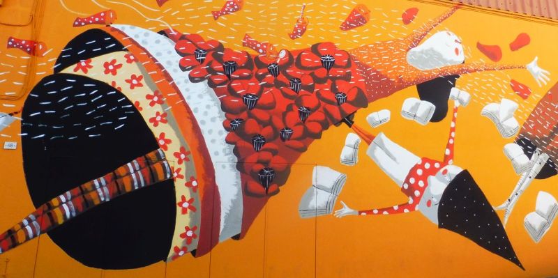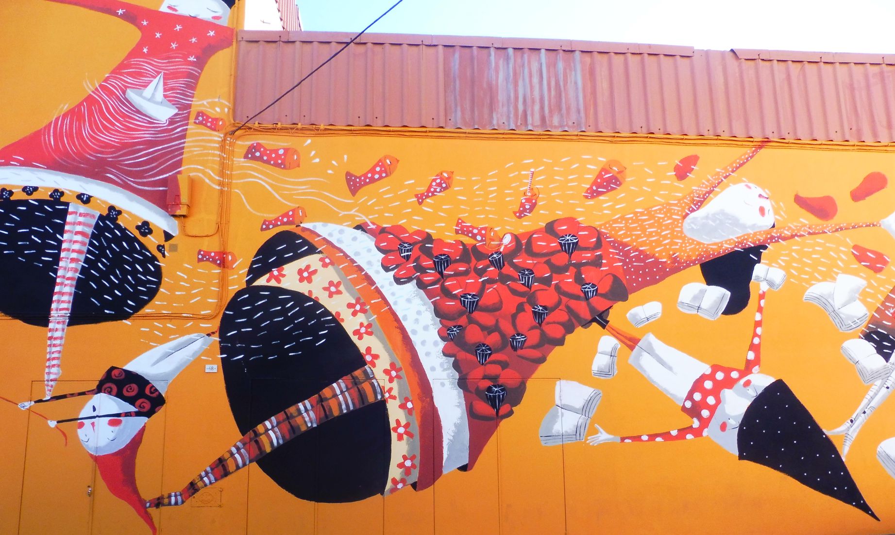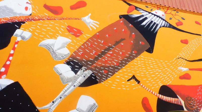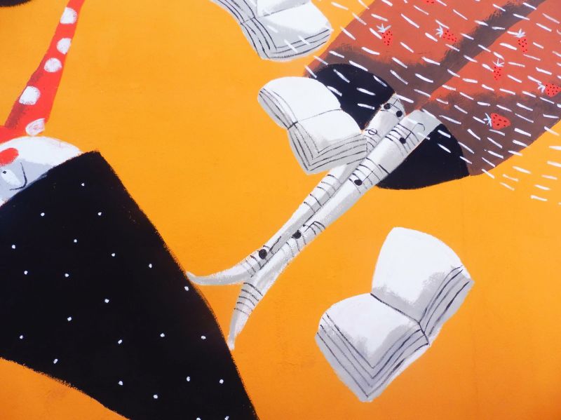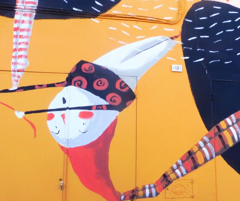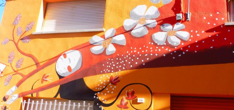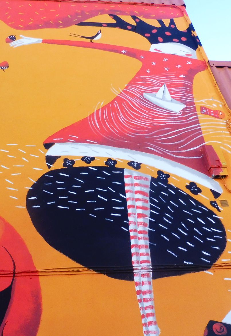 Quan creues la cantonada i arribes a la façana lateral, la sorpresa és majúscula. Un gran tram de paret, en aquest cas sense obertures, serveix de base pel bonic i atractiu mural que hi ha fet l’il·lustrador de Valentí Gubianas. Demostra amb el seu treball tenir un domini del color, una gràcia en les propostes i una sensibilitat exquisida en els detalls.