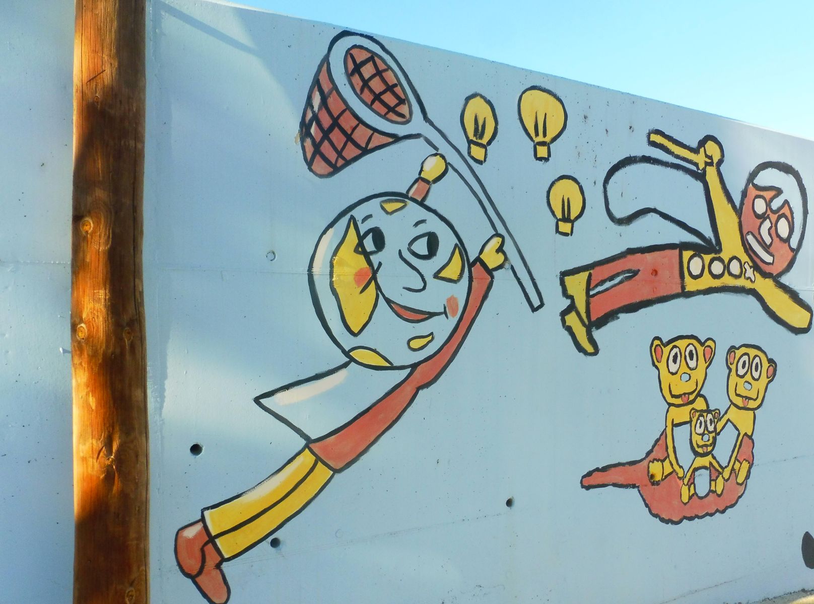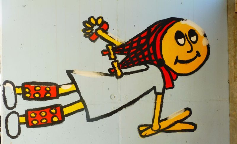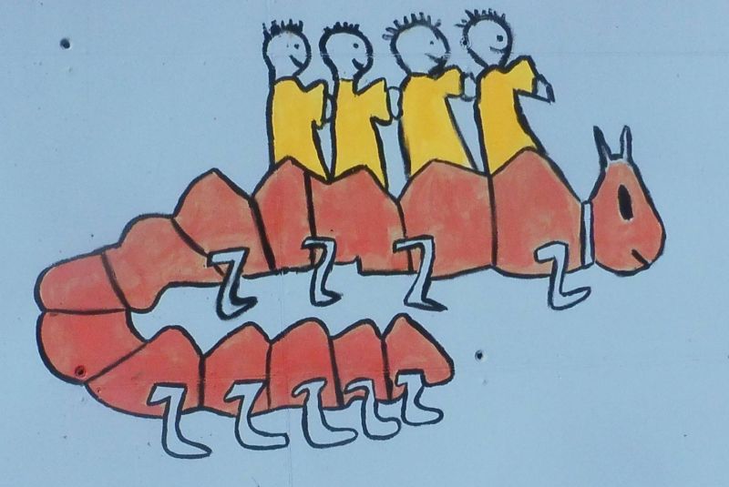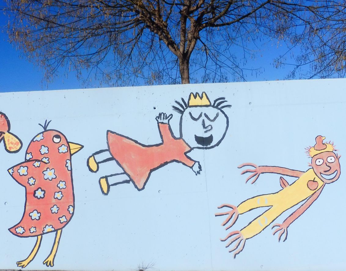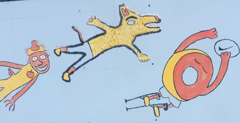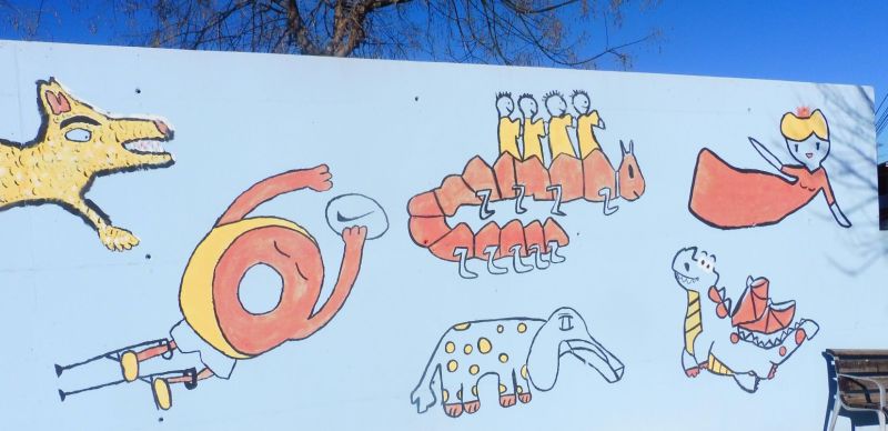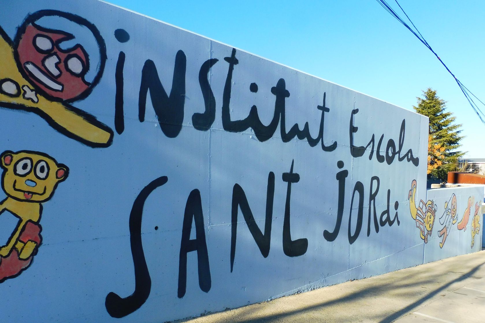 Com podreu veure aquí els dibuixos són molt diferents i no estan lligats. Cadascun d’ells es mostra d’una manera individual. Es tracta de l’embelliment fet damunt de les parets de l‘Institut Escola Sant Jordi.