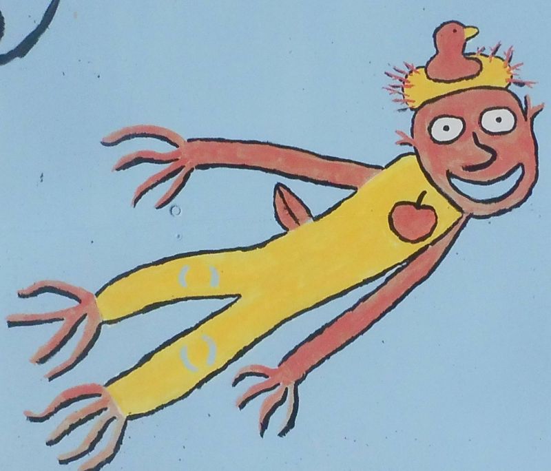 Altra volta humanitza un arbre, en aquest cas un pomer, en el que hi ha niuat un ocell al cap i porta una poma com a cor.
