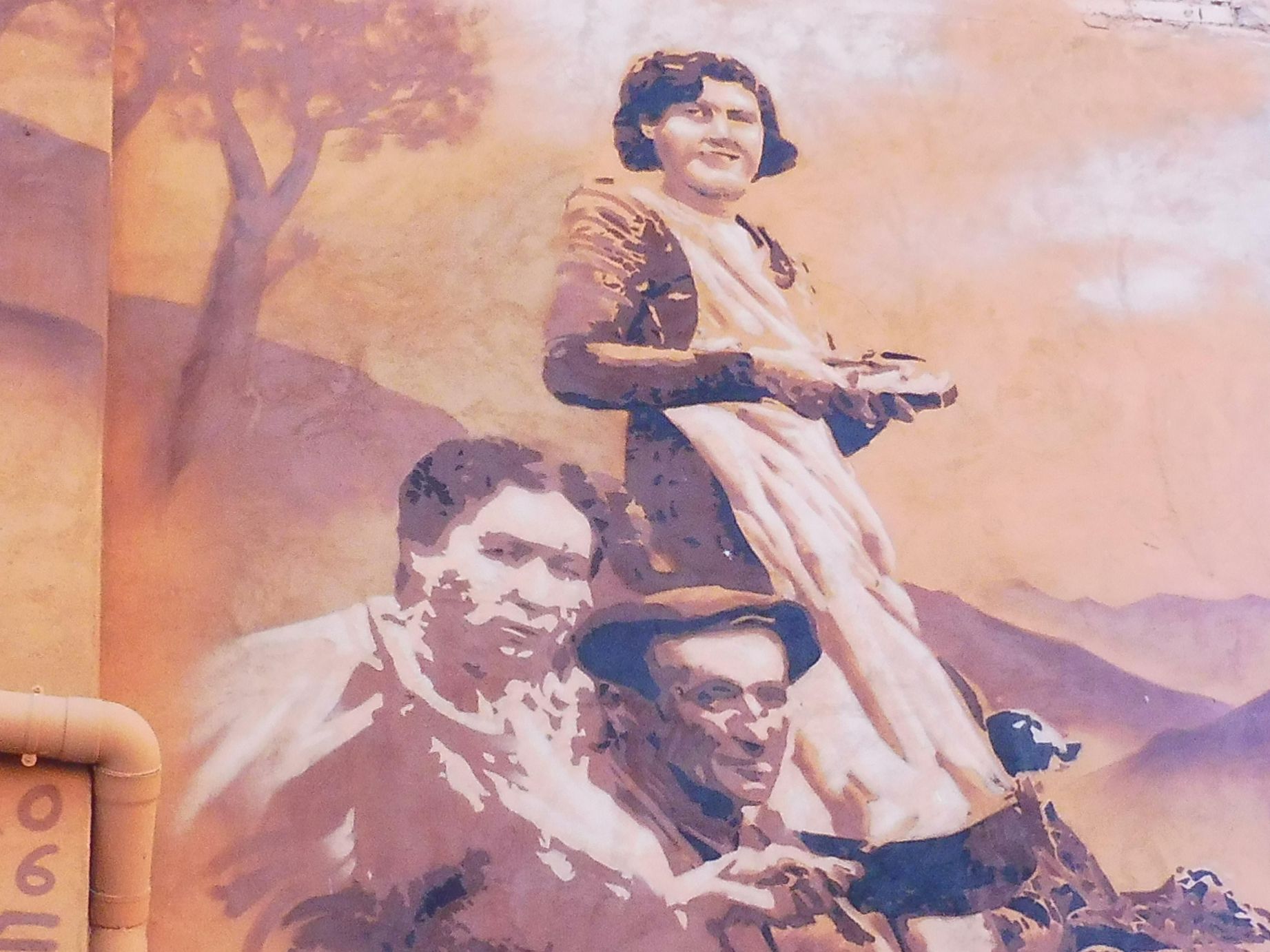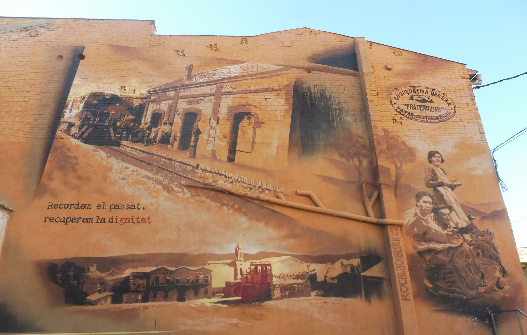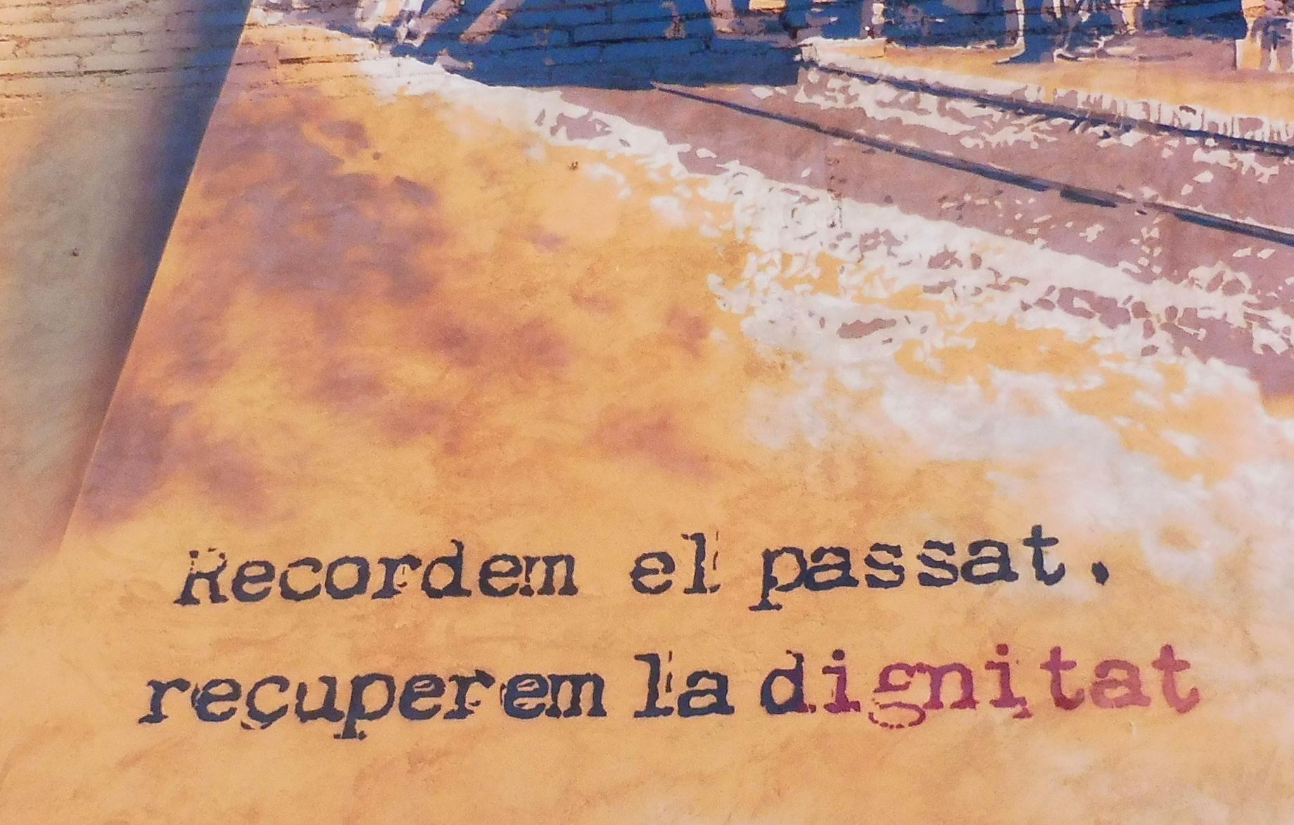 Un canvi d’estil total el d’aquest mural d’impacte. Tota la paret lateral d’un habitatge que dóna a una plaça ha quedat embellida per aquest magnífic treball del que desconec l’autor. Tot i recordant el passat, el missatge que vol donar és que, sense oblidar-lo, cal recuperar la dignitat.