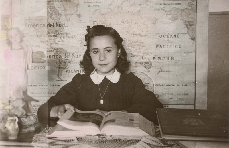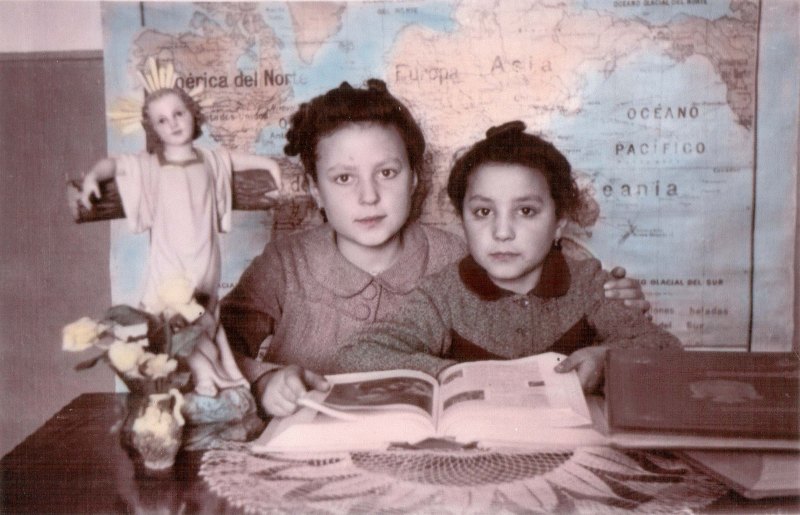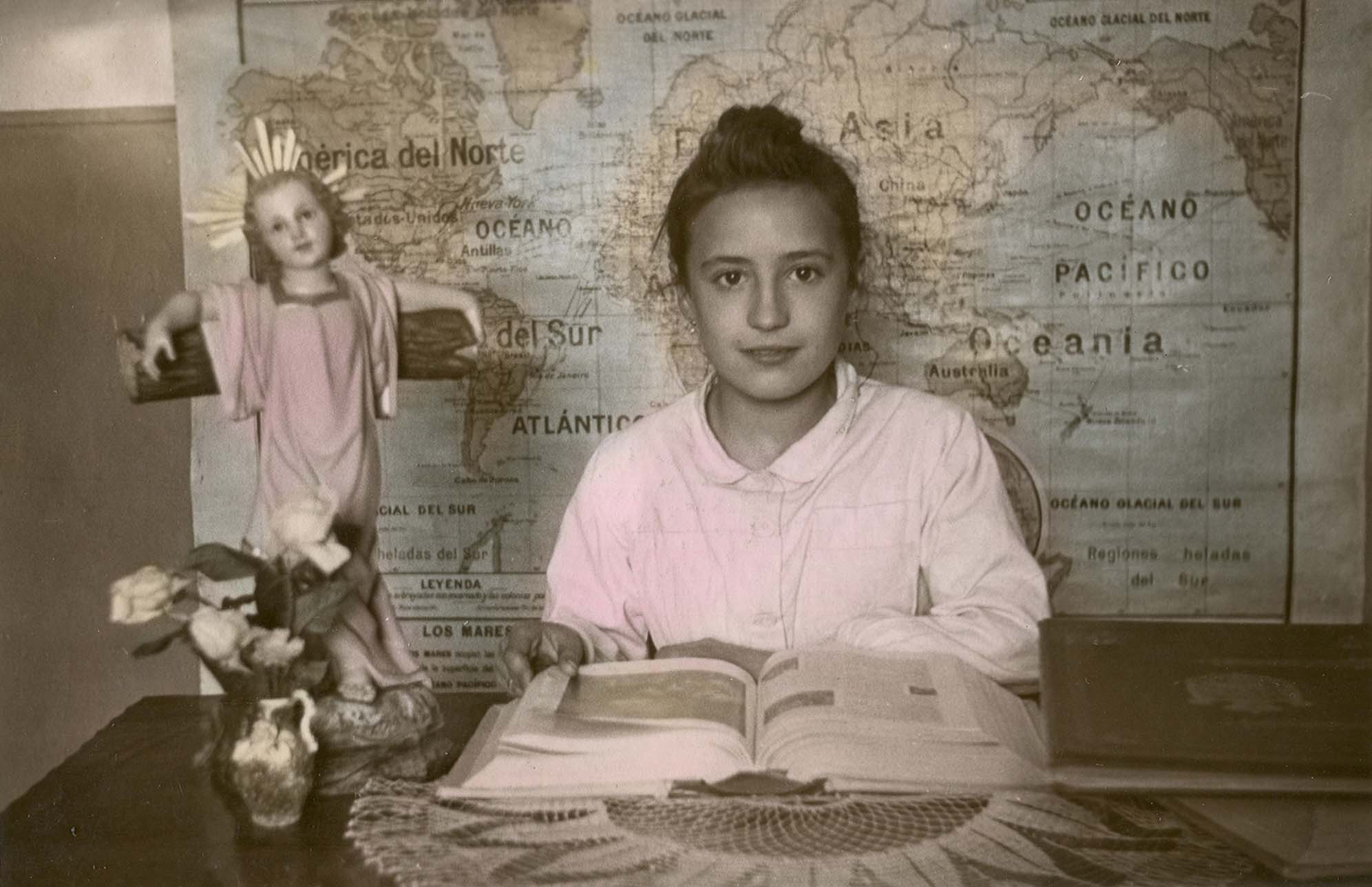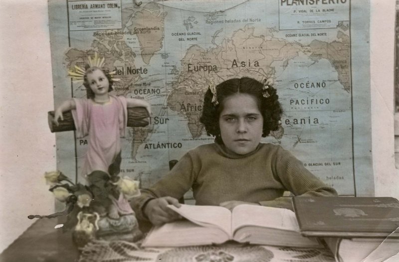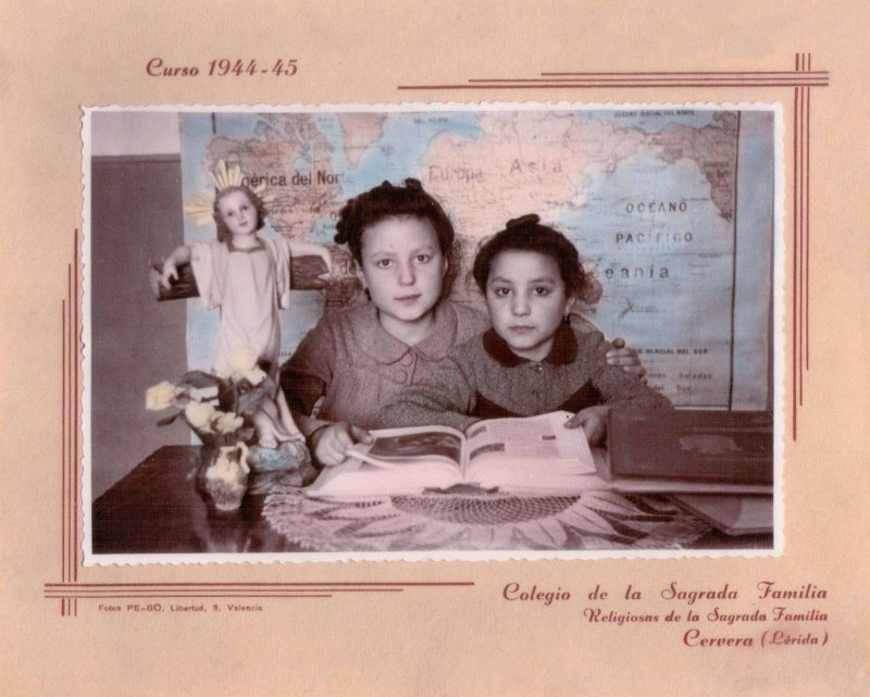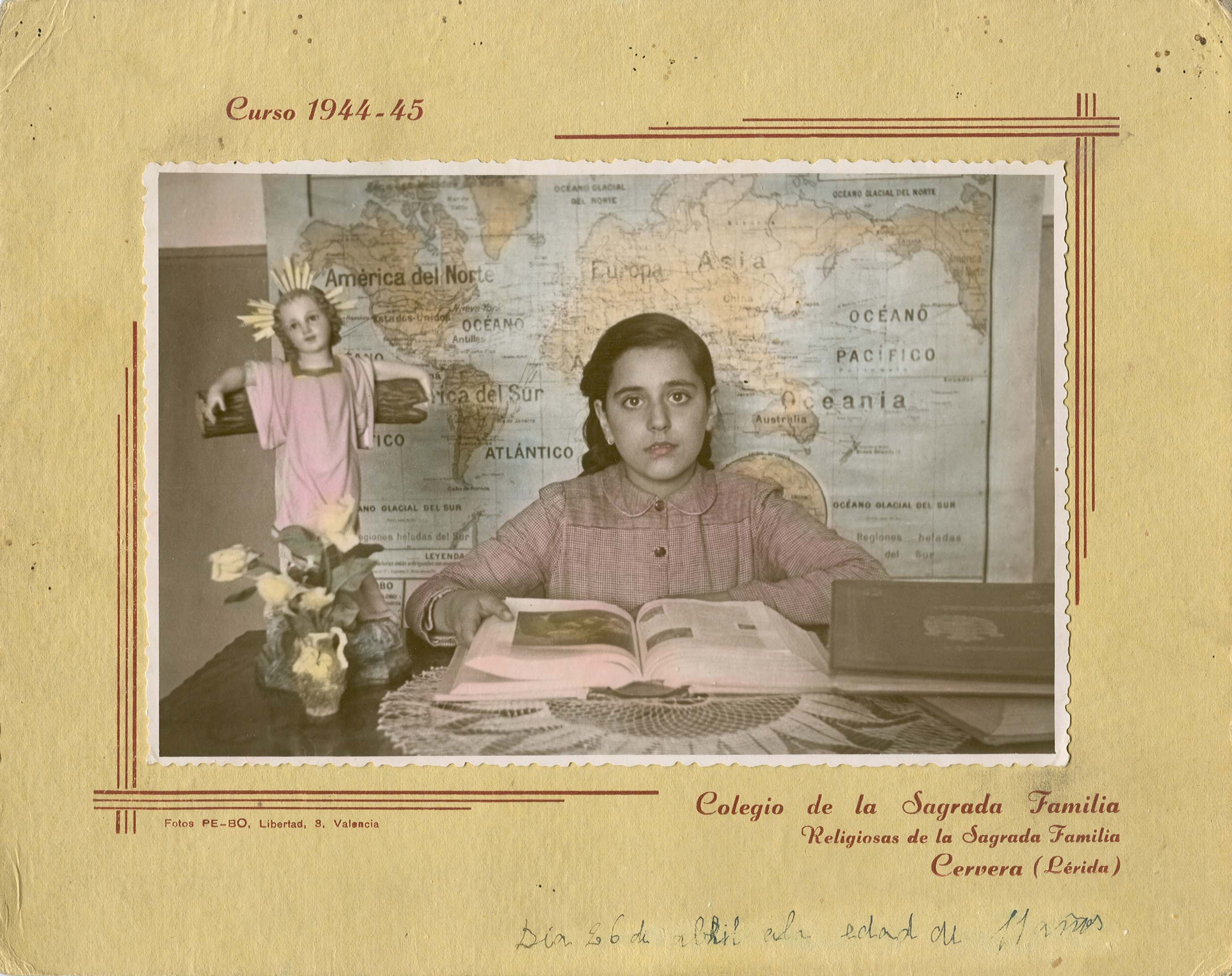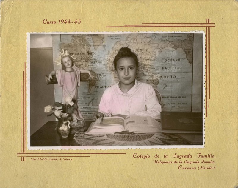 Curs 1944-45. Fotografies de record del col·legi d’algunes alumnes, amb el nen Jesús, i el mapa al fons.