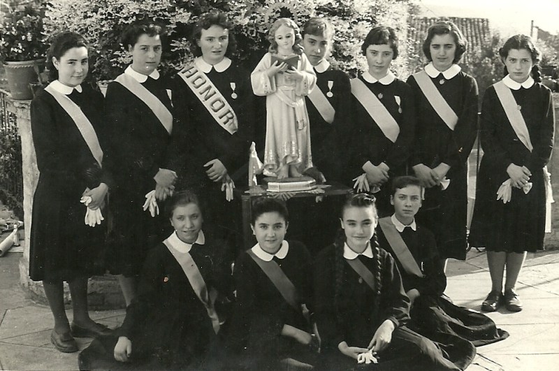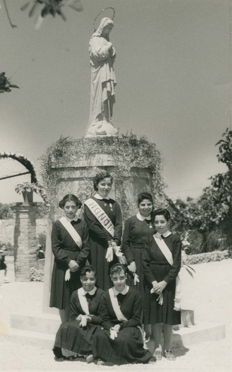 Bonica imatge amb un grup d‘alumnes amb bandes. Al mig es pot veure l’emblemàtica imatge de la Mare de Déu nena, aleshores dita “Virgen niña”.